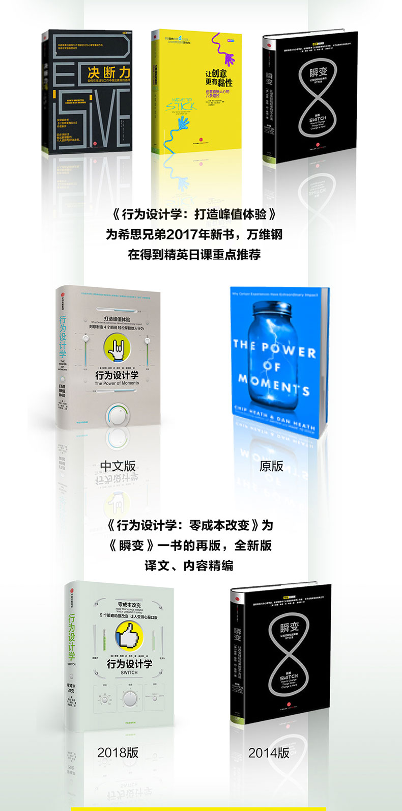 这是我读过的非常有趣、实用性非常强的书。书中带给我的新思路可以让我去激励员工,鼓舞消费者,和学生互动,甚用于家庭休假计划。如果生命是一系列时刻的组合,可以说希思兄弟改变了我的生活方式。