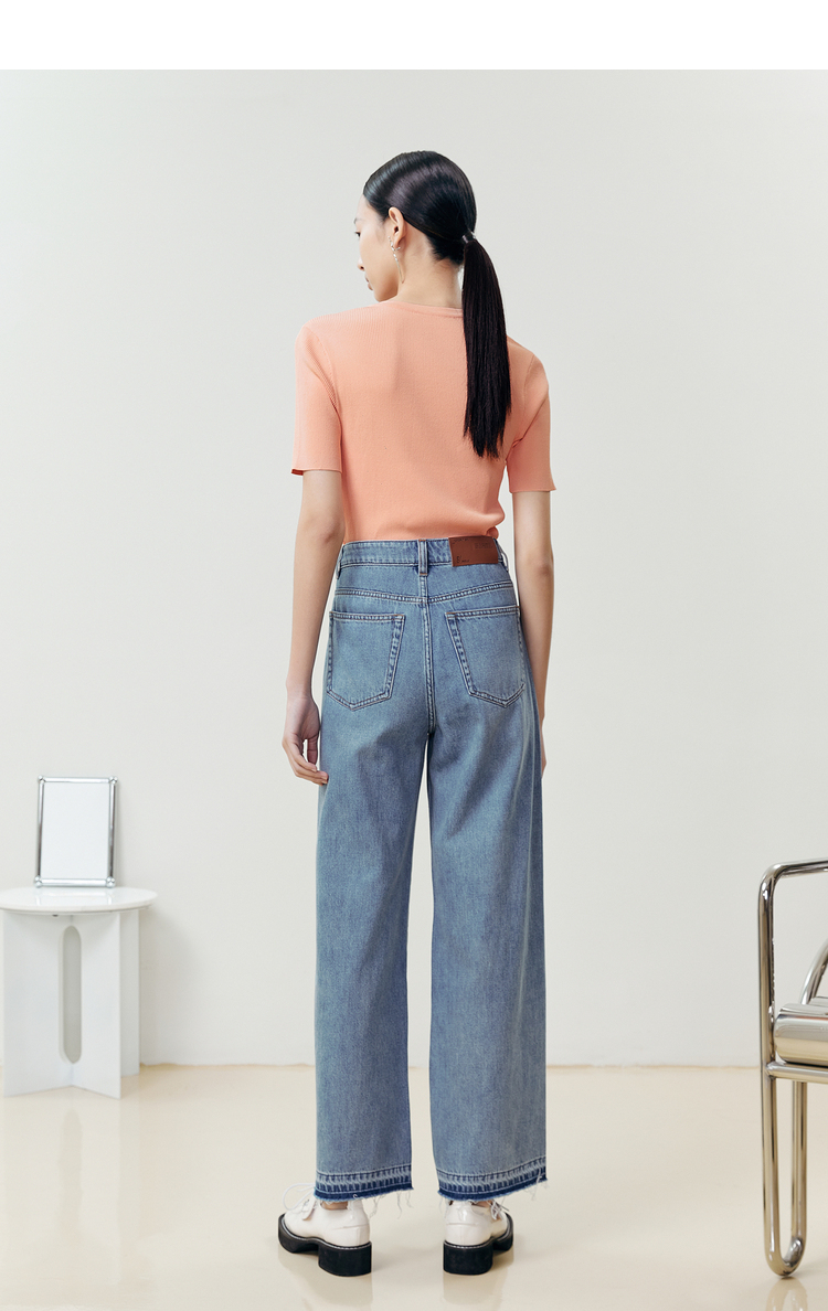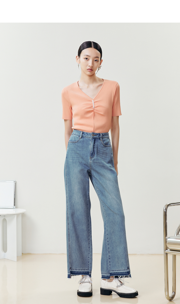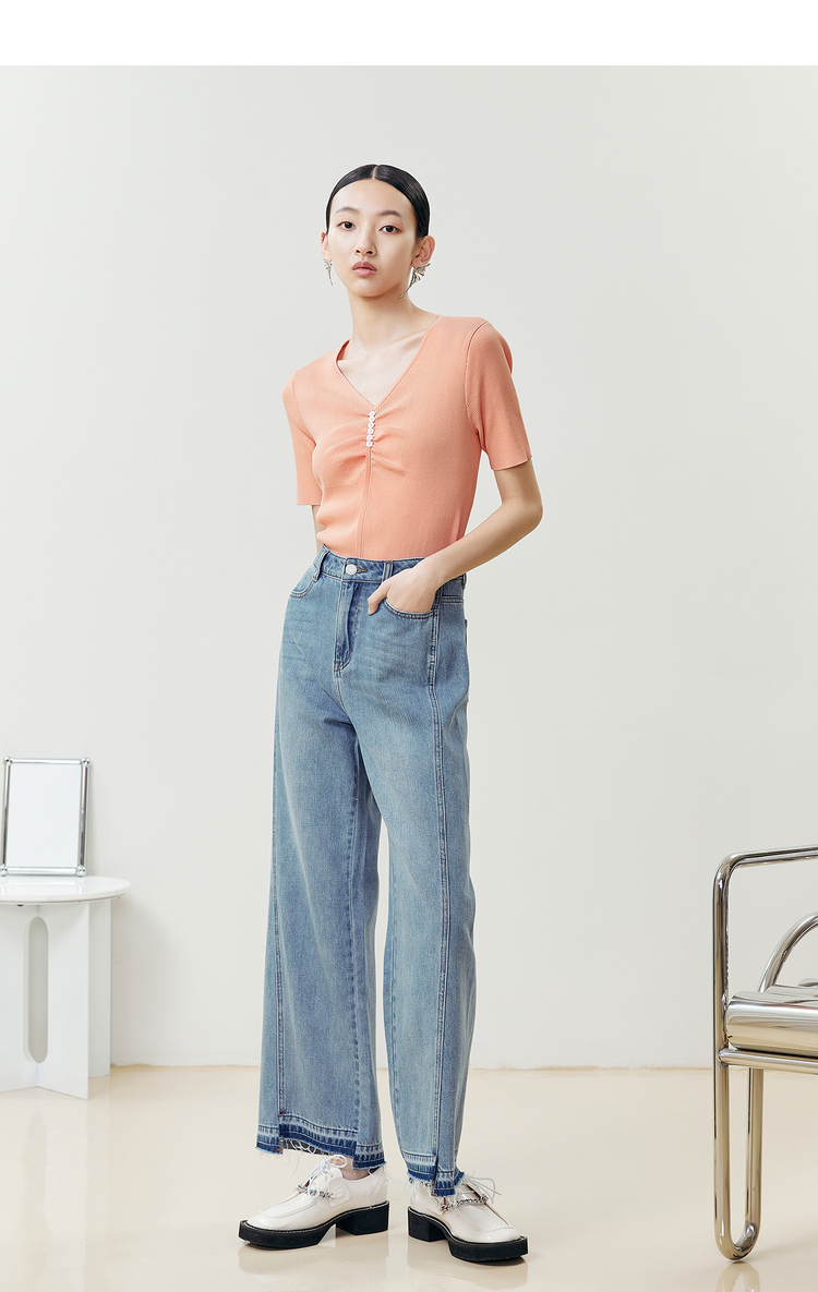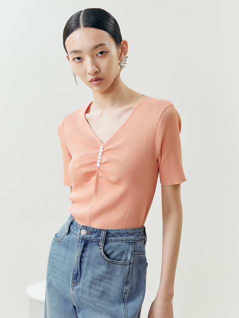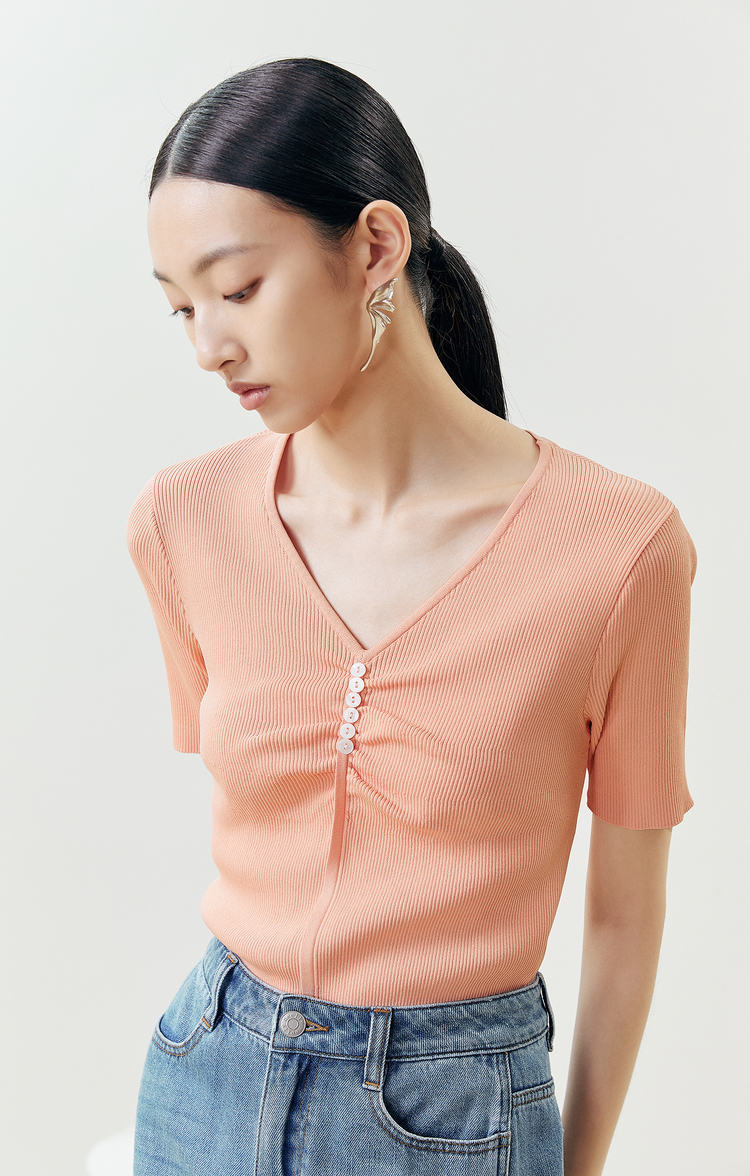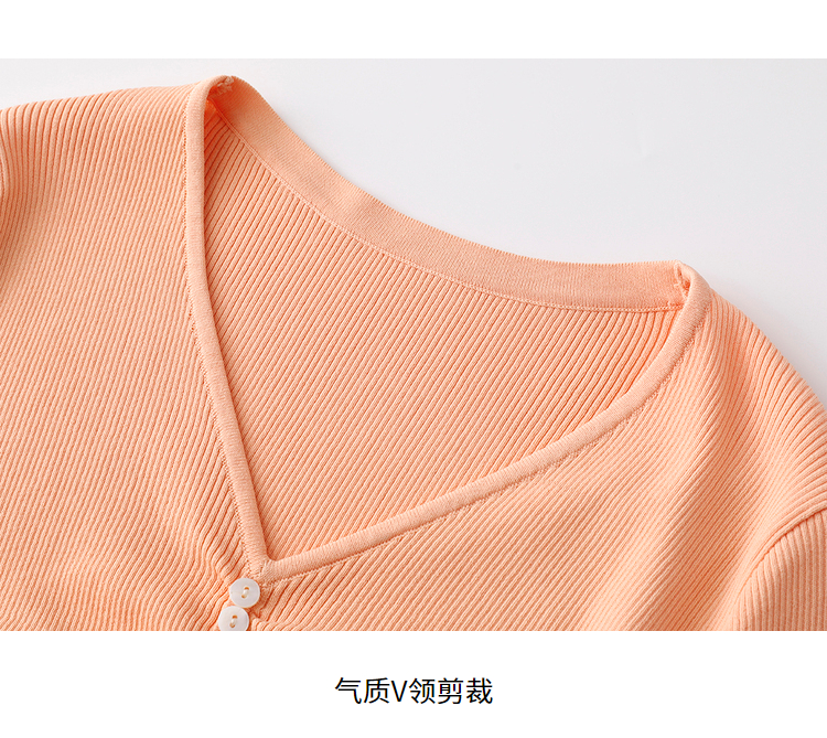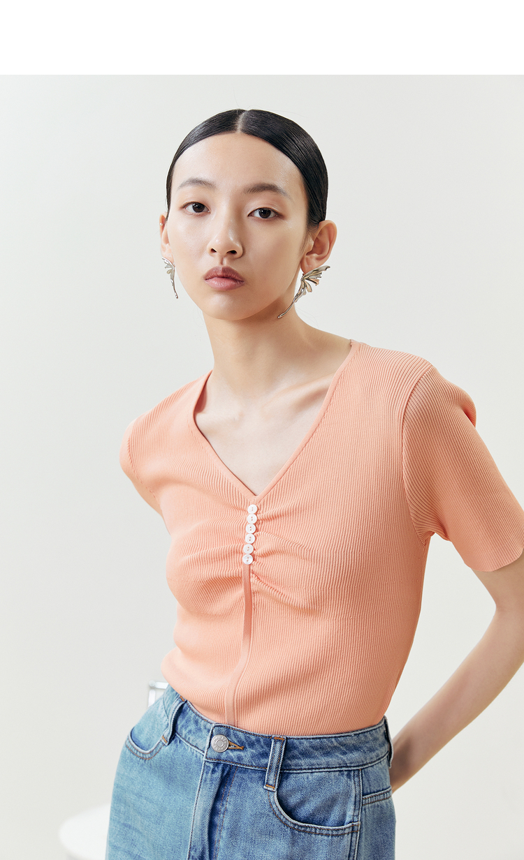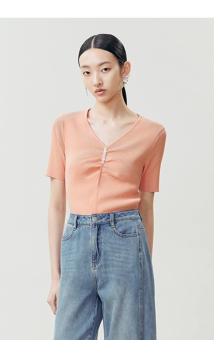 NEELLY纳俪商场同款短袖针织衫女薄款V领修身套头衫上衣2022夏季N22042A01034