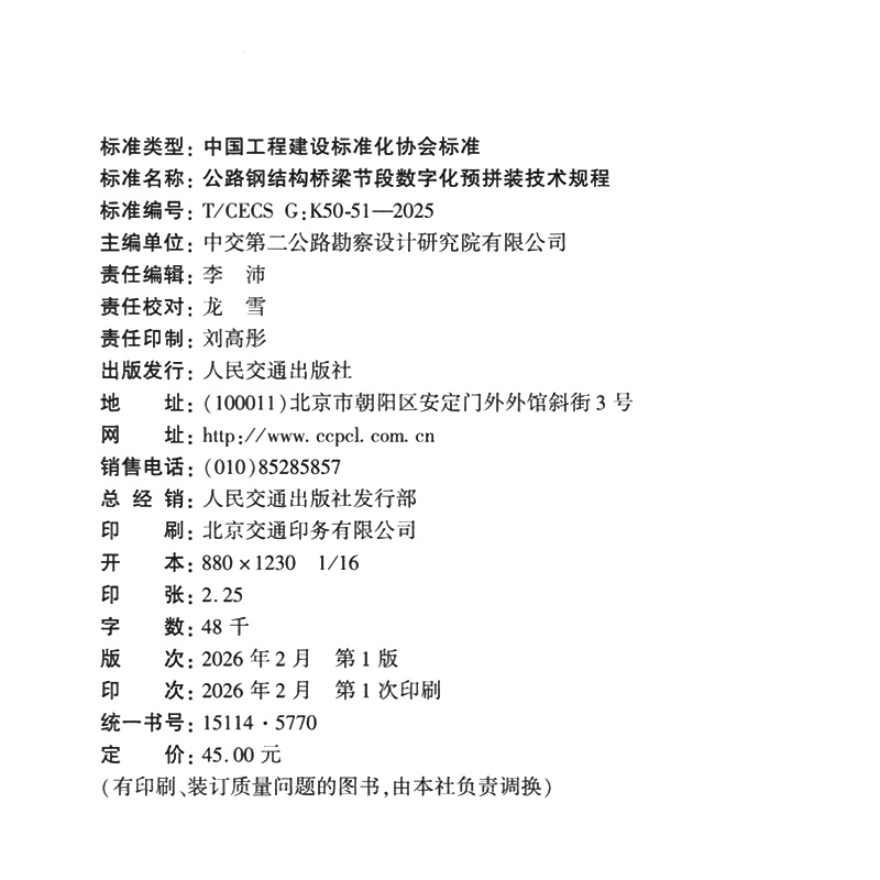 书名:公路钢结构桥梁节段数字化预拼装技术规程(T/CECS G:K50-51—2025)