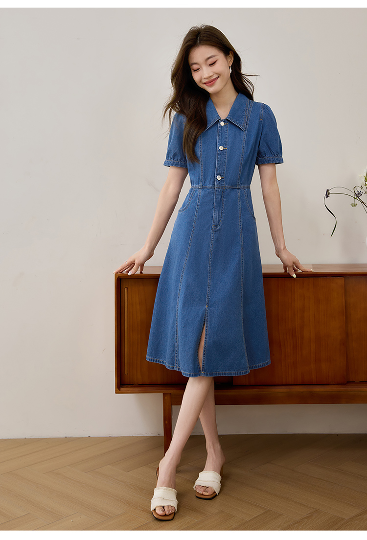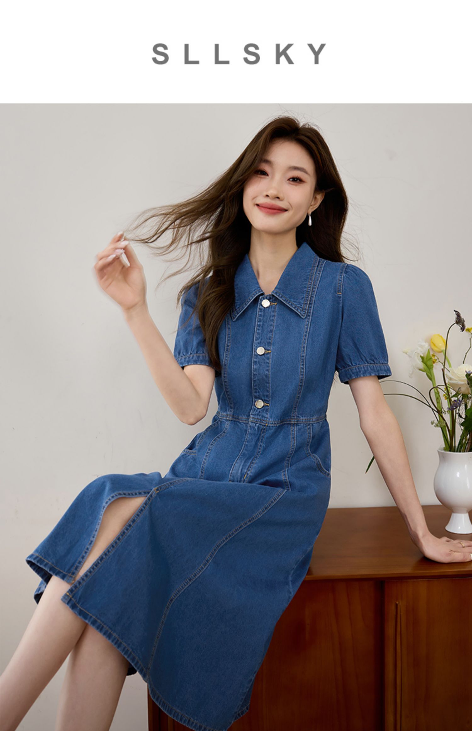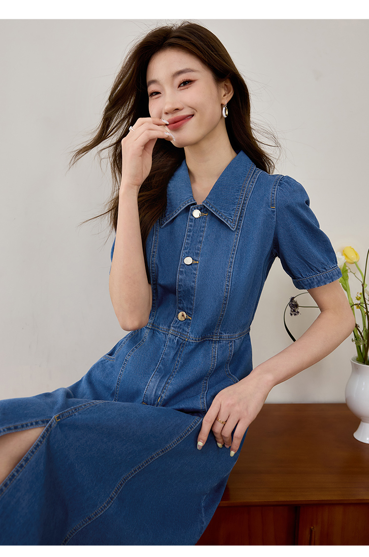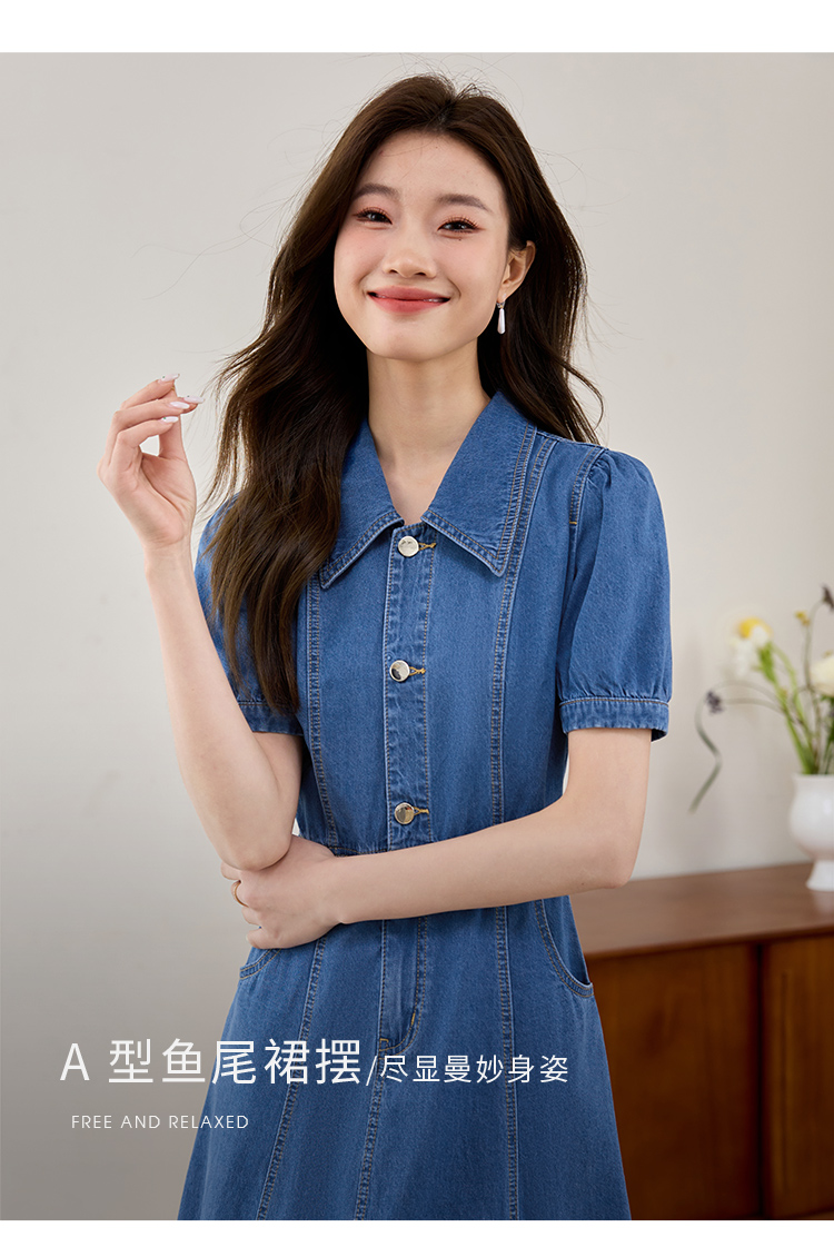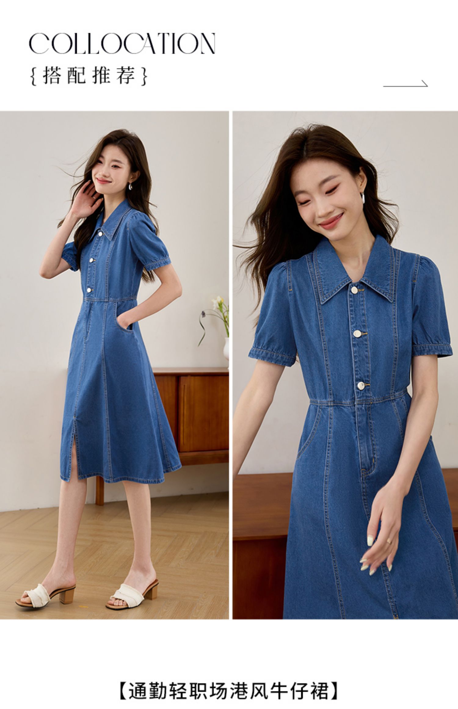 【专属特价】熙世界通勤职场港风牛仔连衣裙夏装新款泡泡袖法式鱼尾a字裙子