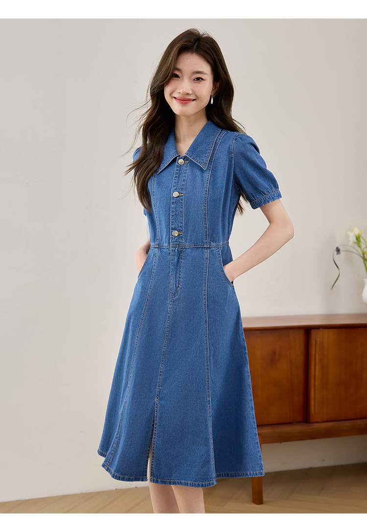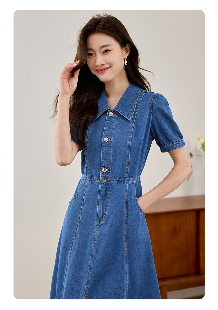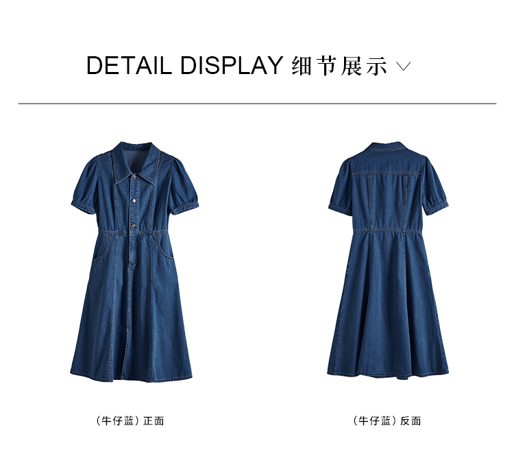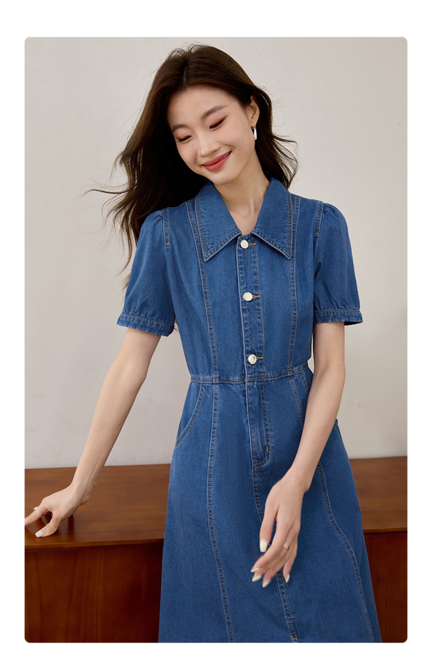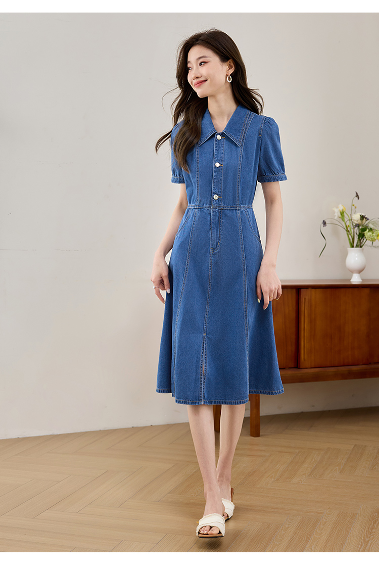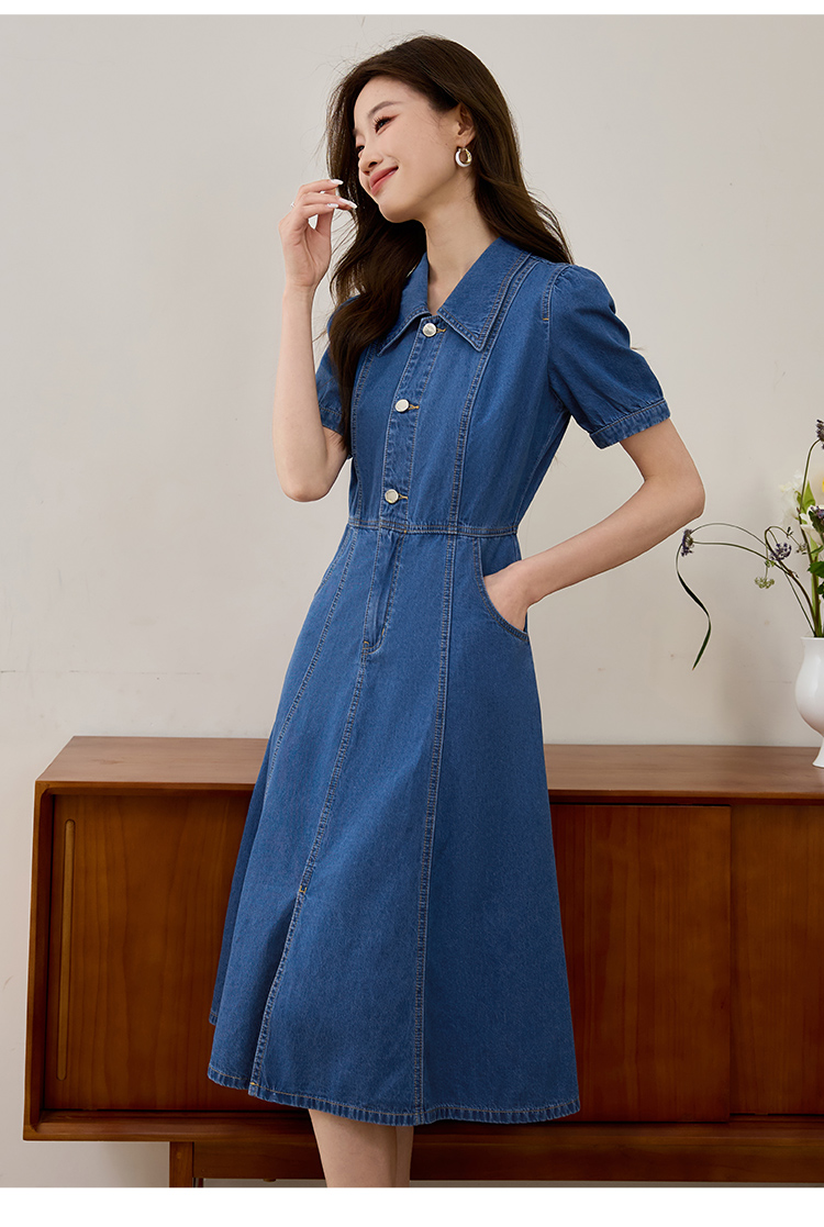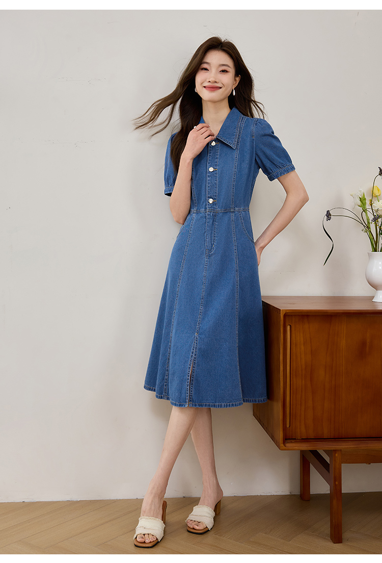 【专属特价】熙世界通勤职场港风牛仔连衣裙夏装新款泡泡袖法式鱼尾a字裙子