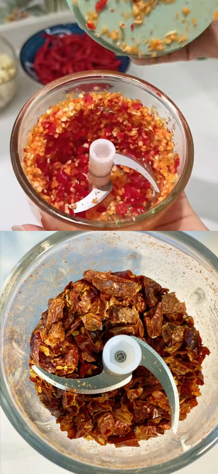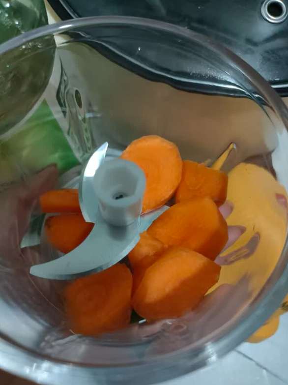 食材处理干净,放进捣蒜器。 盖上隔离盖,装上主机,摁下中间按键。大蒜、姜、辣椒,通通搅碎了 搅拌出来的比手剁的细腻多了~ 这款蒜蓉机堪称厨房 “贤内助”;一按即用,松手即停