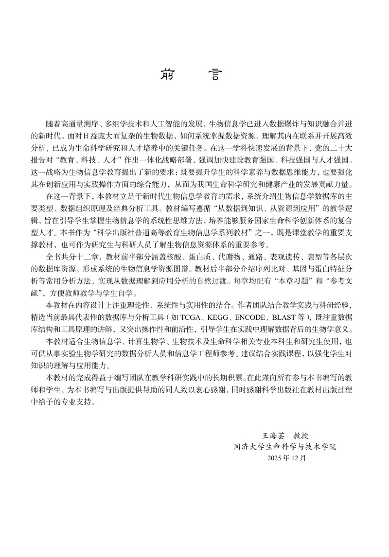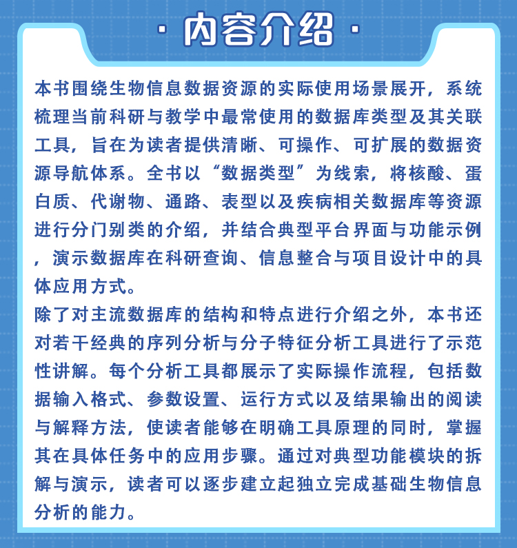 本书围绕生物信息数据资源的实际使用场景展开,系统梳理当前科研与教学中最常使用的数据库类型及其关联工具,旨在为读者提供清晰、可操作、可扩展的数据资源导航体系。全书以“数据类型”为线索,将核酸、蛋白质、代谢物、通路、表型以及疾病相关数据库等资源进行分门别类的介绍,并结合典型平台界面与功能示例,演示数据库在科研查询、信息整合与项目设计中的具体应用方式。