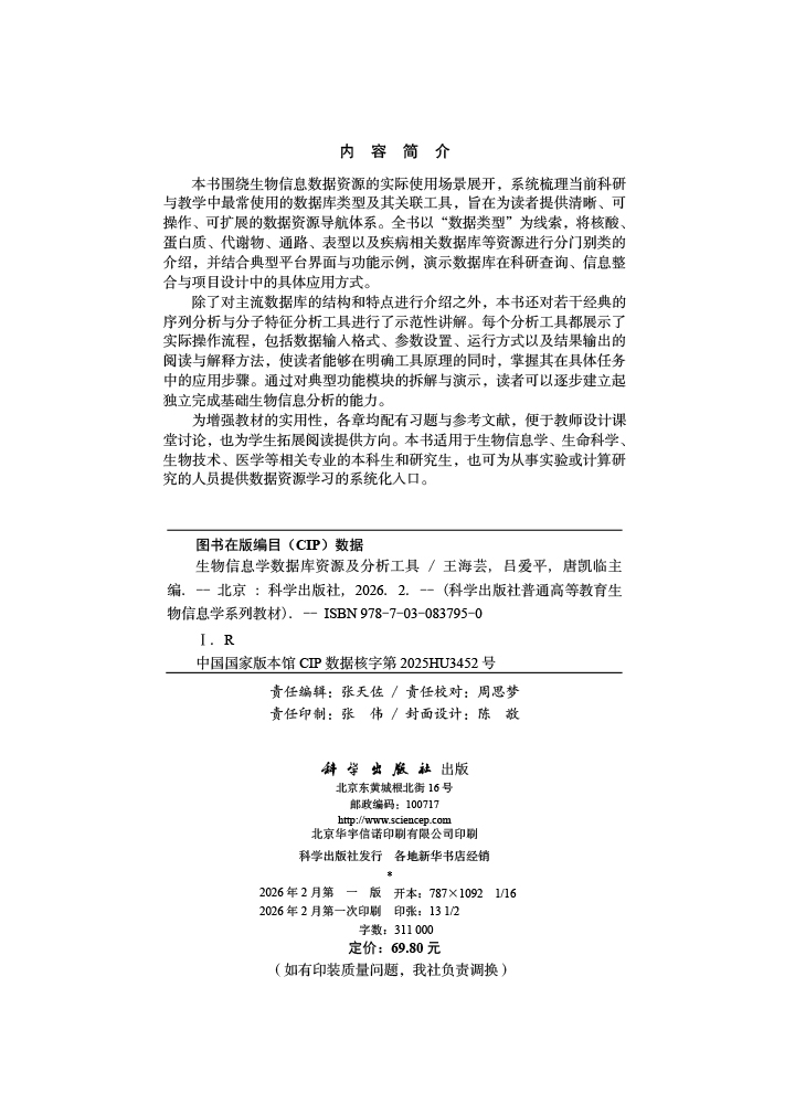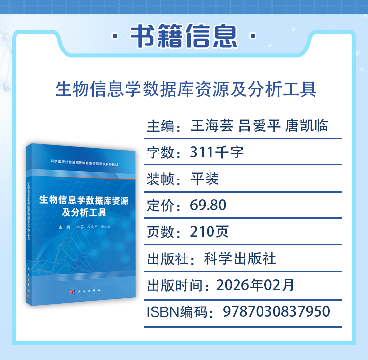 生物信息学数据库资源及分析工具 普通高等教育生物信息学系列教材 王海芸 吕爱平 唐凯临 基础医学专业 生物医学专业等科学出版社