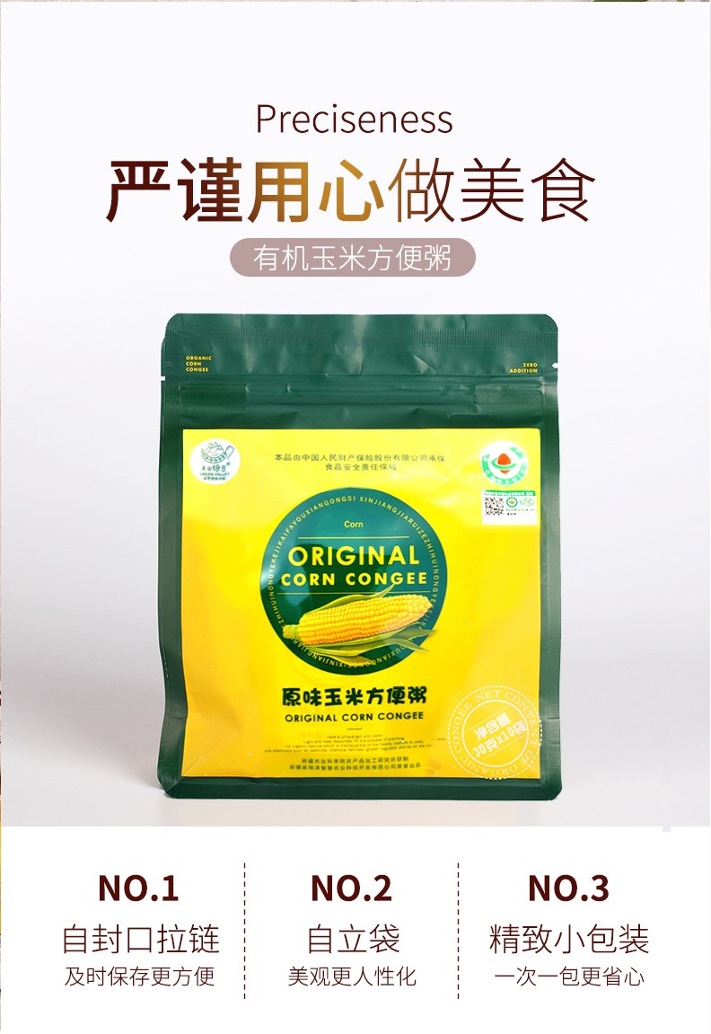 玉米方便粥,有机原苞米,历经十年从土壤改良,施肥、育种、种植、病虫害防治、田间管理、生产加工等工艺,不急于求成,严把原料质量关,新工厂全线开始投产。