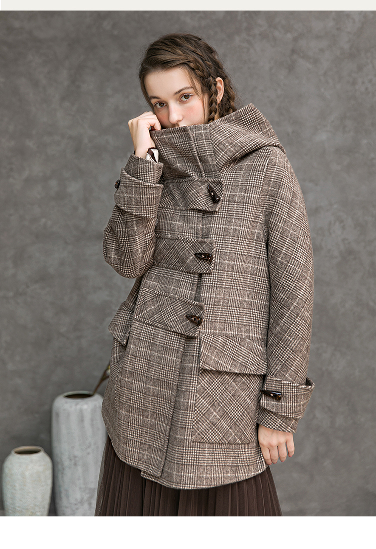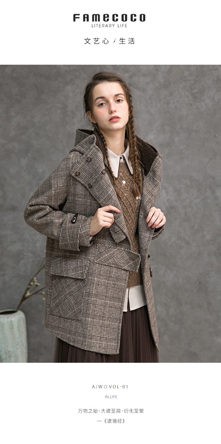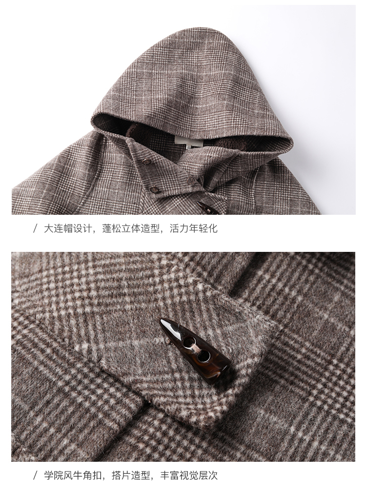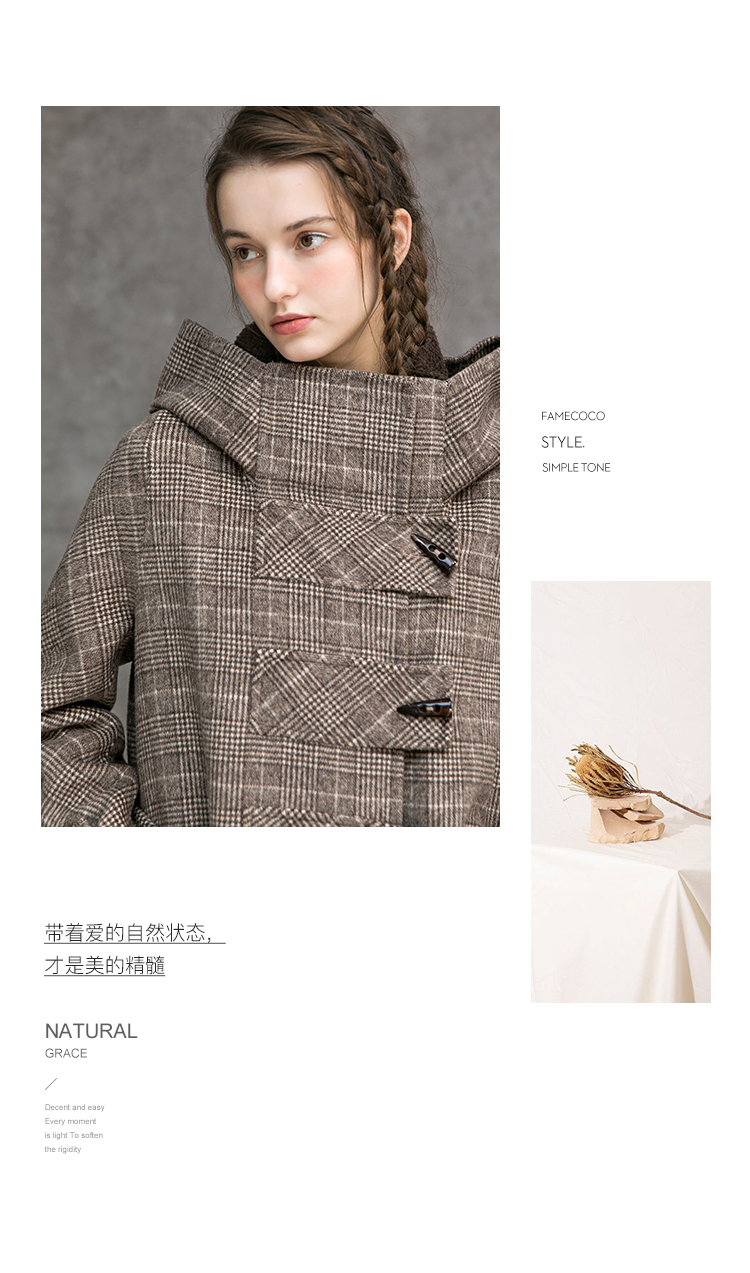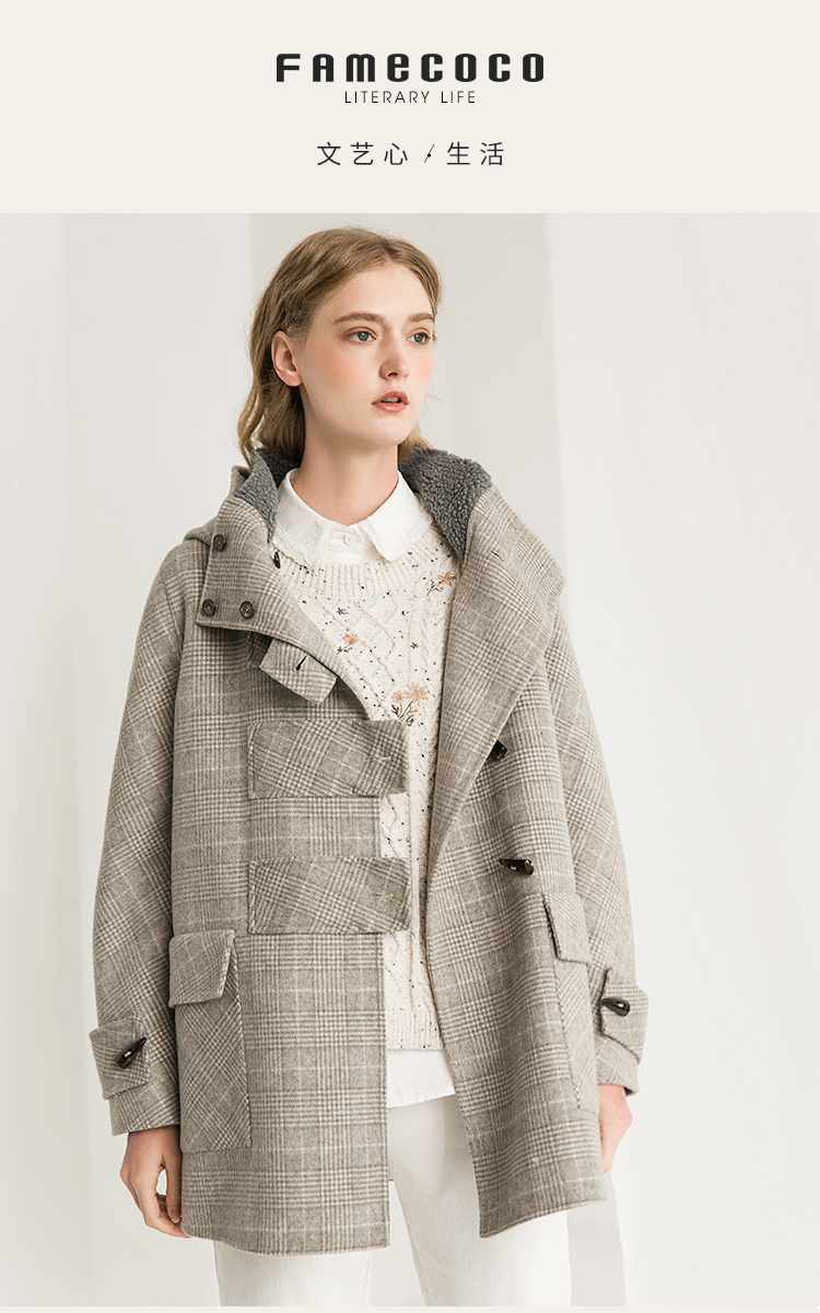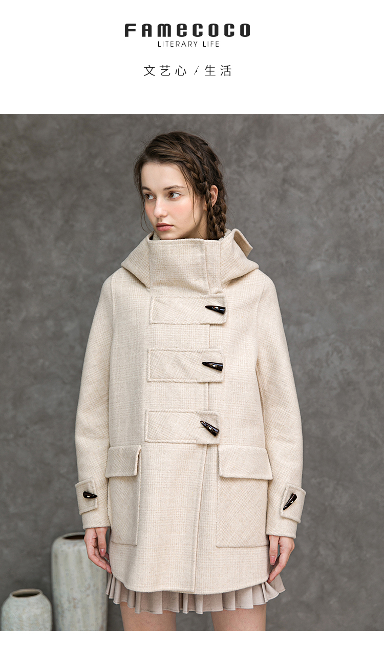 Famecoco范可儿羊毛大衣冬季牛角扣中长款连帽格纹毛呢外套F218AR006