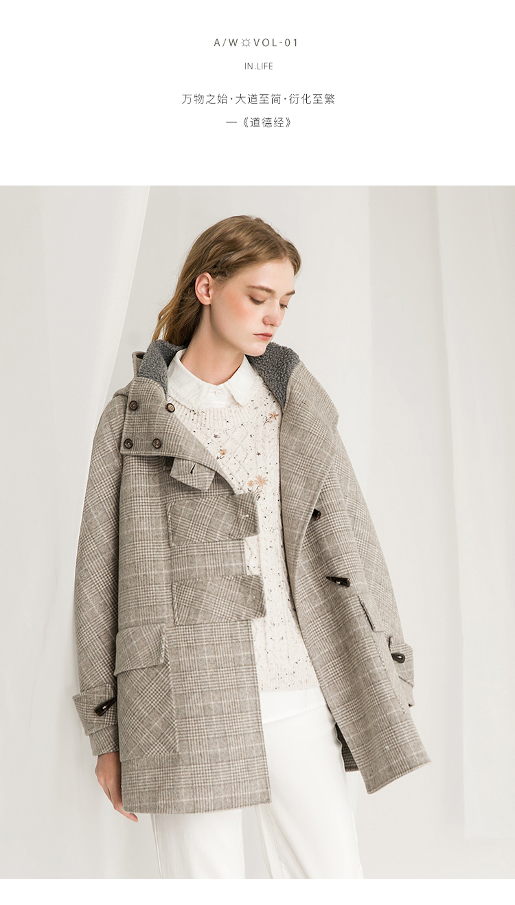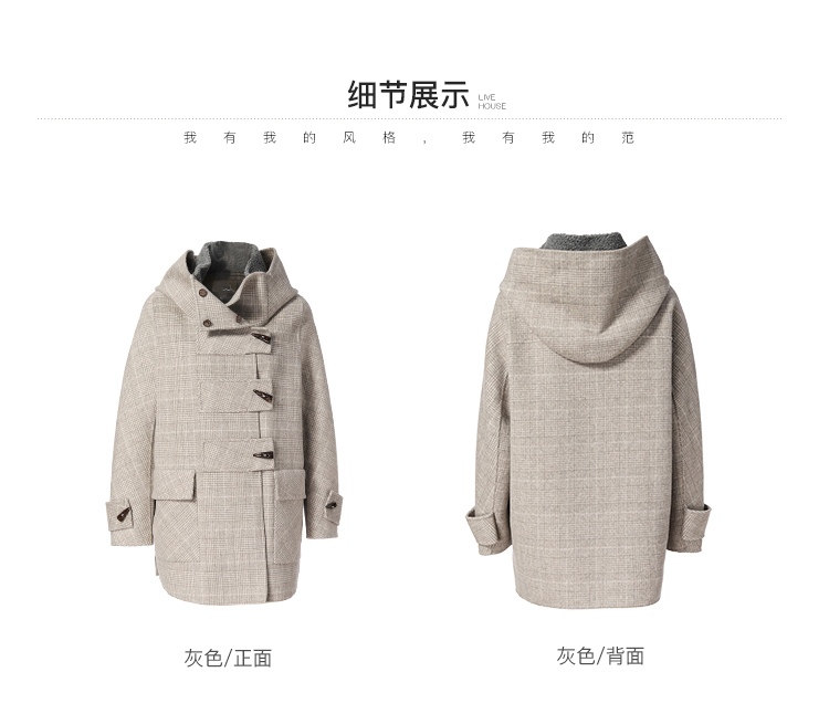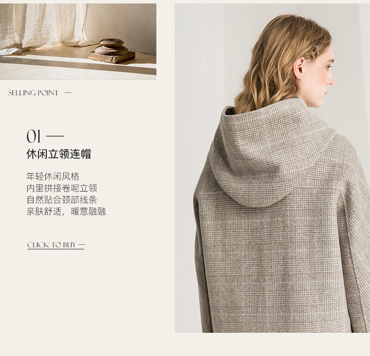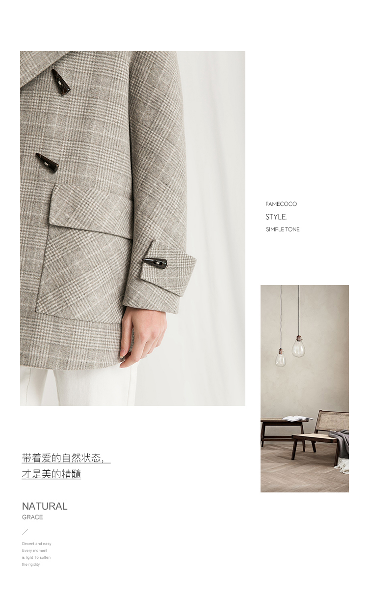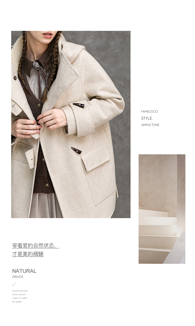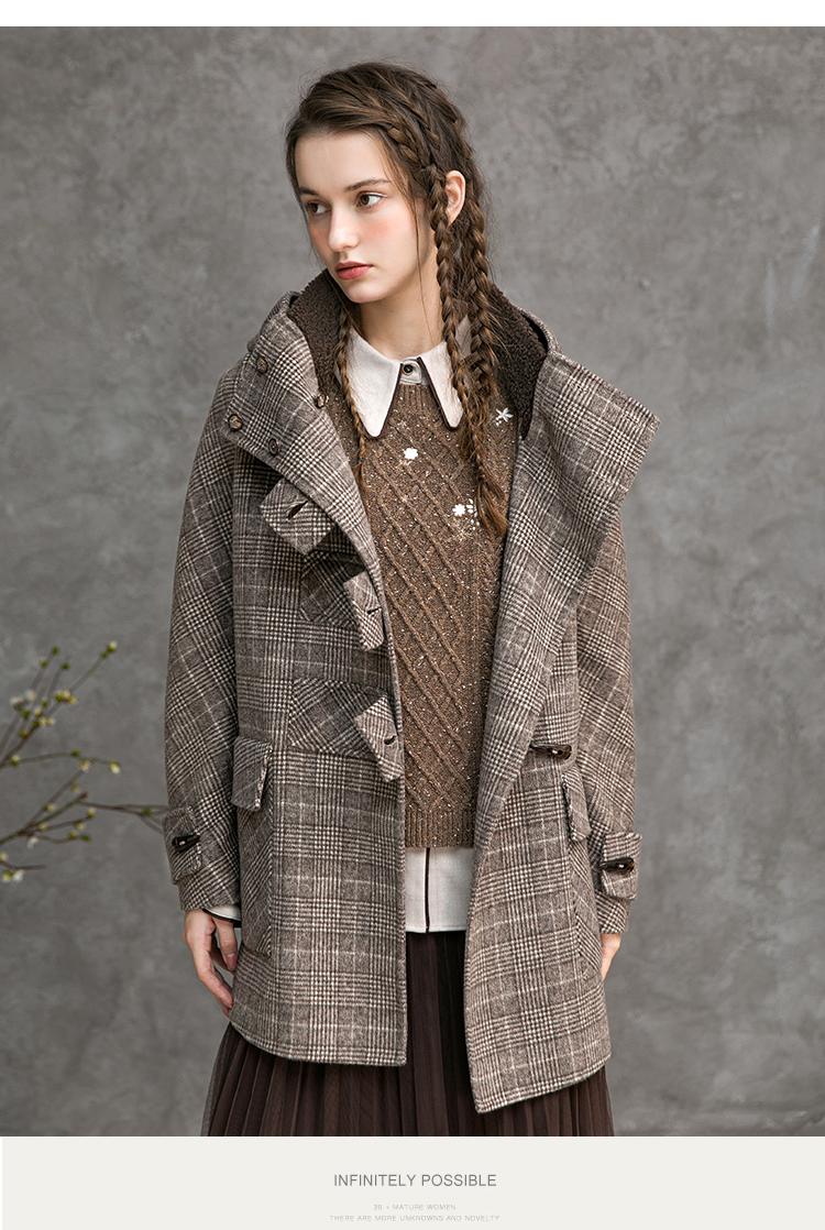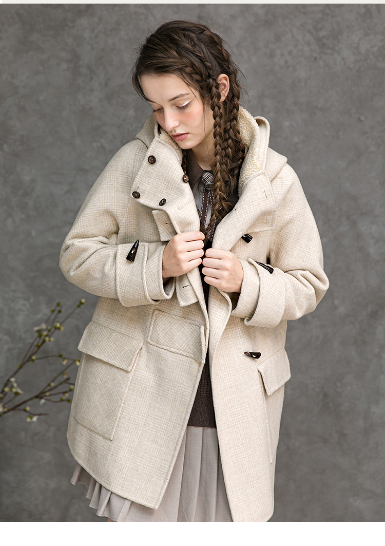 Famecoco范可儿羊毛大衣冬季牛角扣中长款连帽格纹毛呢外套F218AR006