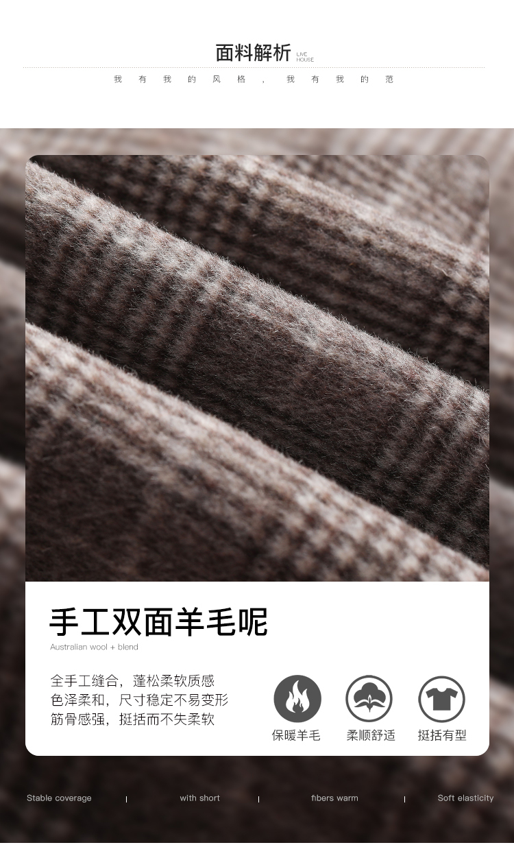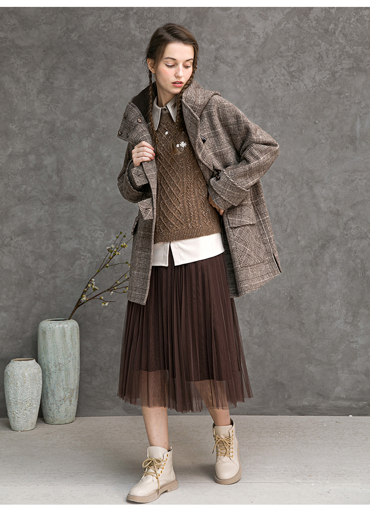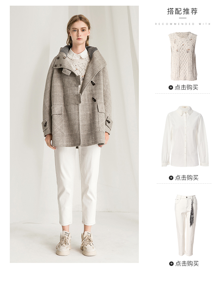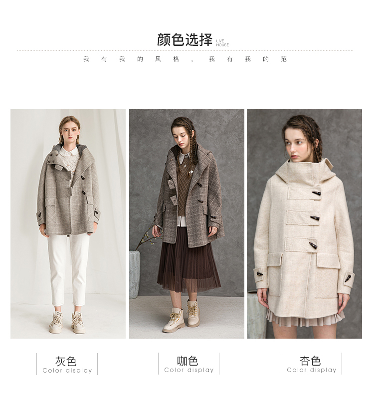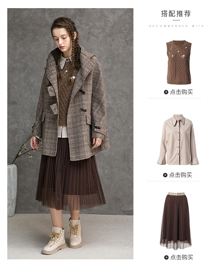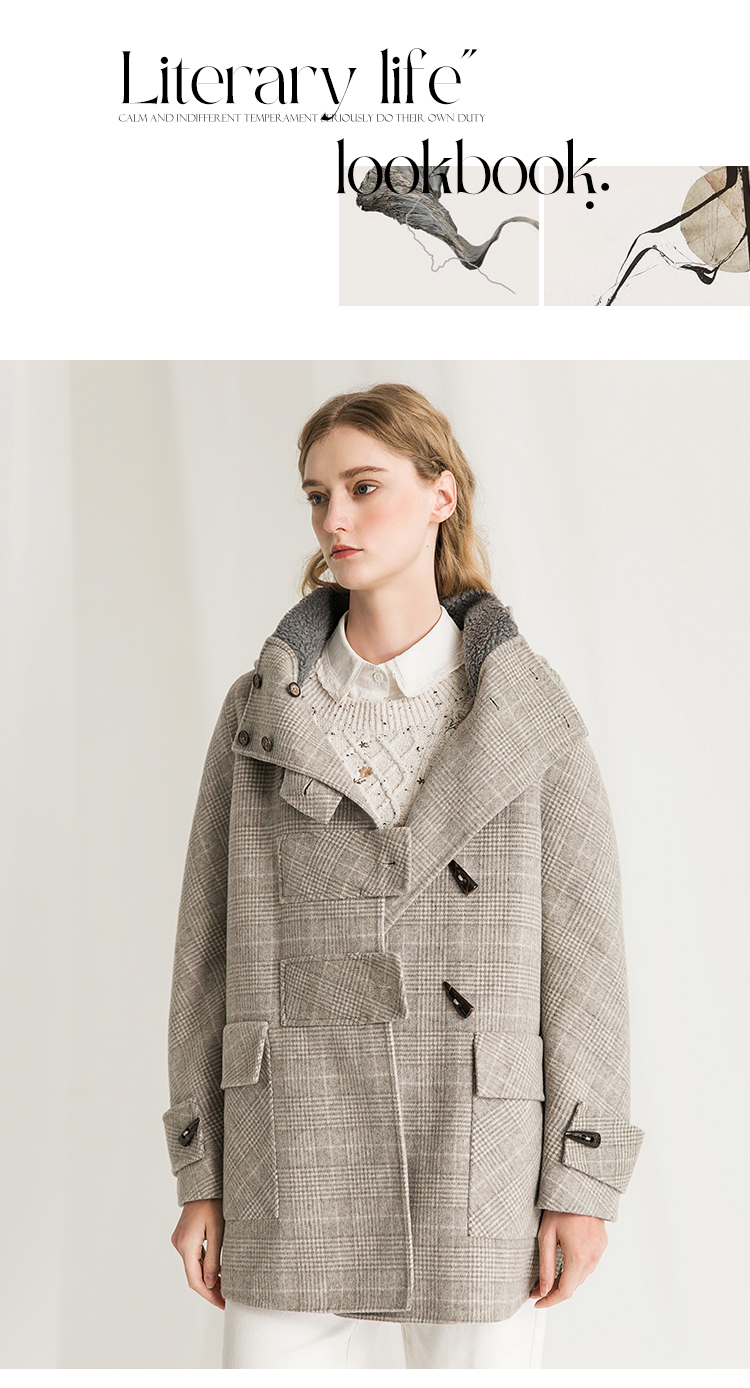 Famecoco范可儿羊毛大衣冬季牛角扣中长款连帽格纹毛呢外套F218AR006