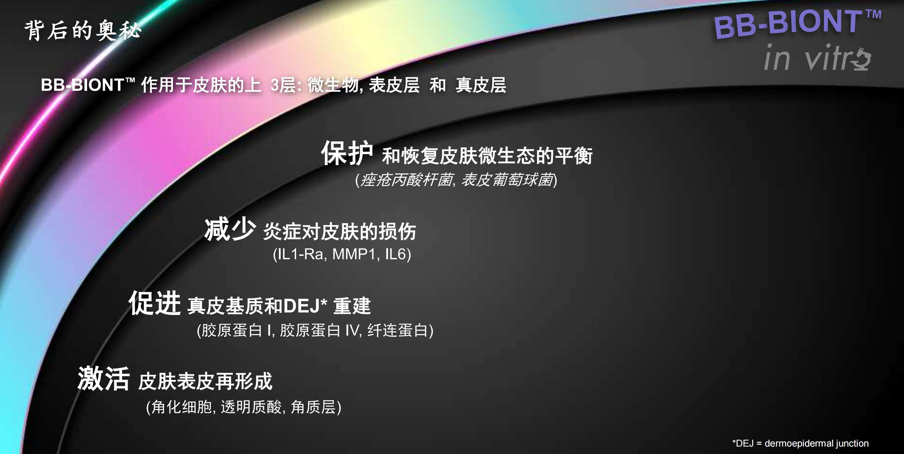 通过促进真皮层基质蛋白的产生,BB-BIONT™ 帮助 重建皮肤组织。重新激活上表皮再形成,
