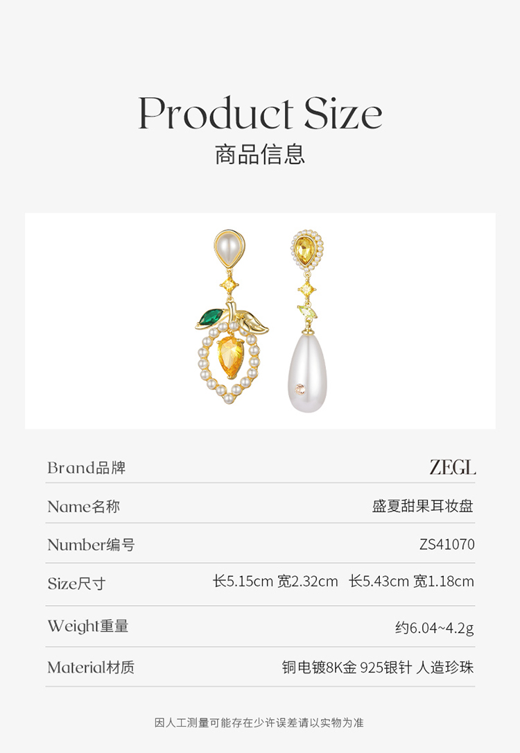 ZEGL设计师盛夏甜果水果耳环女轻奢高级感耳钉人造珍珠银针耳饰品