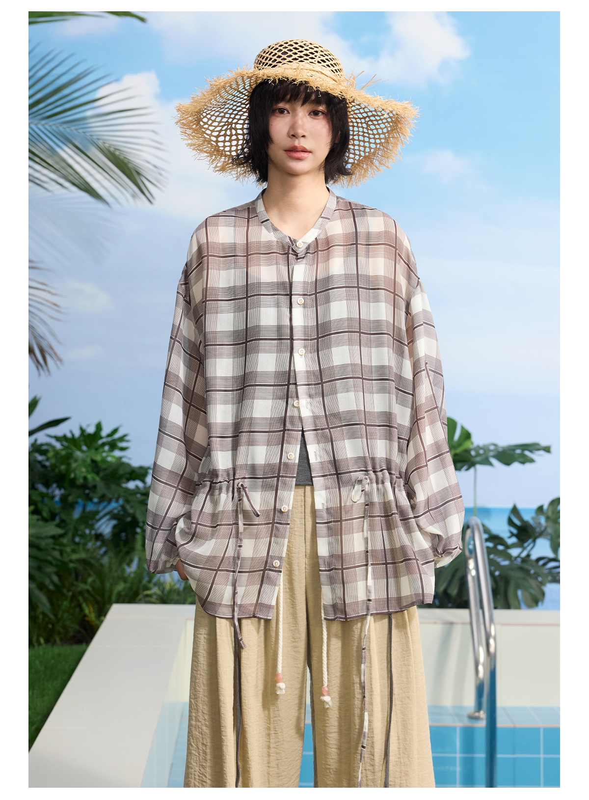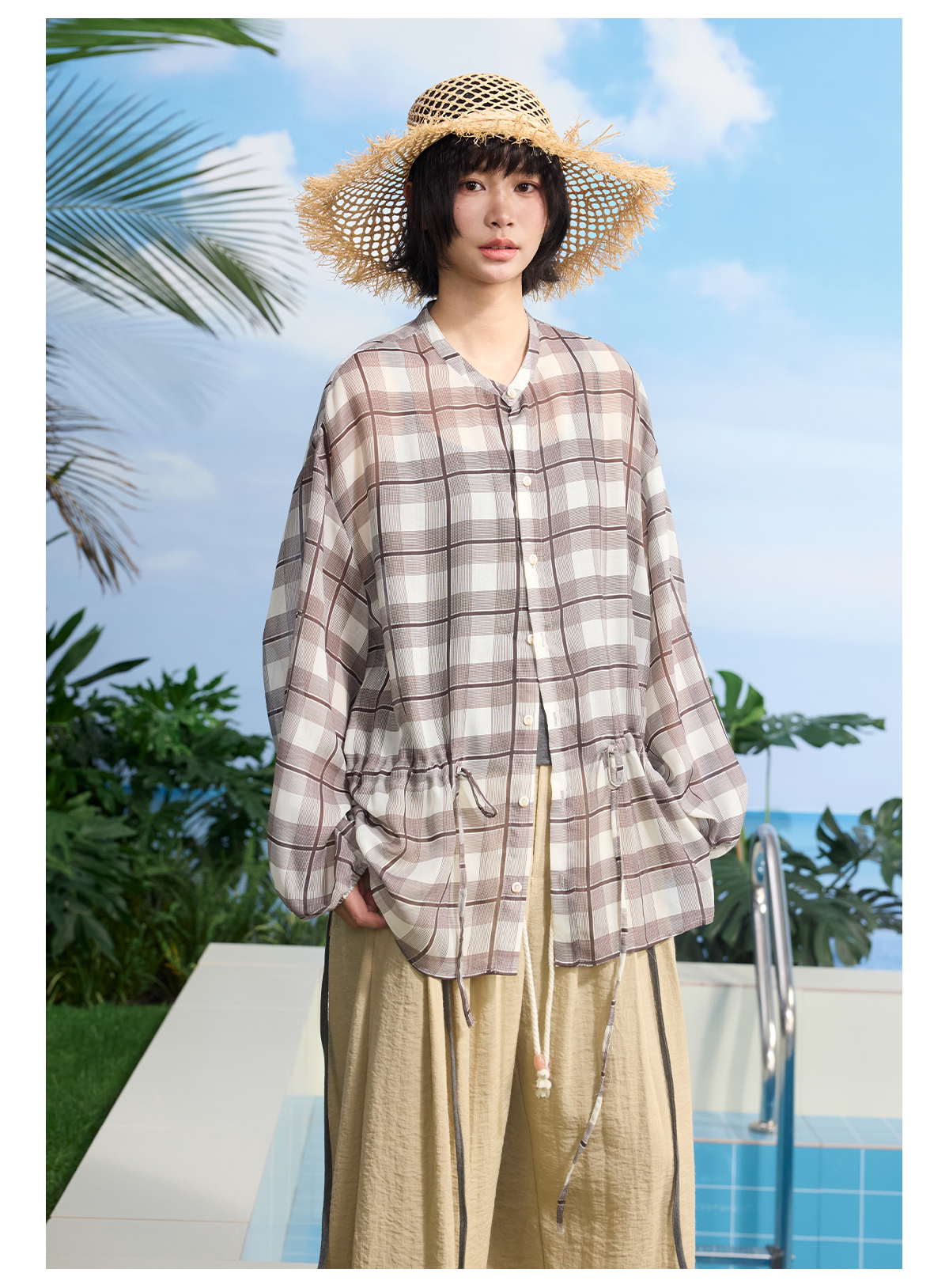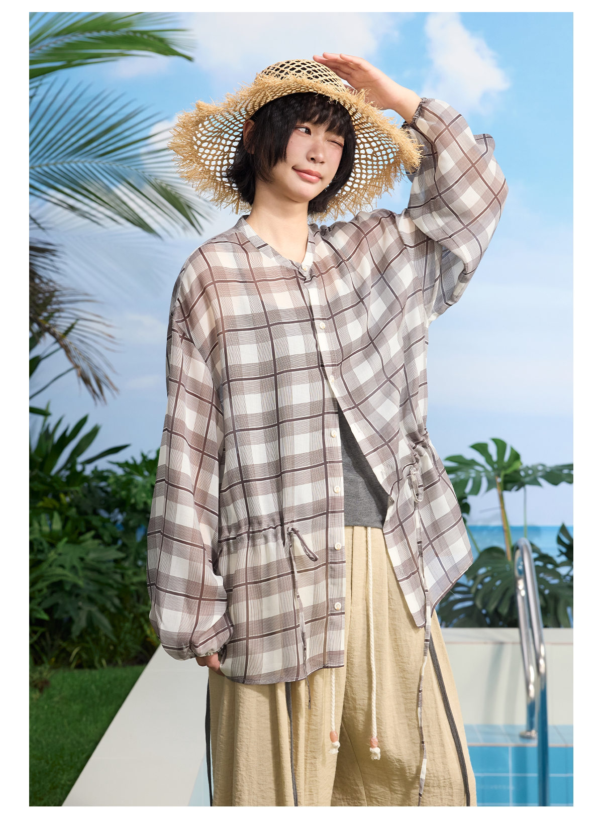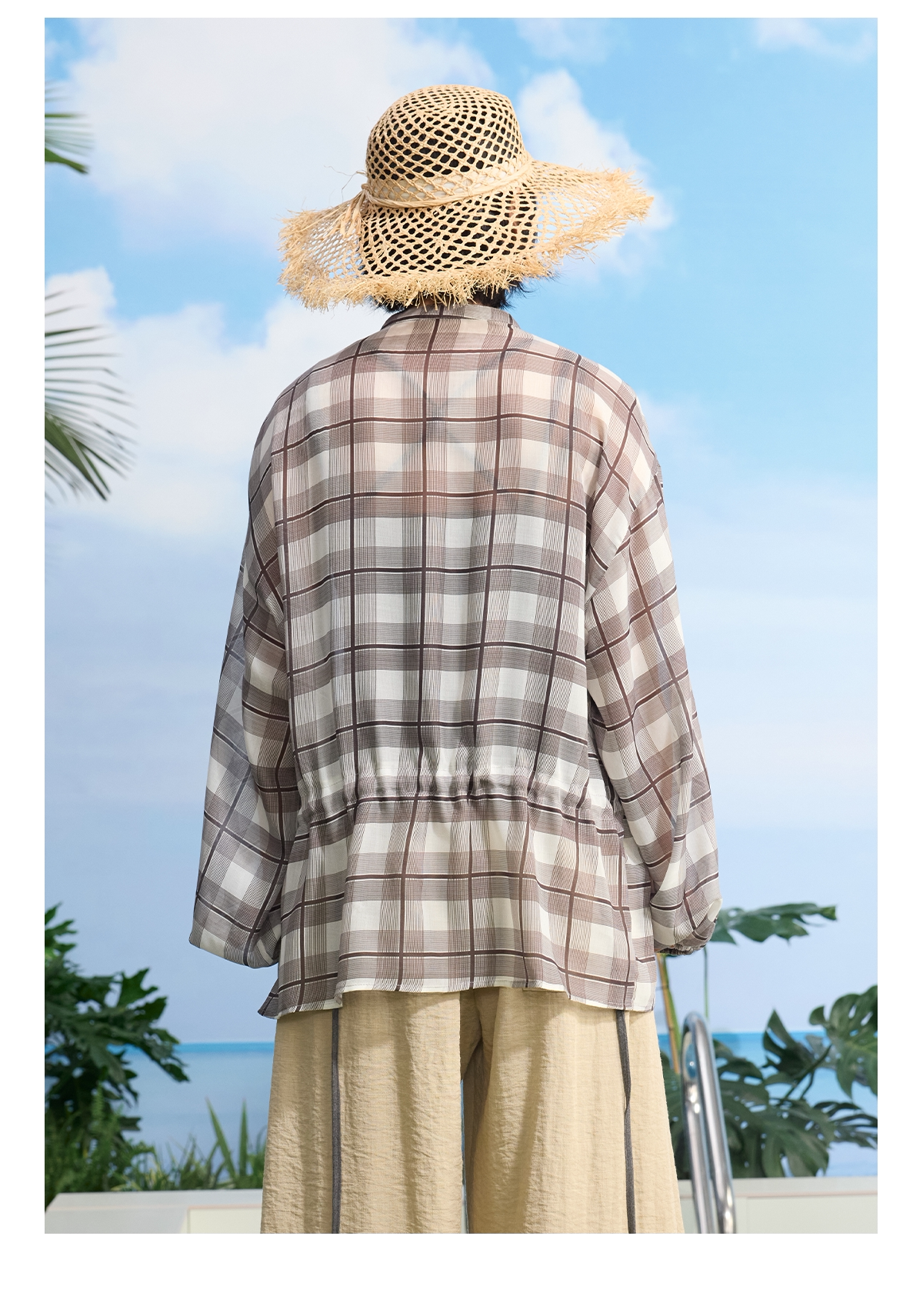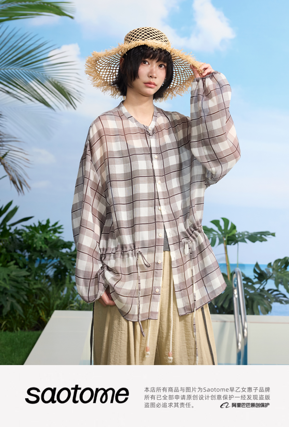 早乙女惠子saotome/STMCS222206/格纹薄纱遮阳收腰长袖衬衫