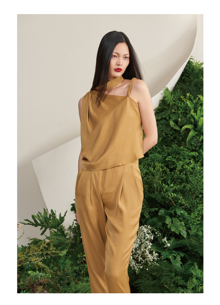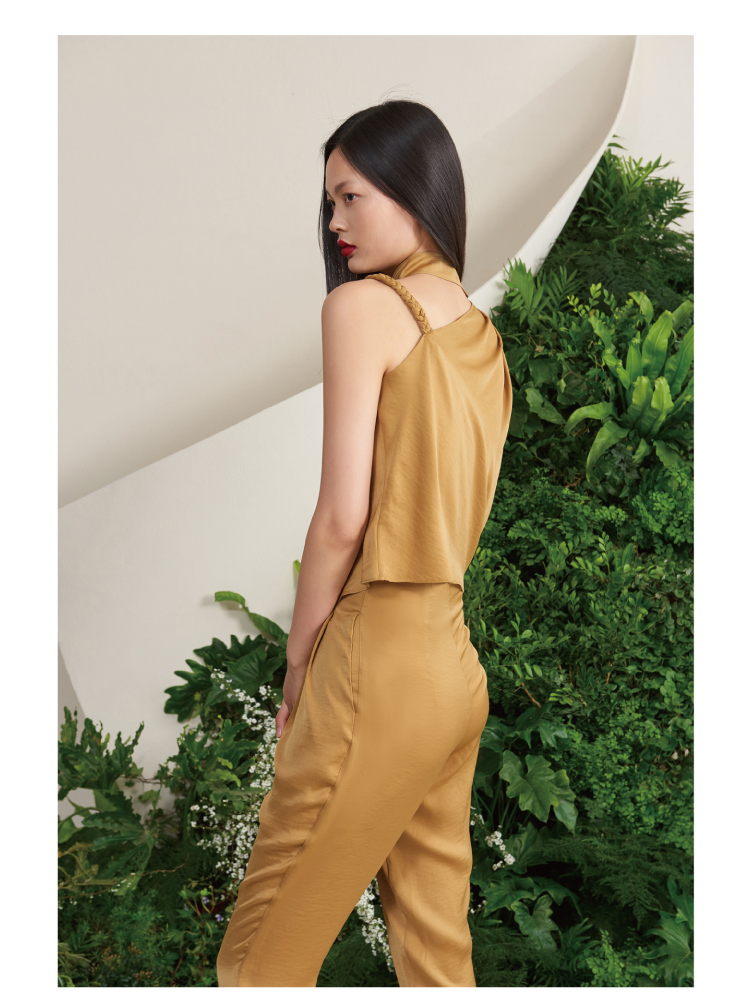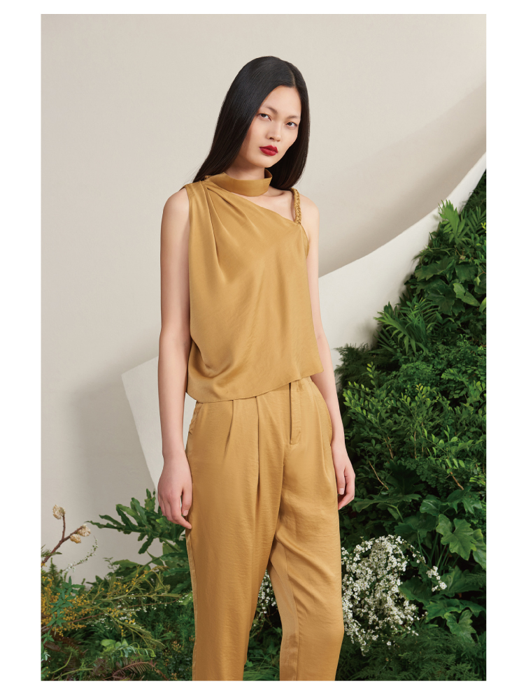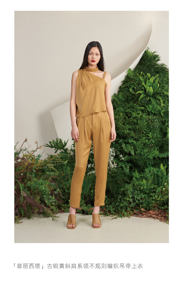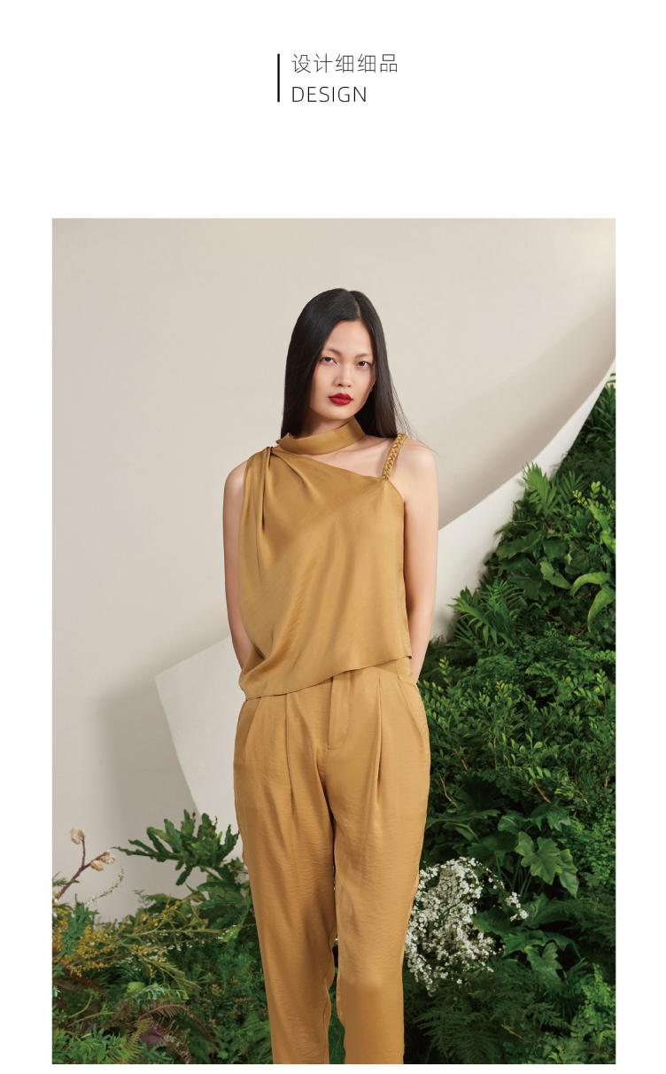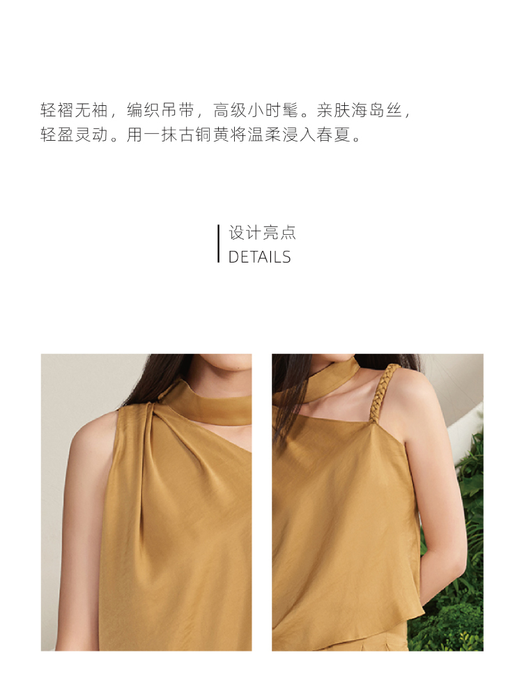 【菲丽西塔】古铜黄斜肩系领不规则编织吊带上衣/00178
