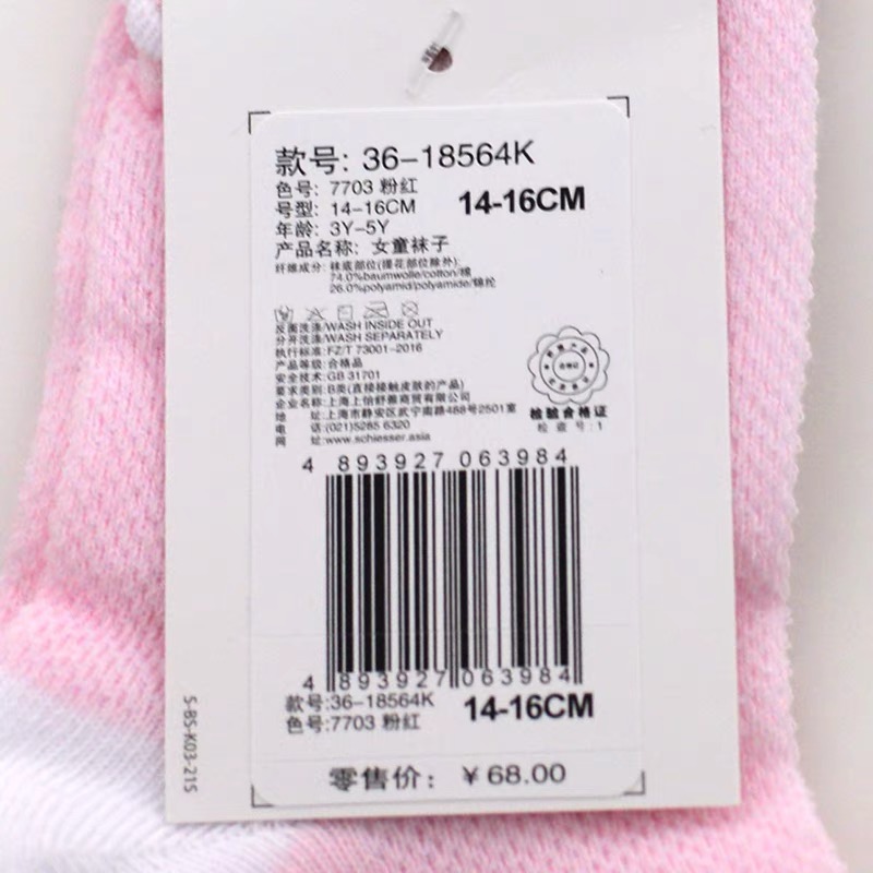 (清仓款,不退换,颜色随机 粉色 浅紫)SCHIESSER KINDER 德国舒雅女童袜子 春夏薄款 棉质舒适透气短筒袜36/18564K