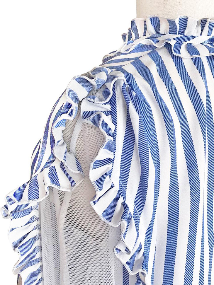 TYNVIE 蕾丝袖木耳边上衣-蓝条纹