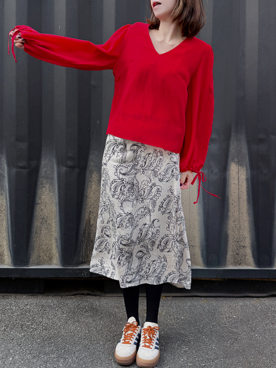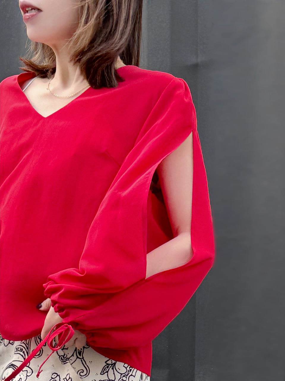 TYNVIE 开衩袖V领真丝衬衫-红色