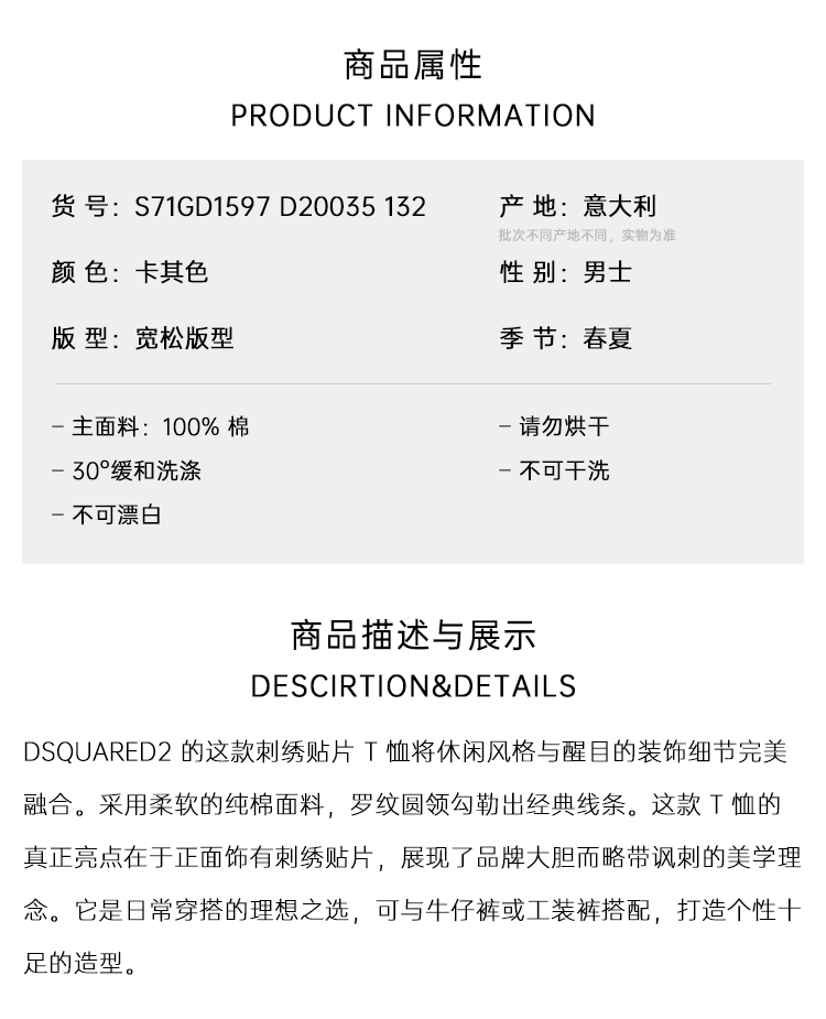 DSQUARED2 男士Magliano联名徽标刺绣贴片棉质圆领短袖T恤 卡其色 S71GD1597 D20035 132