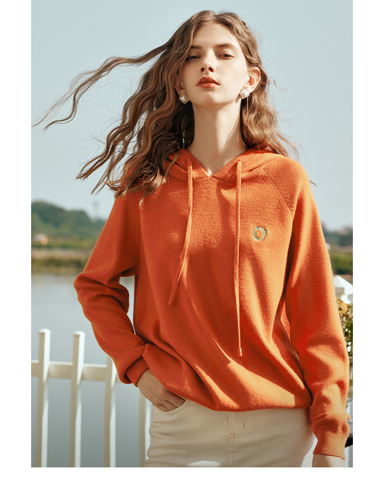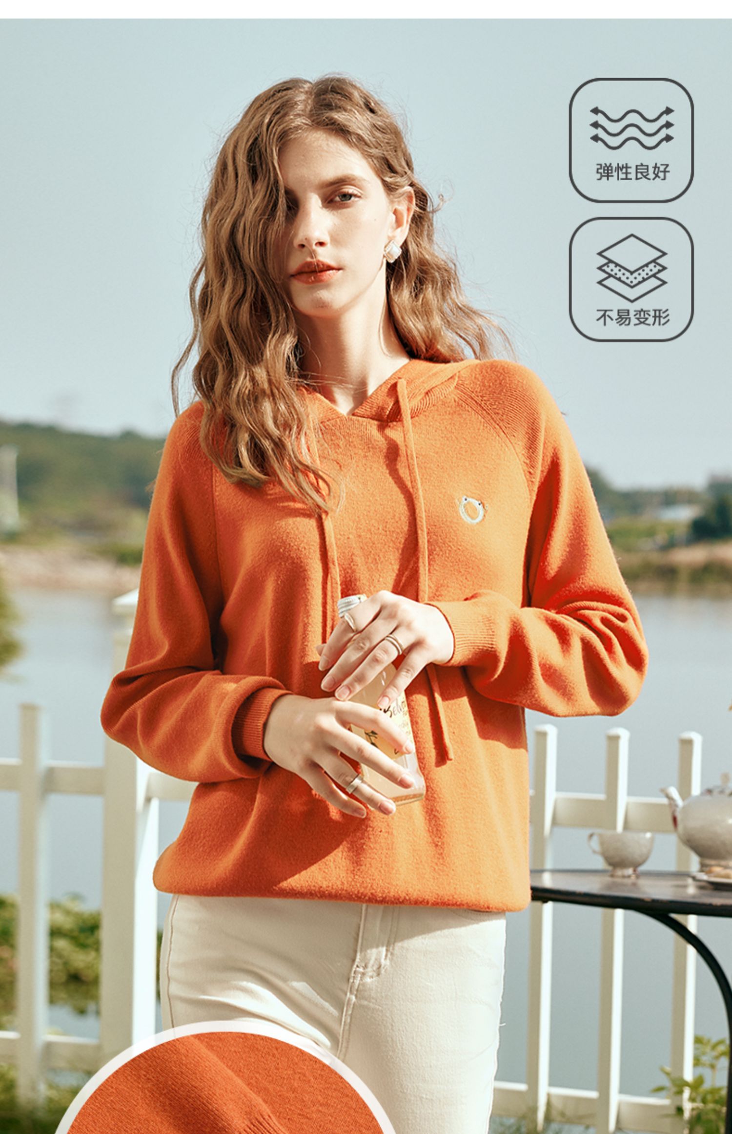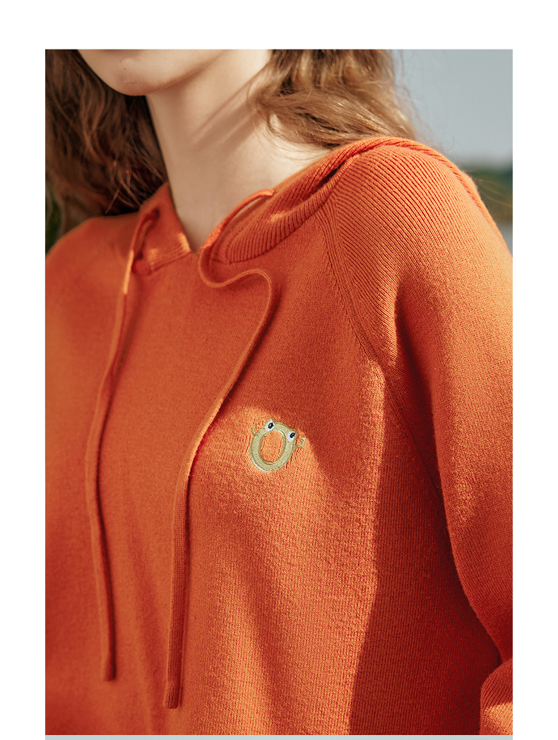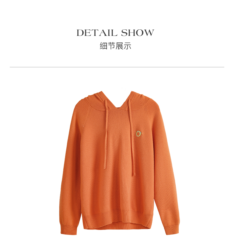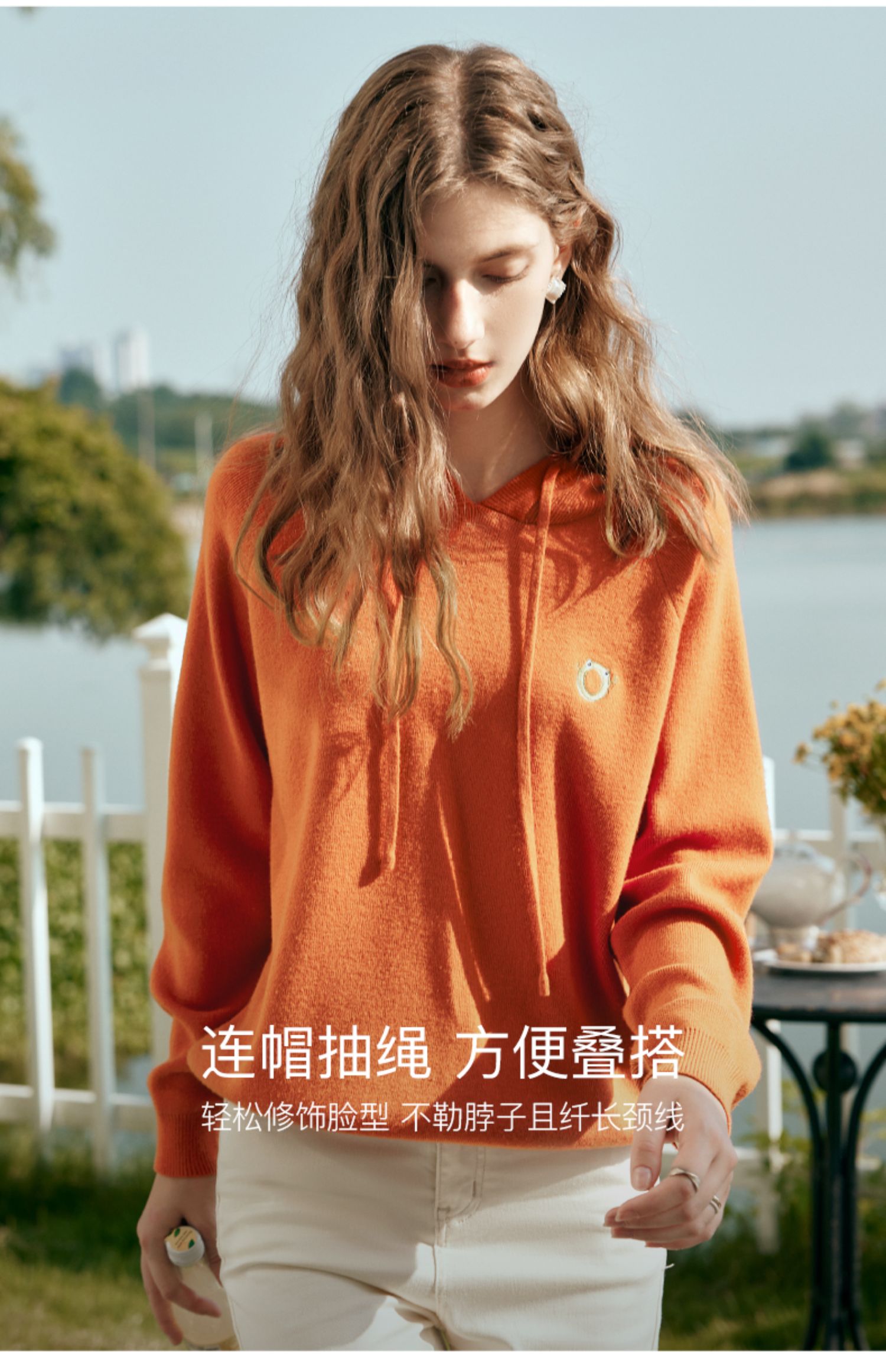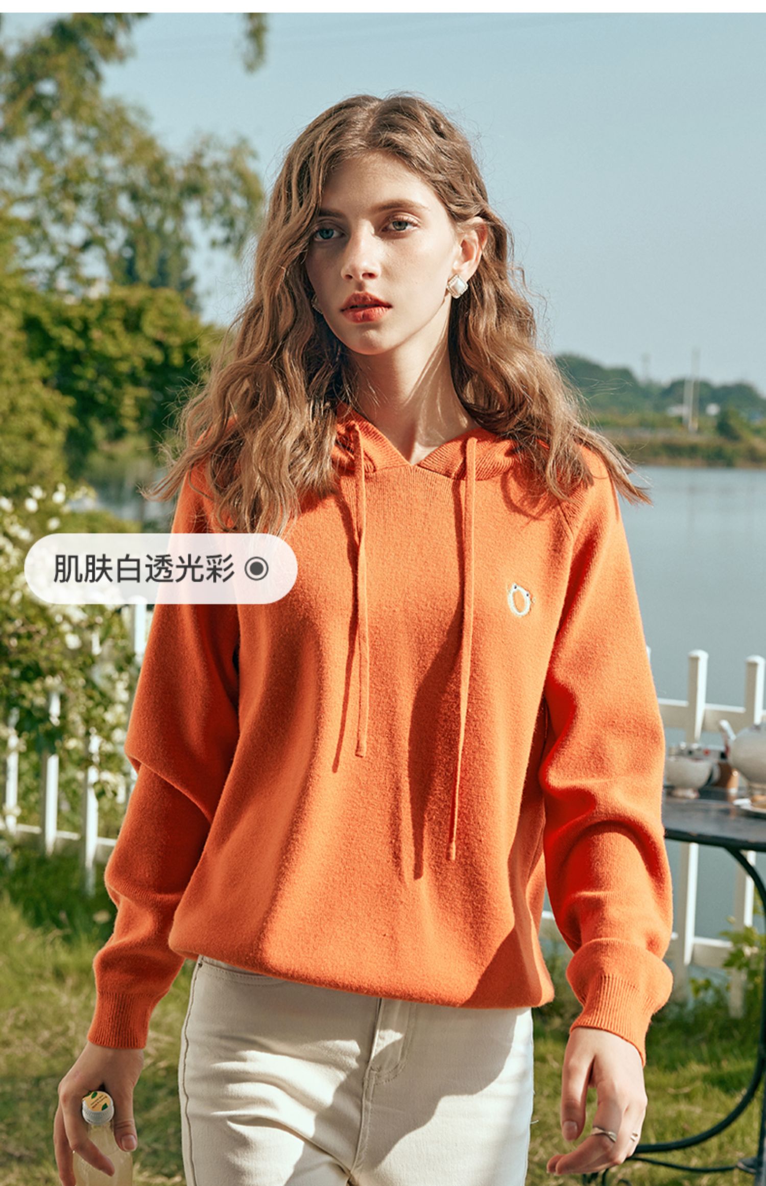 OLrain欧芮儿桔色连帽针织衫女早春2024年新款修身百搭薄款套头衫