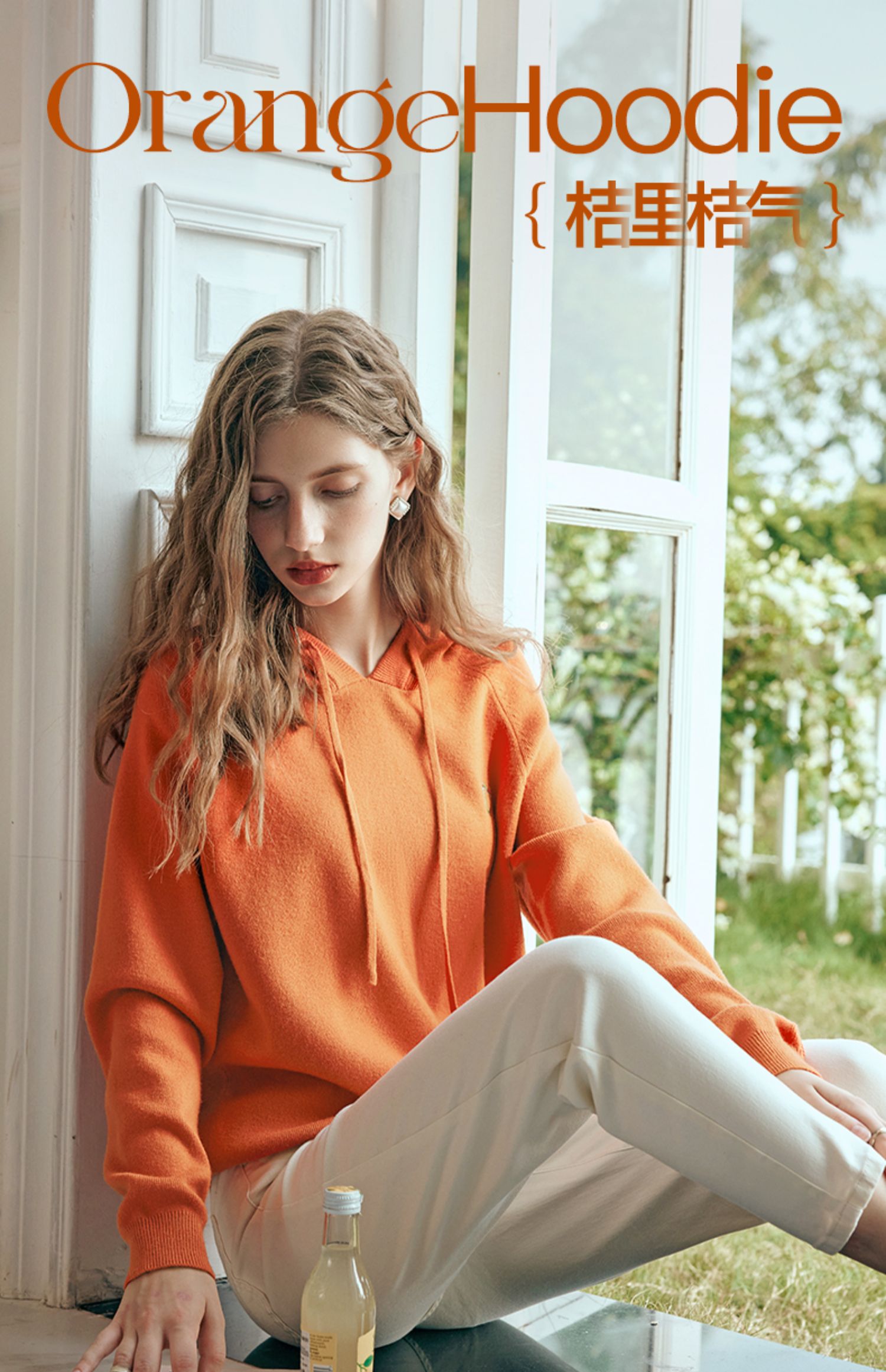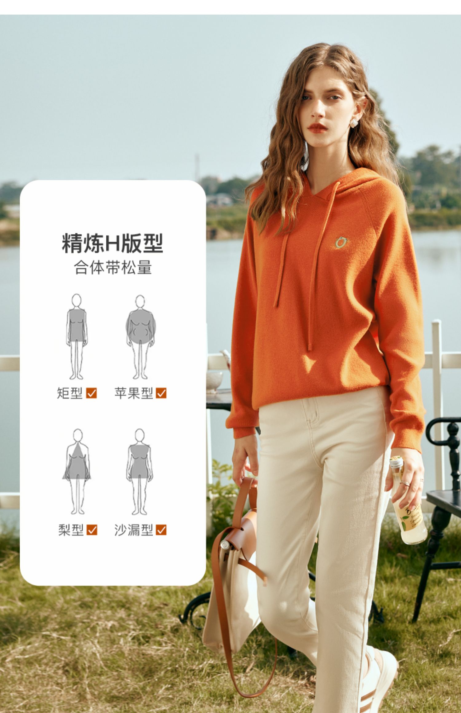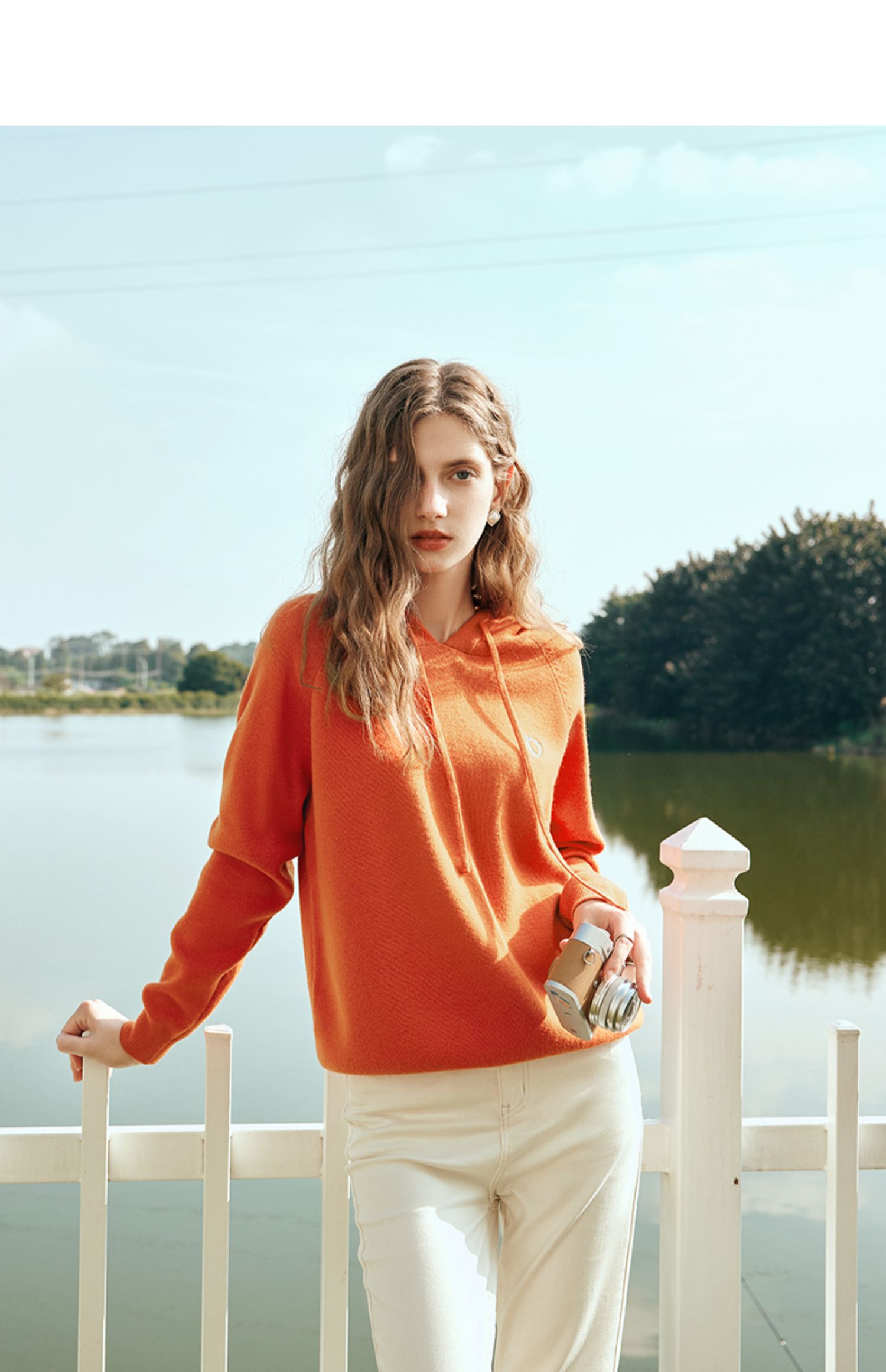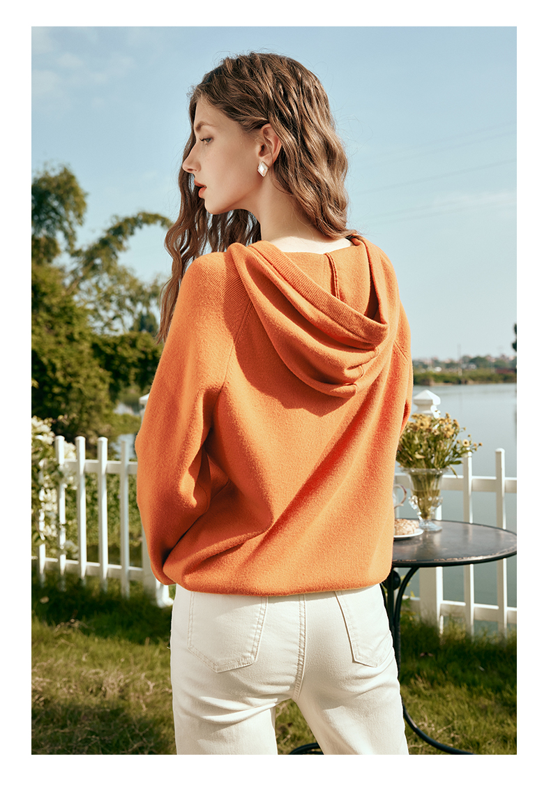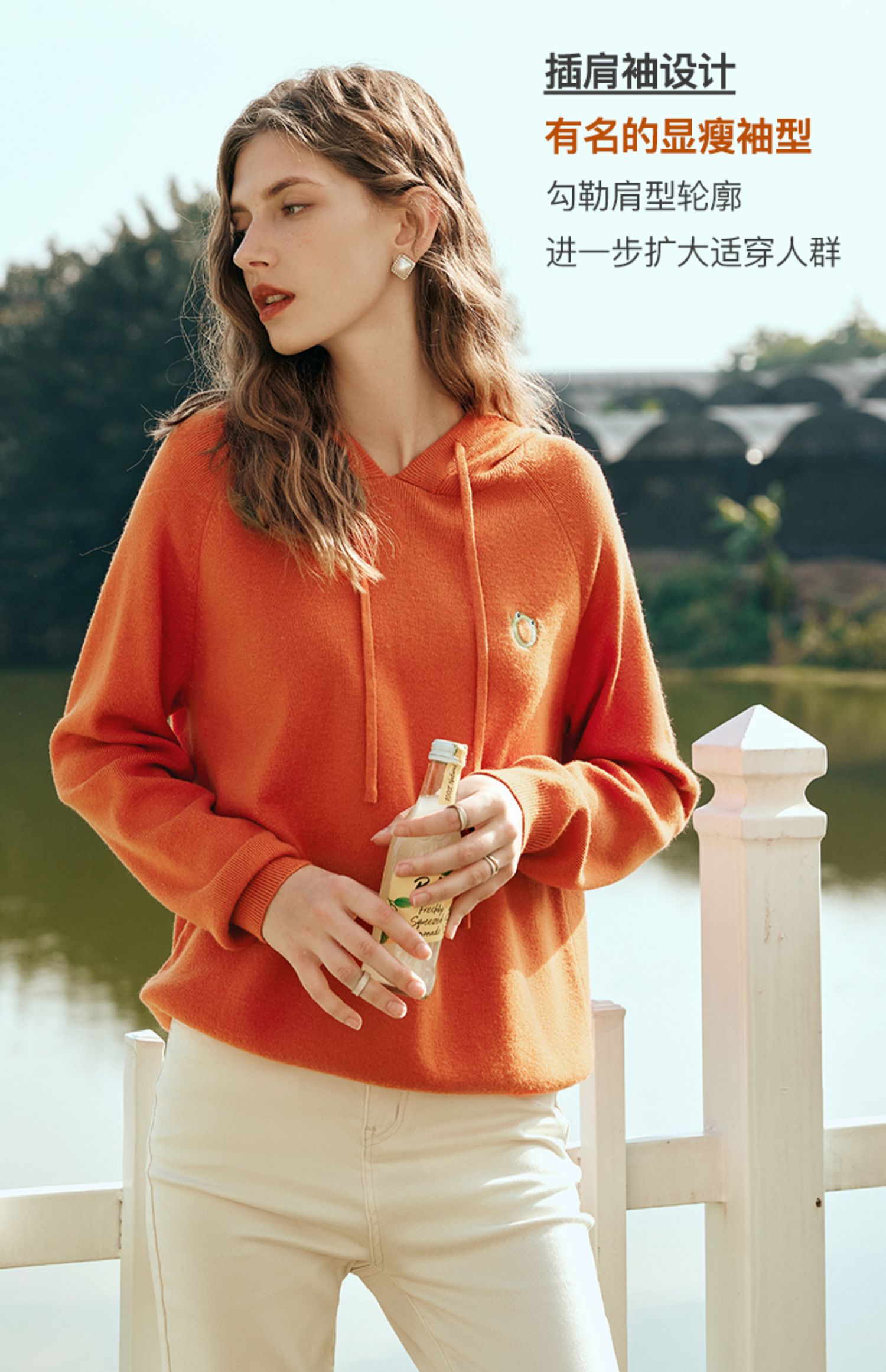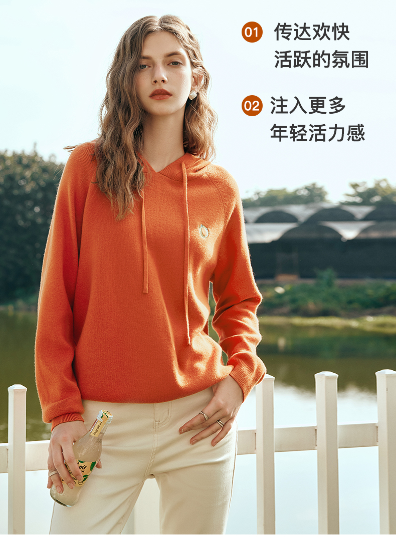 OLrain欧芮儿桔色连帽针织衫女早春2024年新款修身百搭薄款套头衫