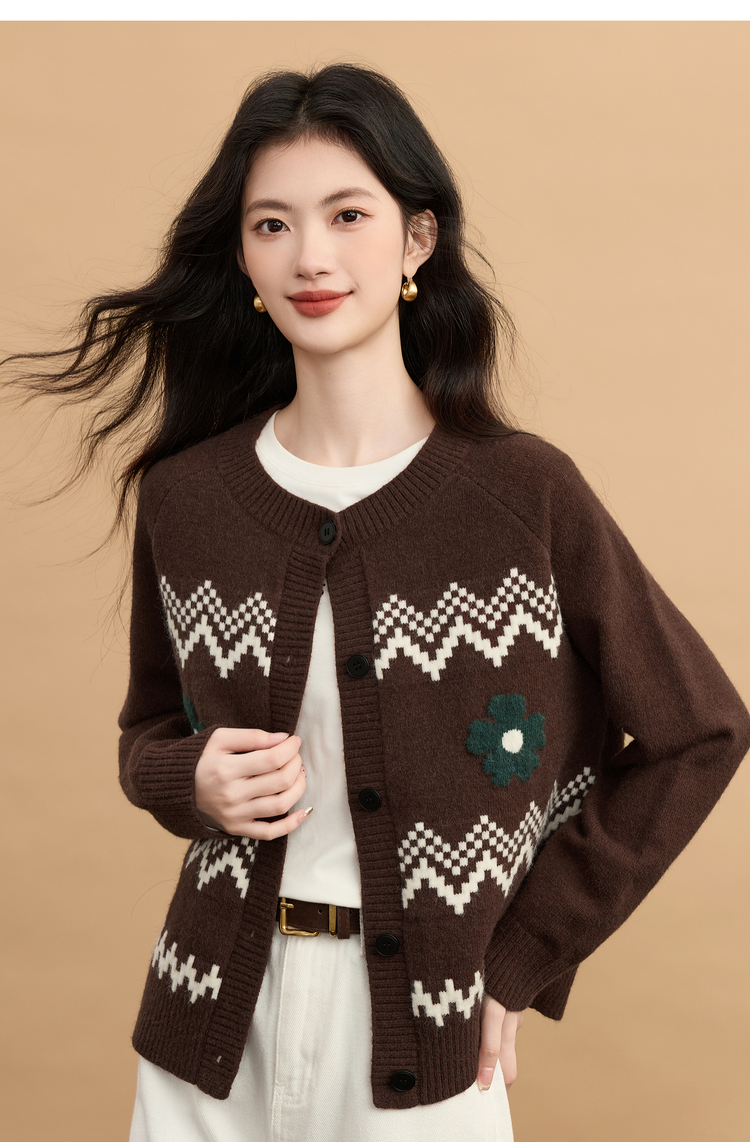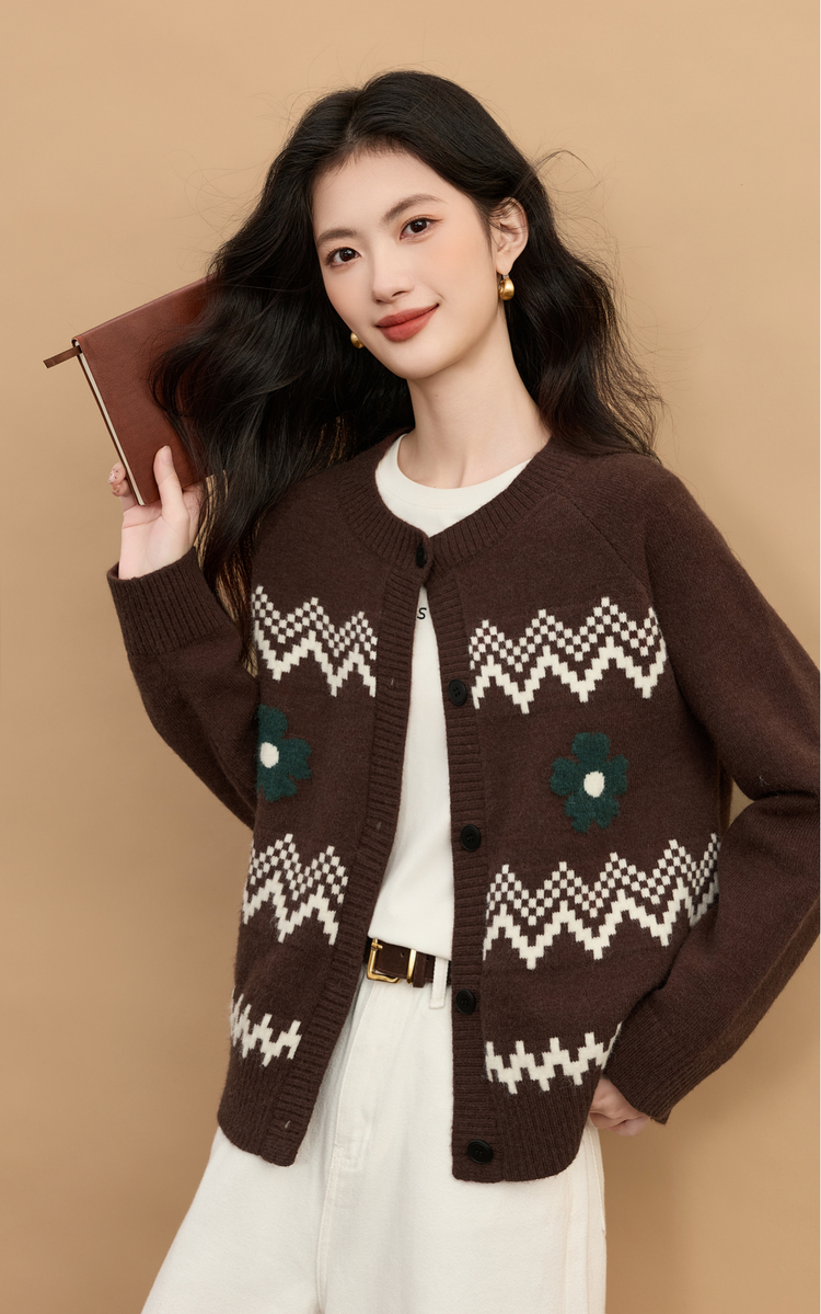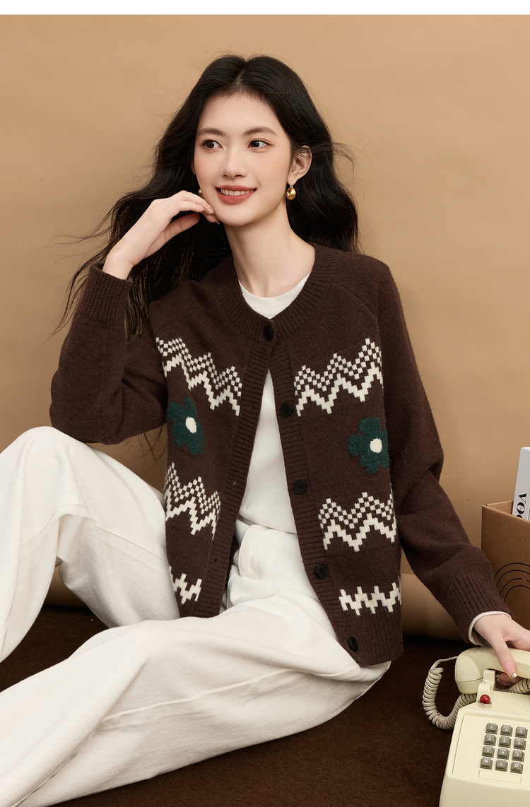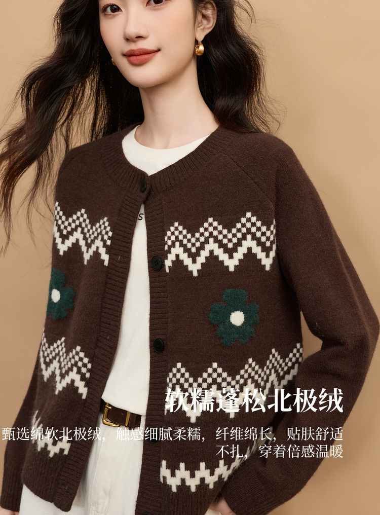 【周末秒杀】熙世界【费尔岛圣诞毛衣】复古提花针织开衫女秋冬长袖圆领短外套