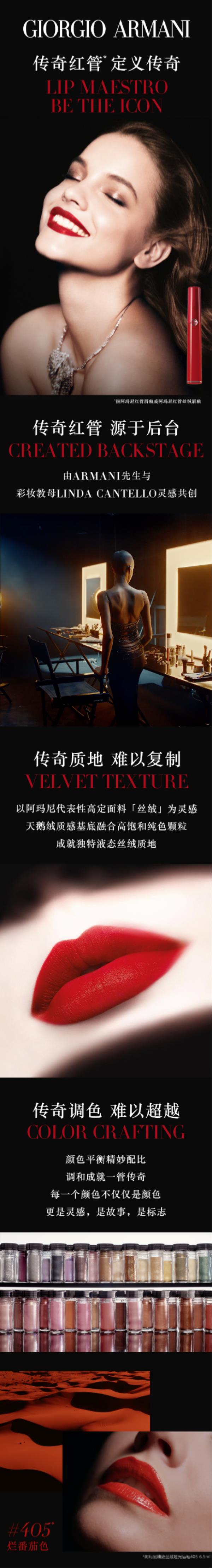 1、阿玛尼#405这款红管唇釉作为大师经典之作,被誉为“唇间丝绒华服”,它大胆突破了口红传统的质地与妆效束缚。将液态质地与哑光妆效相结合,制作出独特的液态丝绒哑光唇釉