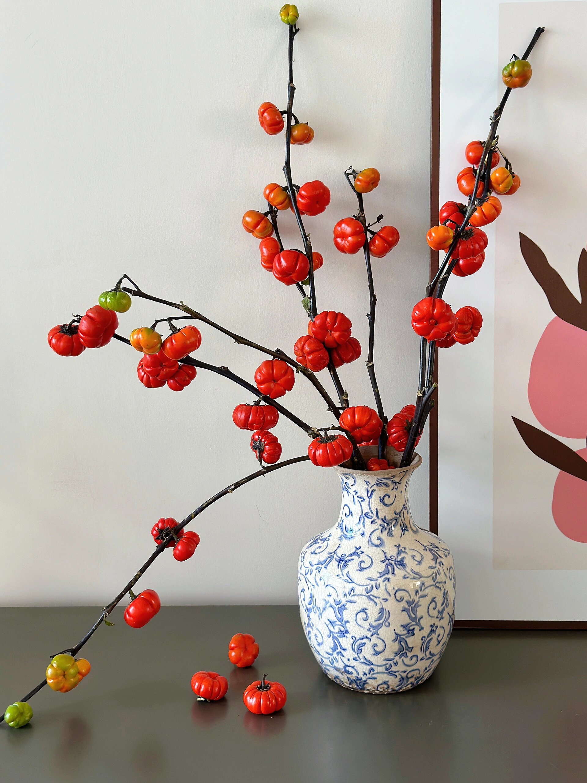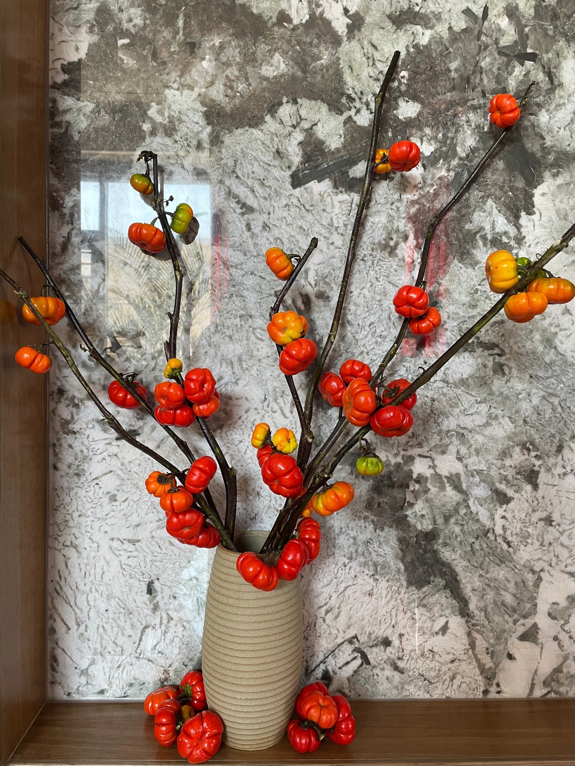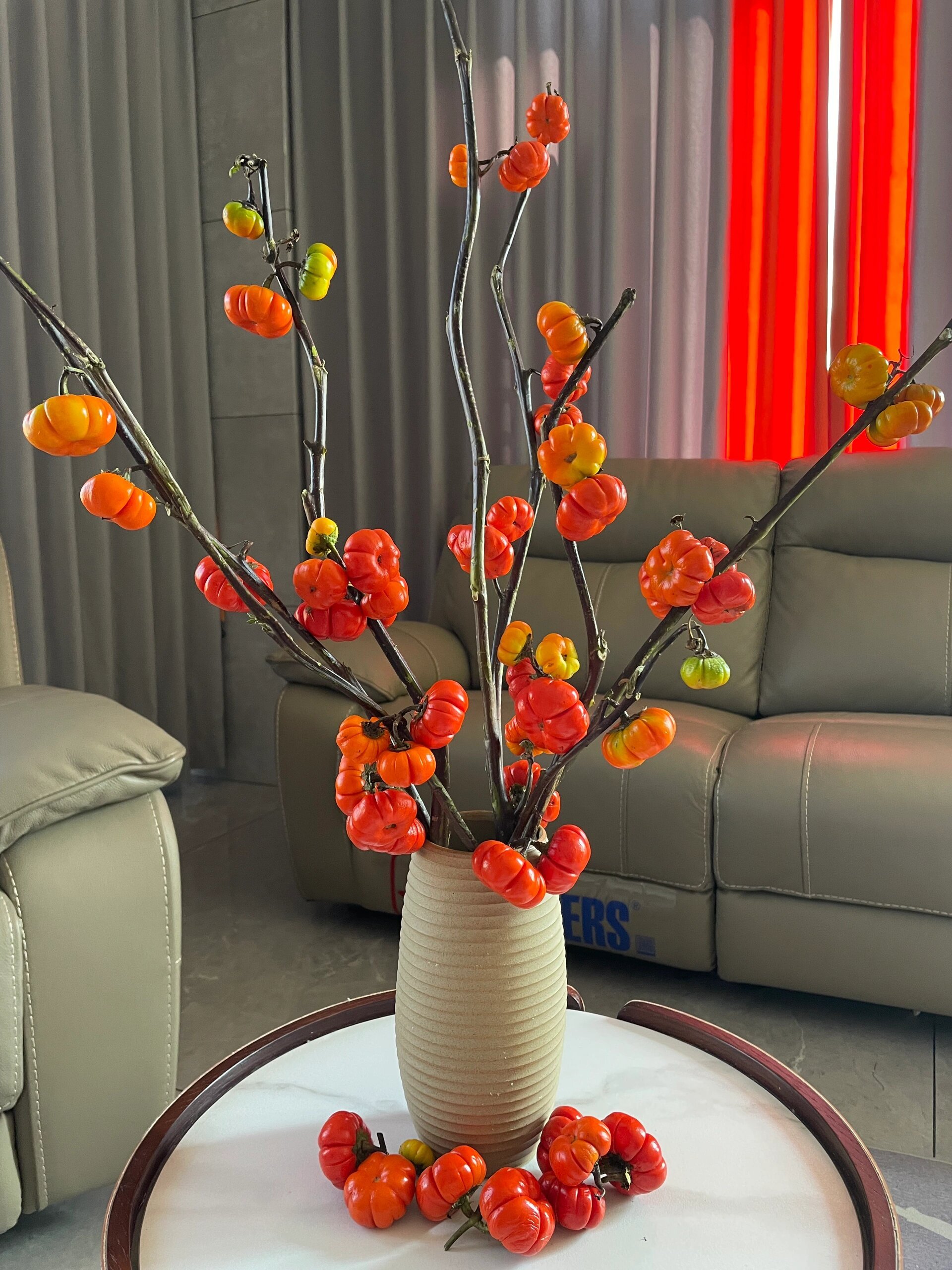 也可以把影响瓶插的较低位置的小南瓜摘下来单独摆放。还可以把一大长枝剪短成2小支插小花瓶。同样一扎小南瓜,可以让你随心所欲凹造型哟~