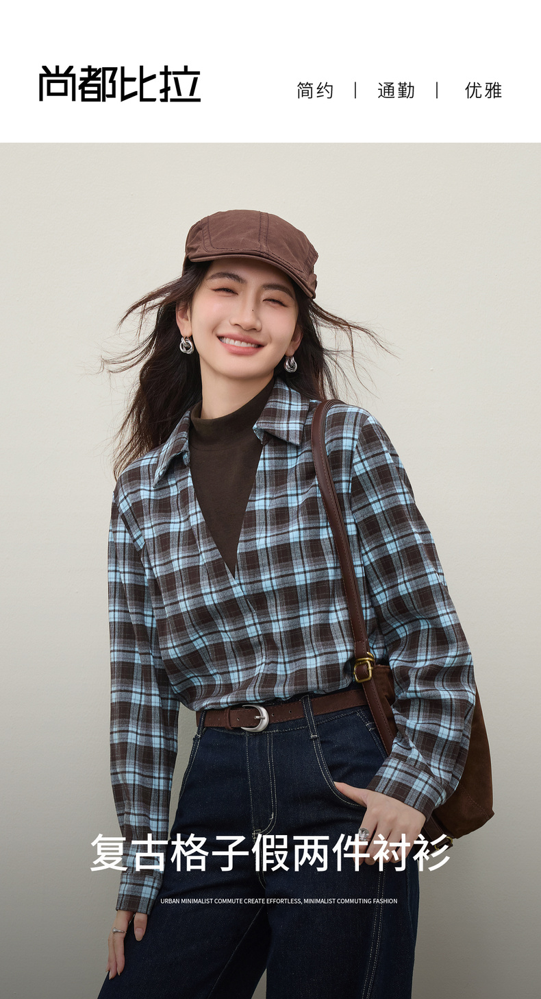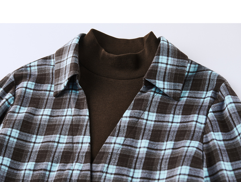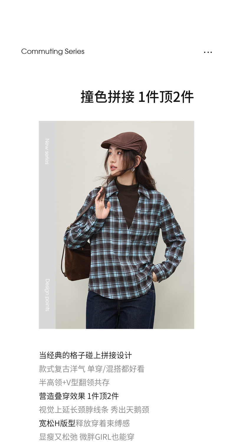 【内购】【假两件衬衫】复古休闲通勤撞色拼接半高领宽松显瘦厚格子衬衫-Q54CK4926