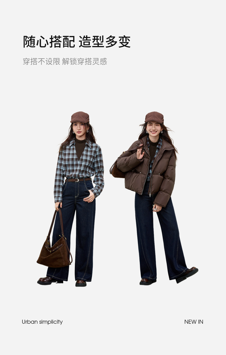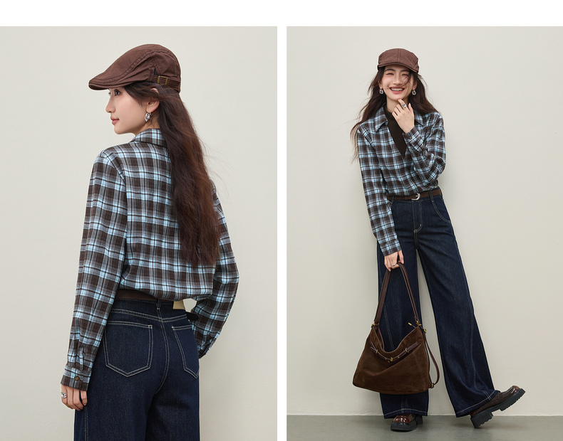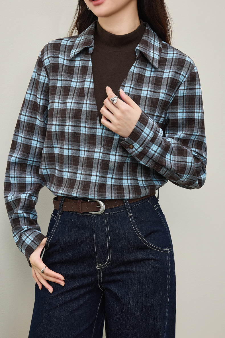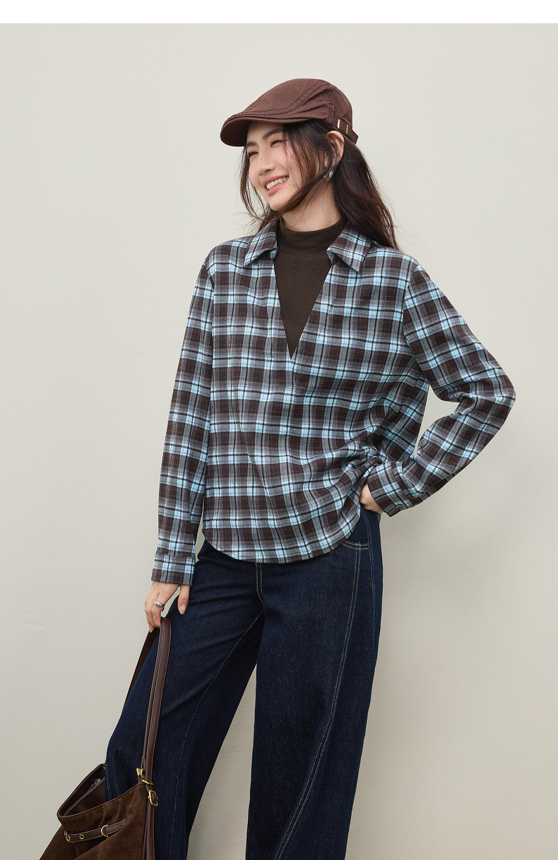【内购】【假两件衬衫】复古休闲通勤撞色拼接半高领宽松显瘦厚格子衬衫-Q54CK4926