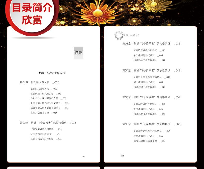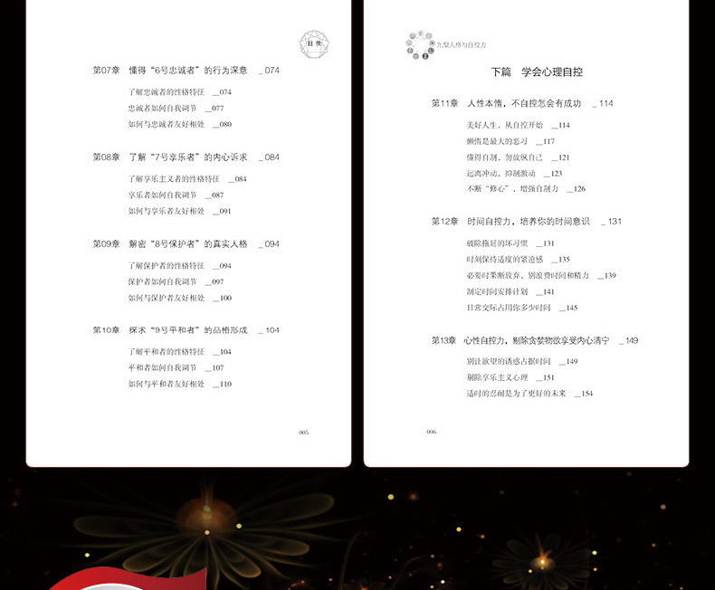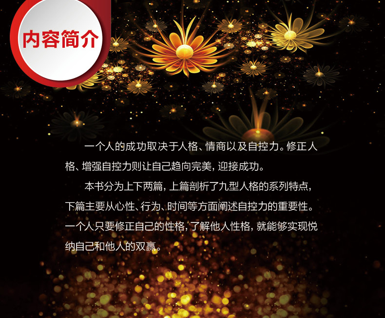 《九型人格与自控力》一个人的成功取决于人格、情商以及自控力。修正人格、增强自控力则让自己趋向,迎接成功。本书分为上下两篇,上篇剖析了九型人格的系列特点,下 篇主要从心性、行为、时间等方面阐述自控力的重要性。一个人只要修正自己的性格,了解他人性格,就能够实现悦纳自己 和他人的双赢。