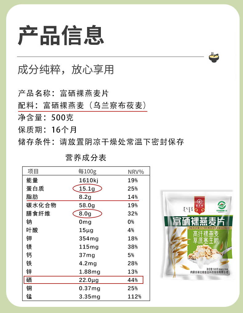 【超值两袋】富硒裸燕麦片 地理标志产品 内蒙古天然富硒纯燕麦片 塞主粮 冲饮谷物麦片早餐 即食无糖精0添加