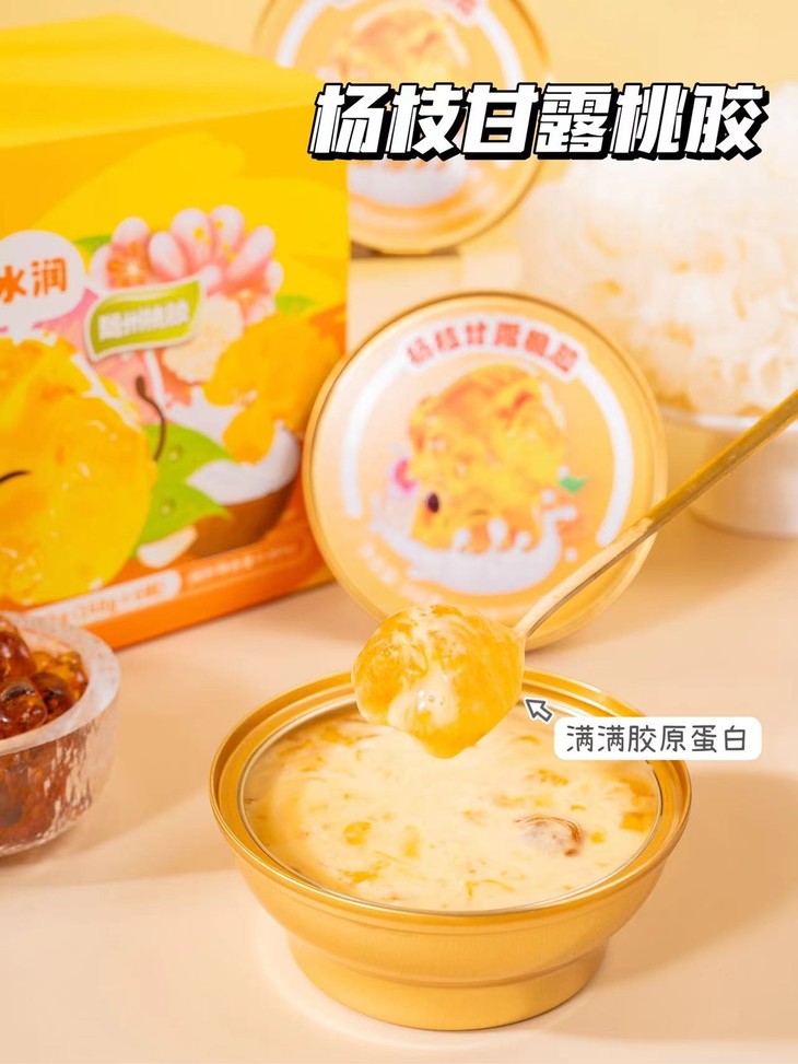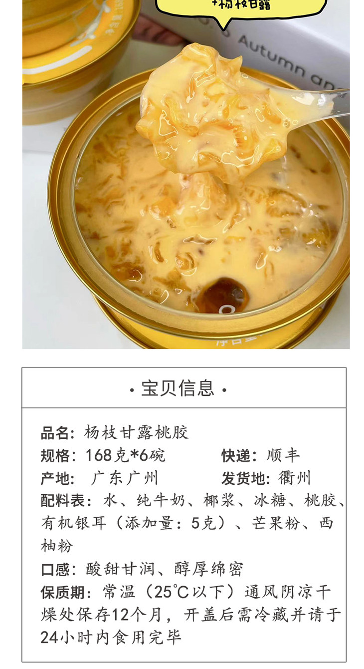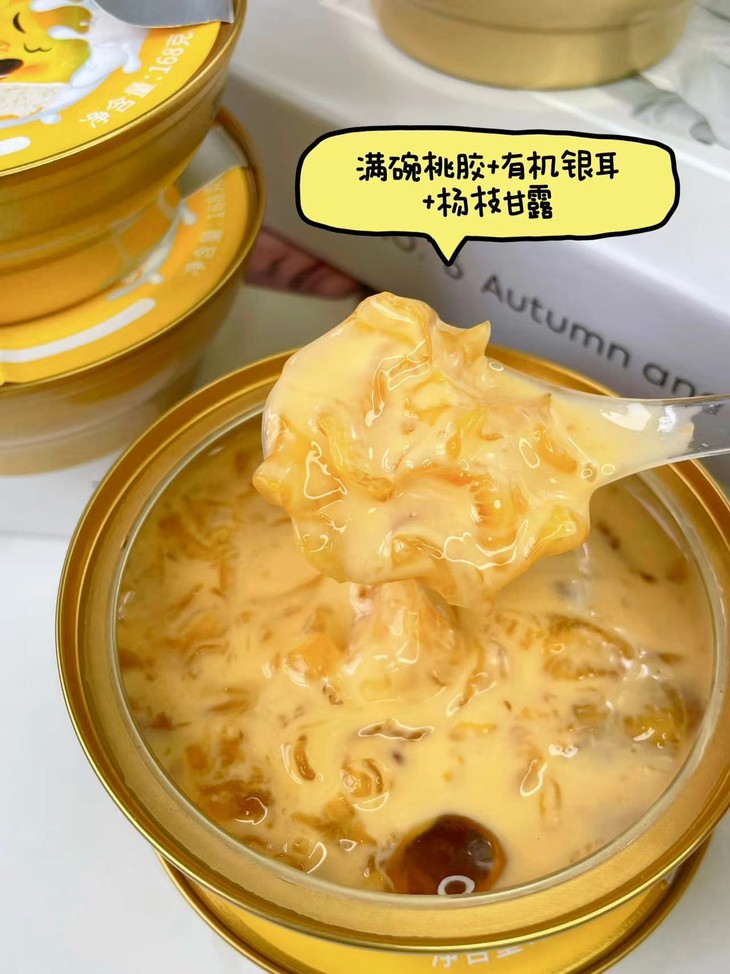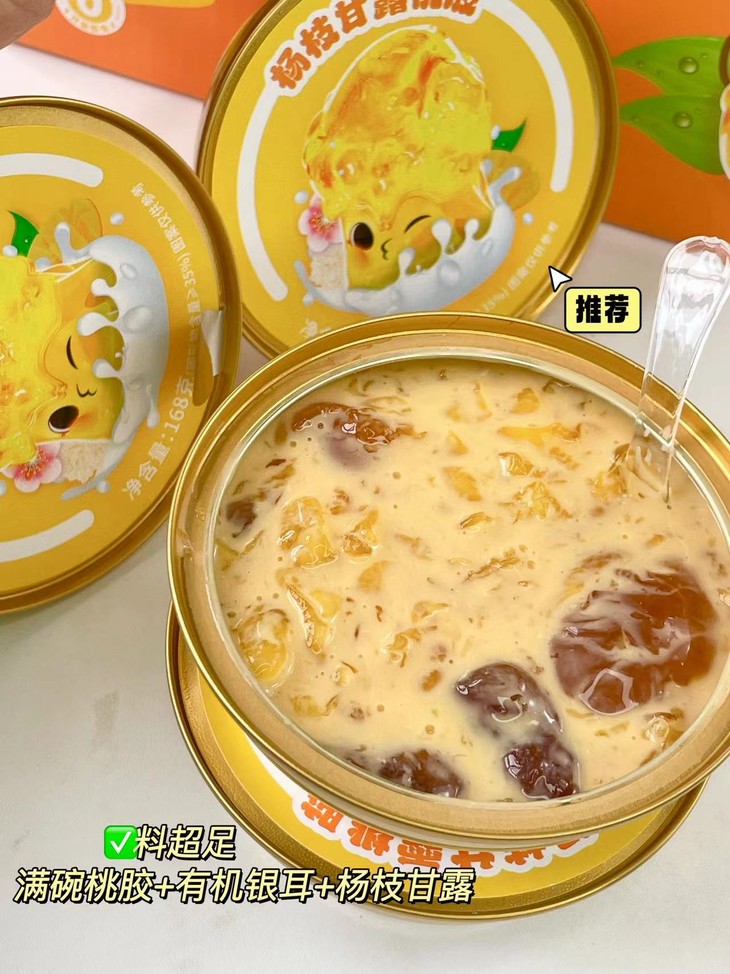 【杨枝甘露桃胶】配料丰富,吃起来超级放心。满满的桃胶口感Q弹,搭配有机本草银耳,还有杨枝甘露经典配料加持,芒果、西柚等果香四溢,甜蜜爆表!