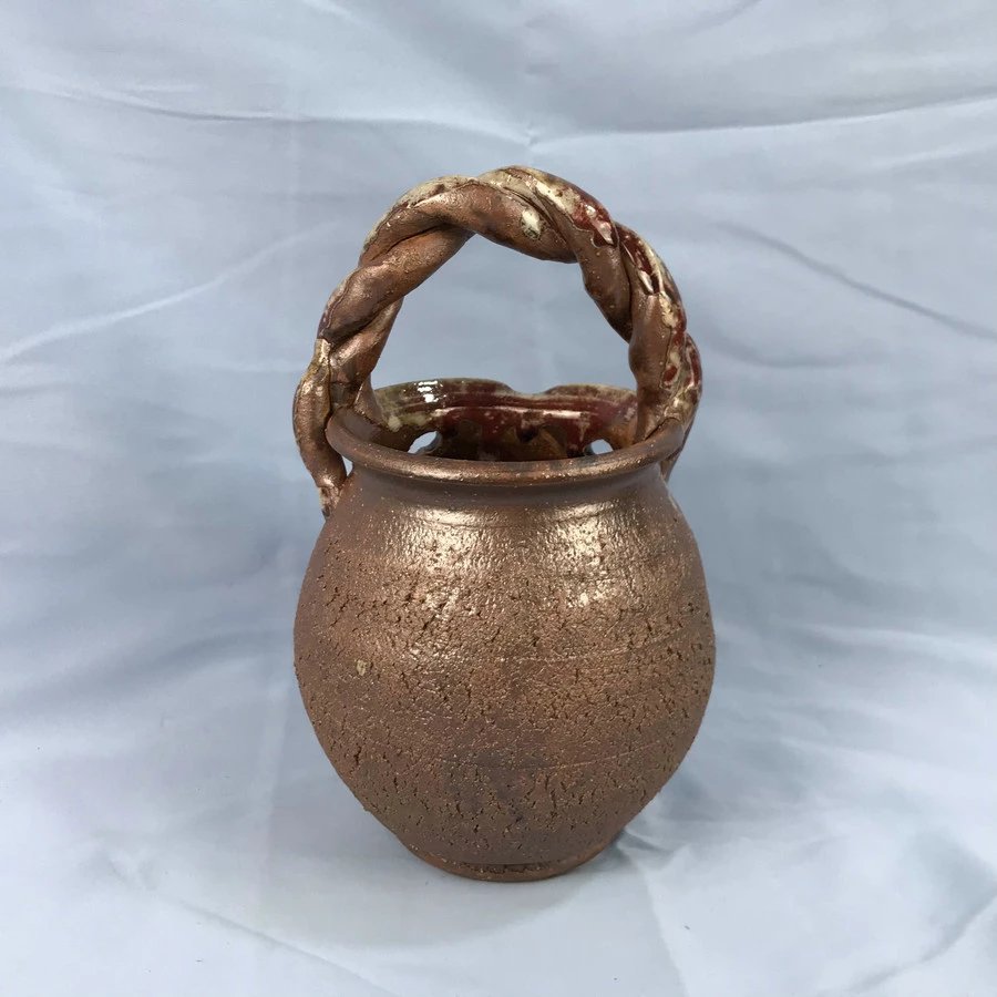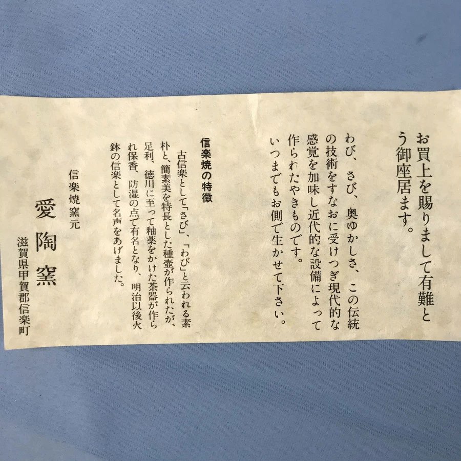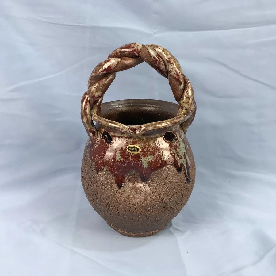 近江国(滋贺县)甲贺郡信乐町是信乐烧(しがらきやき)的发祥地。信乐窑是日本六大古窑之一(另五个是濑户、常滑、丹波、备前、越前),在平安时代烧制须惠器(一种不上釉而素烧的土陶),镰仓时代改良烧制技法后生产出红褐色的陶器,这就是所谓“古信乐”,而眼前这个花器沿用的就是古信乐烧的方法。