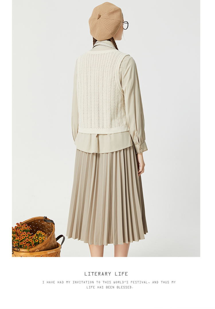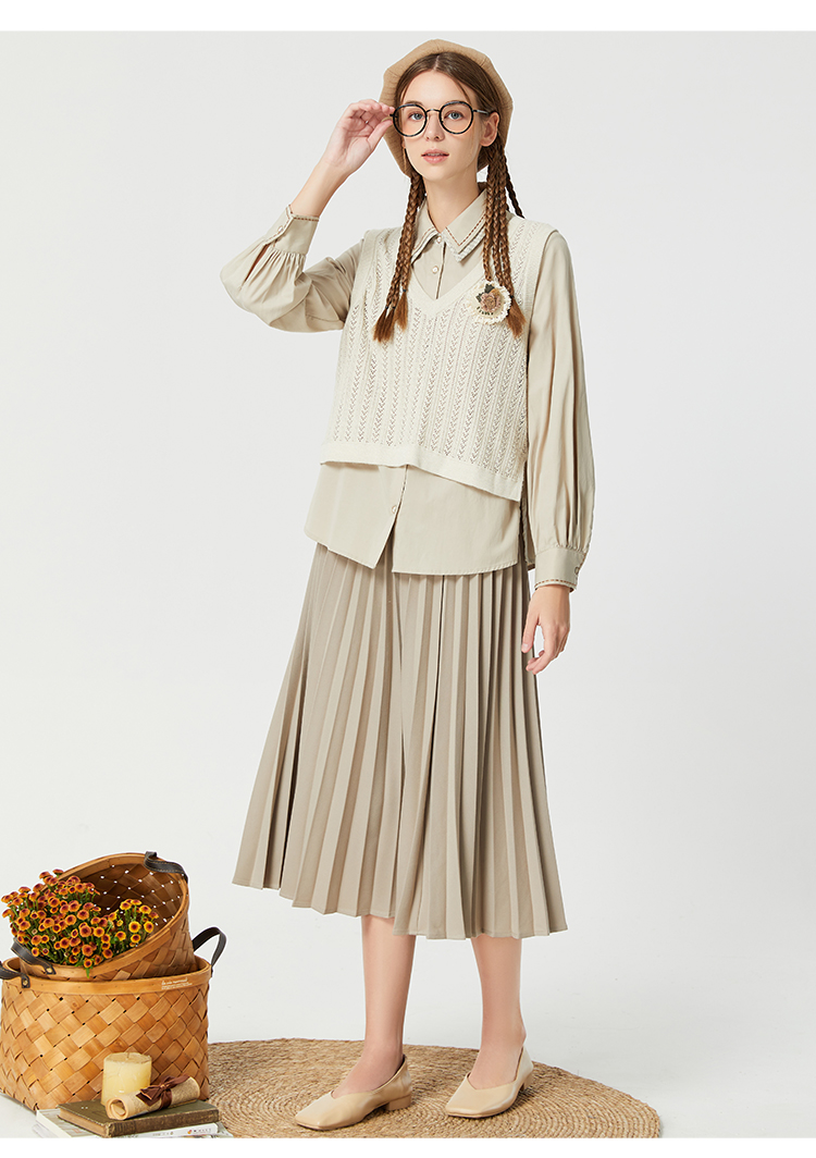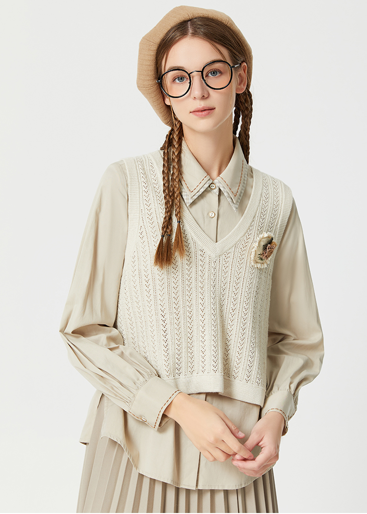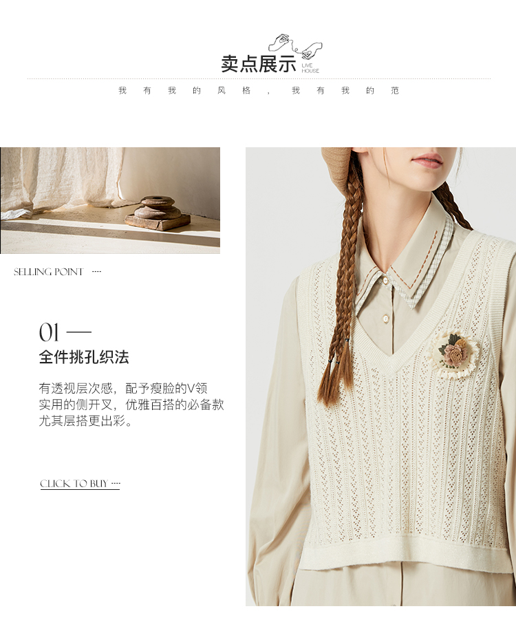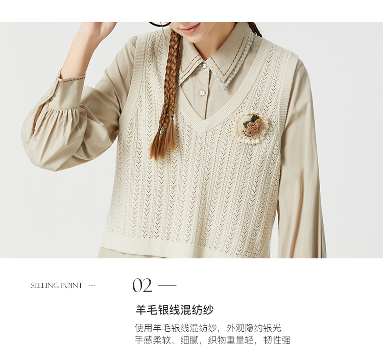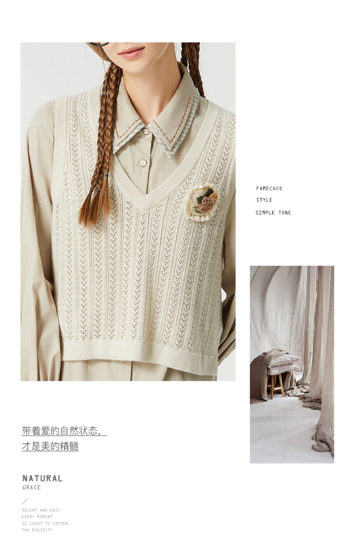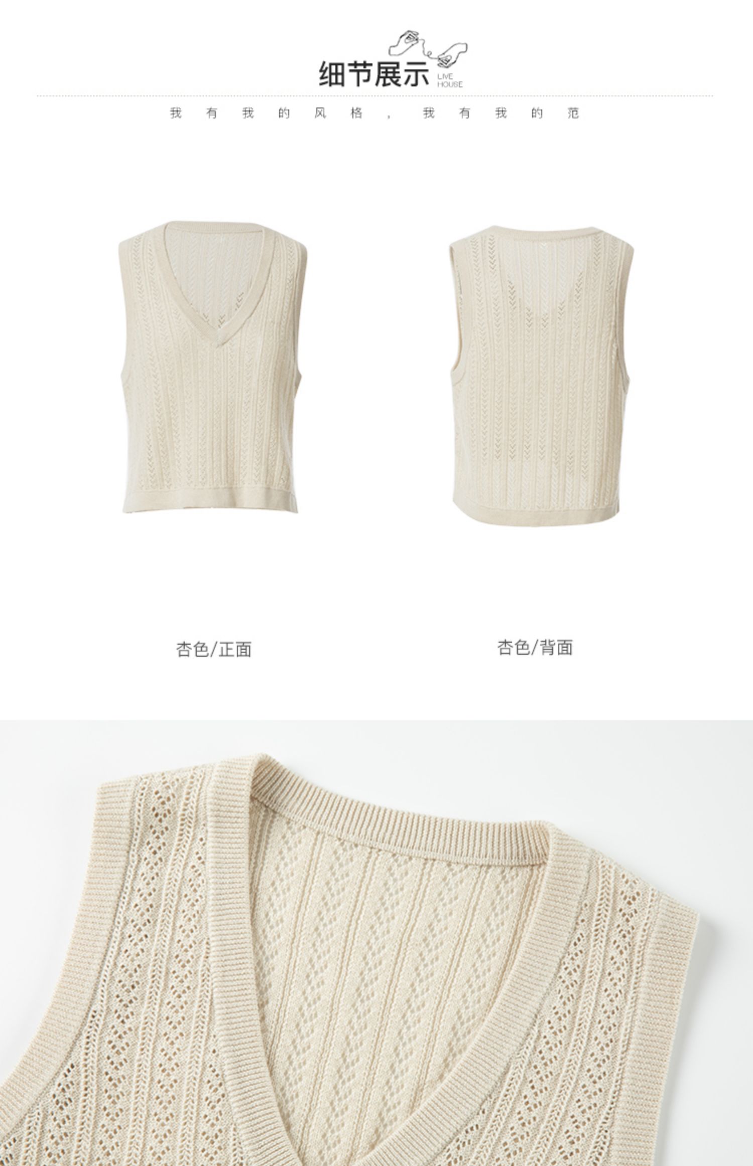 Famecoco范可儿钩花镂空毛衣背心马甲女早秋v领无袖针织马夹杏色F225CA013