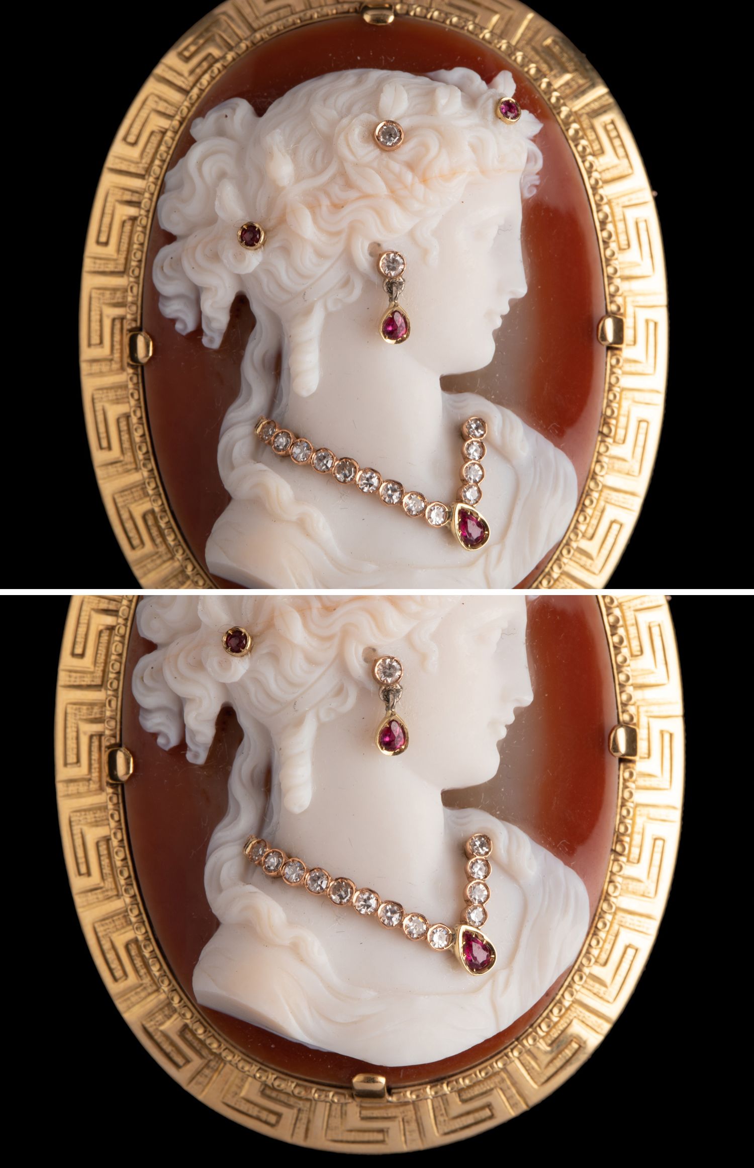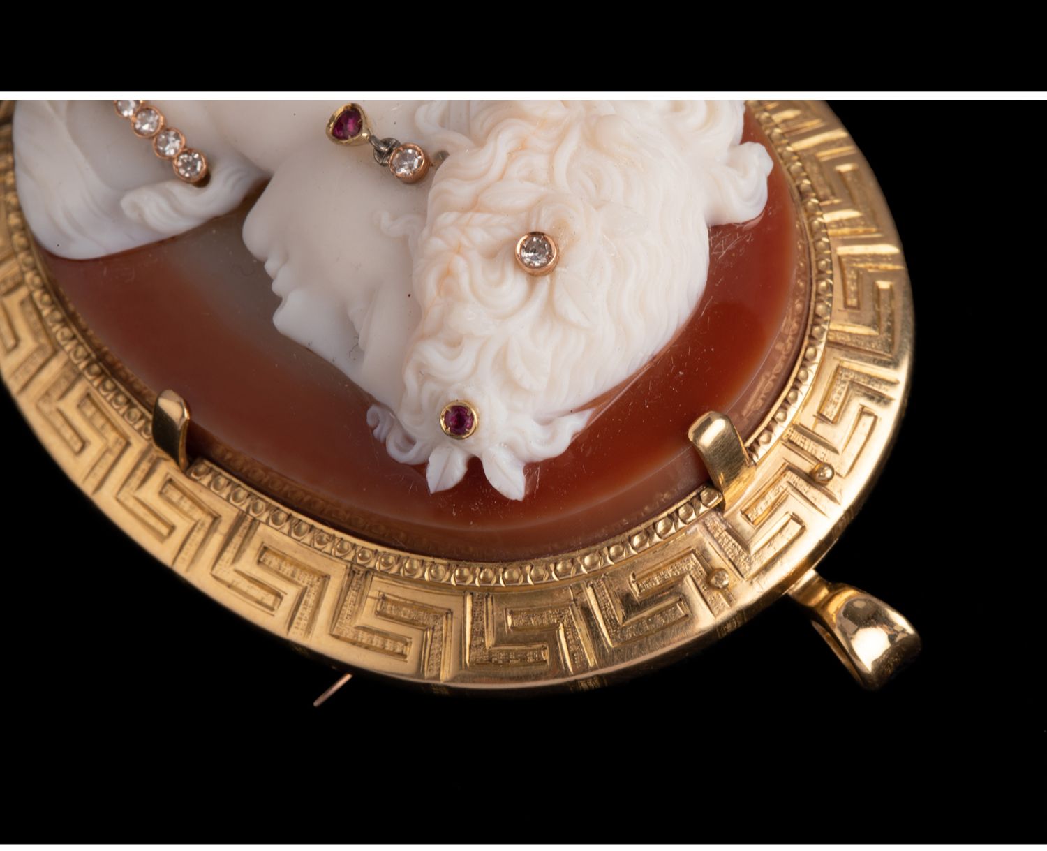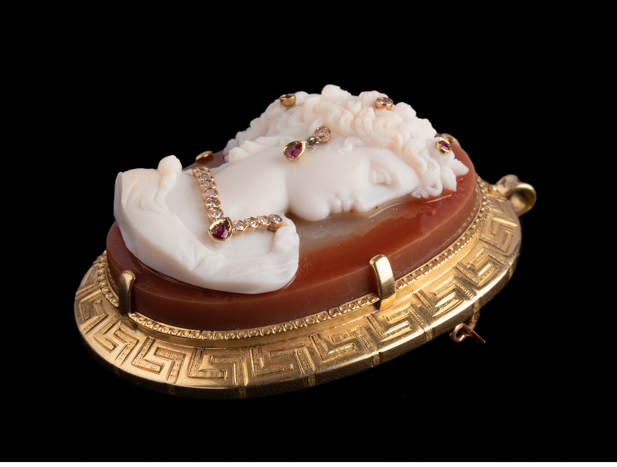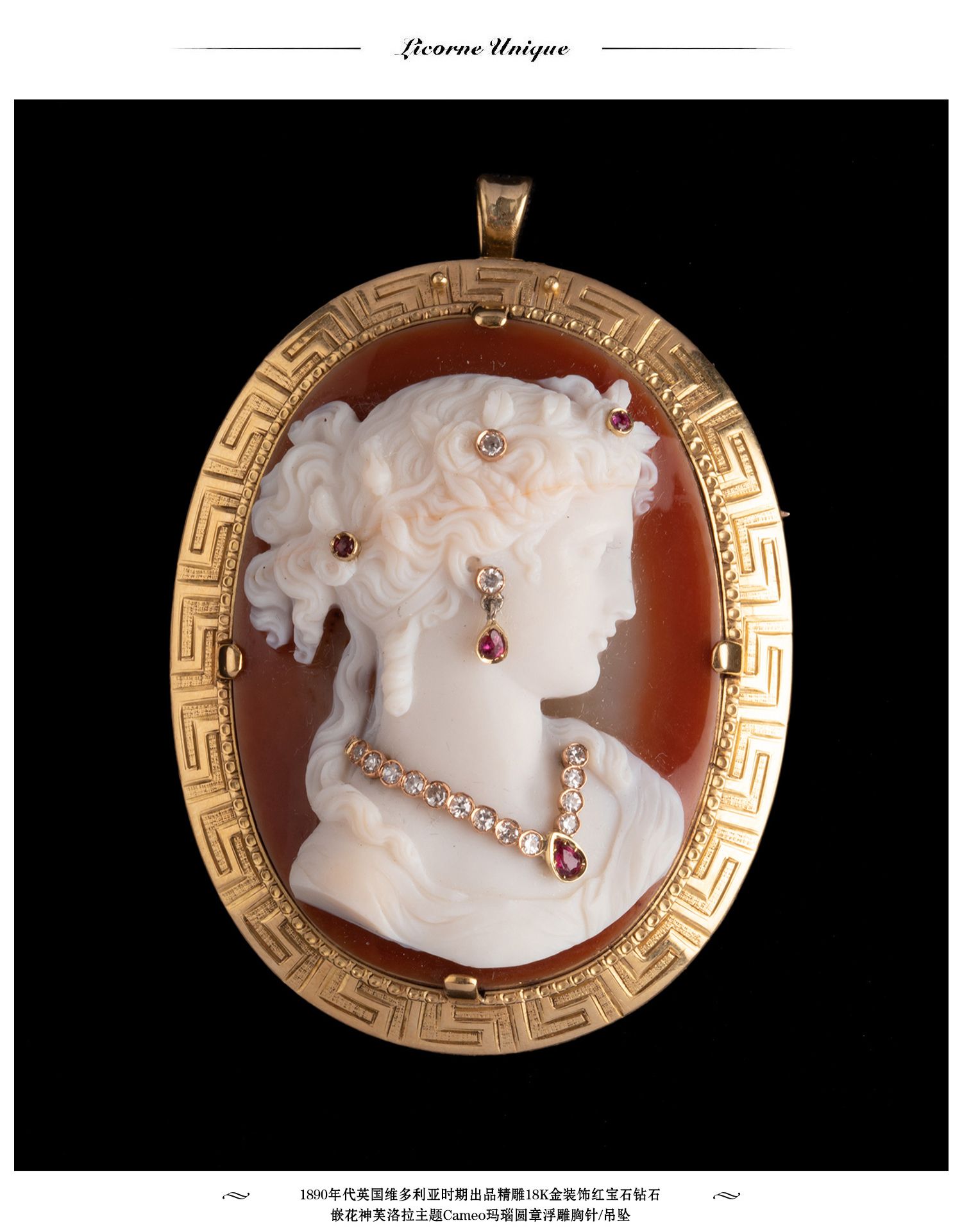 独角鹿西洋古董18K金红宝石钻石嵌Cameo卡梅奥玛瑙浮雕胸针吊坠