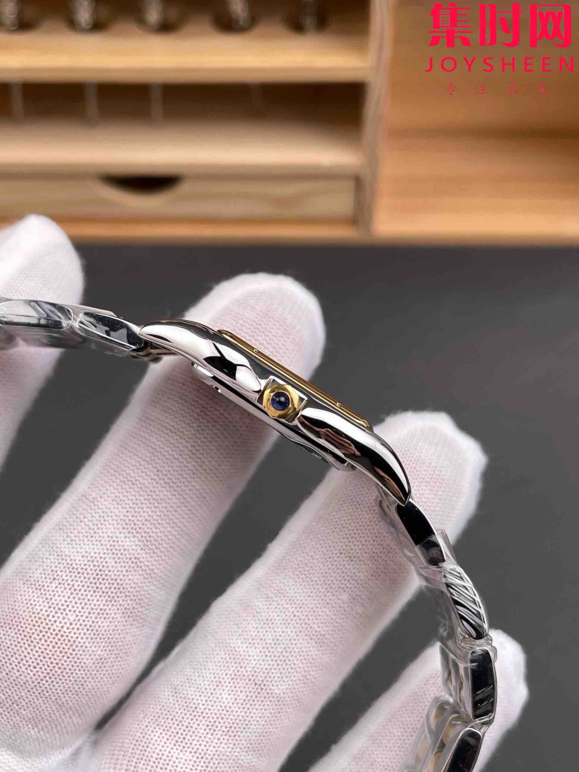 【表壳】表盘尺寸:小号27 x 37mm,方形表壳线条柔美,精美流线表耳,与表壳一体成型,魅惑动人。是Panthère猎豹所传达的美学风格。