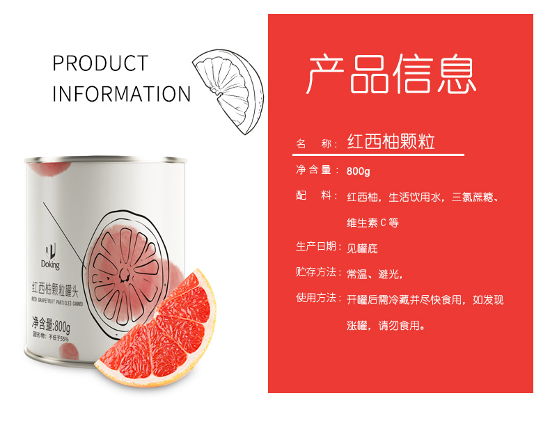 800g Doking 盾皇红西柚颗粒罐头 西柚颗粒红西柚饮料冲饮原料
