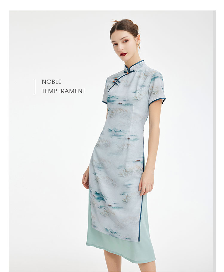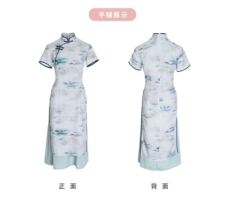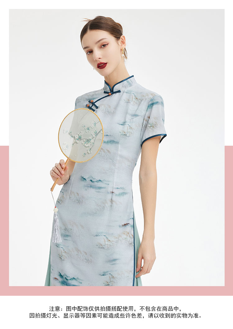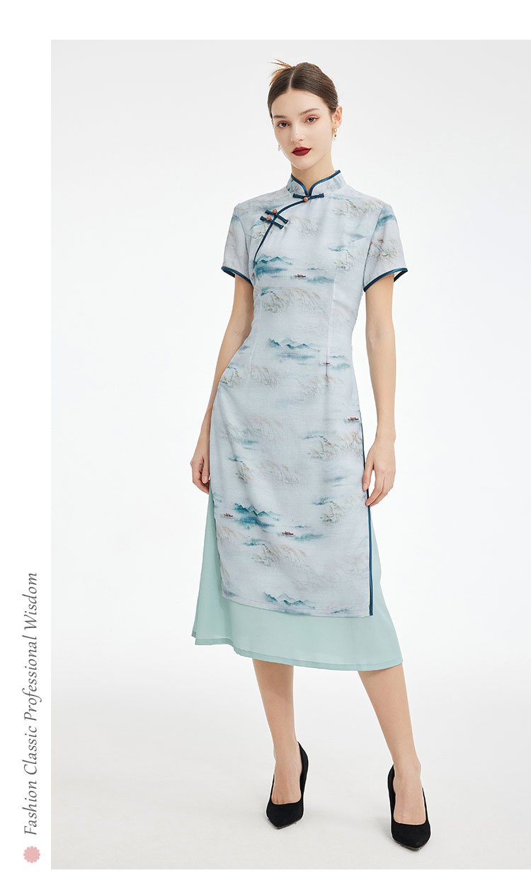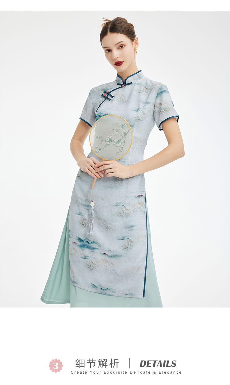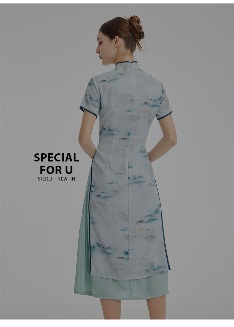 PF847斯尔丽2024新款新国风改良版奥黛旗袍式水墨画气质高雅连衣裙