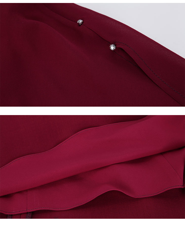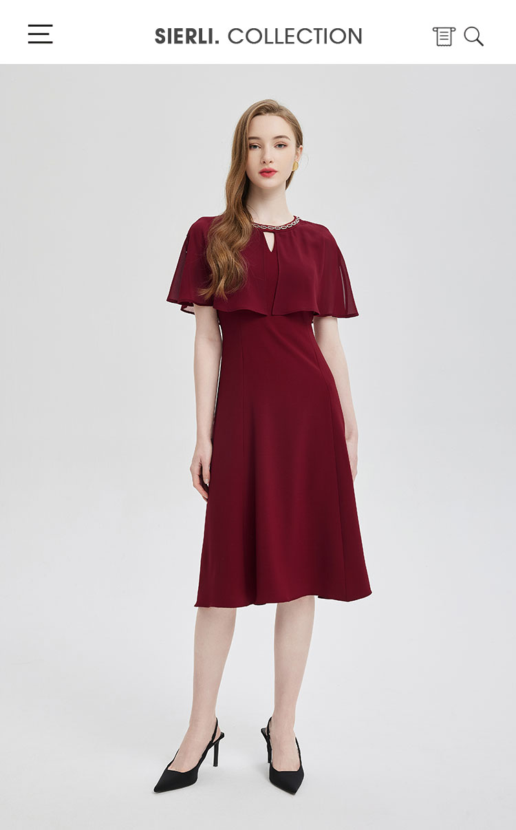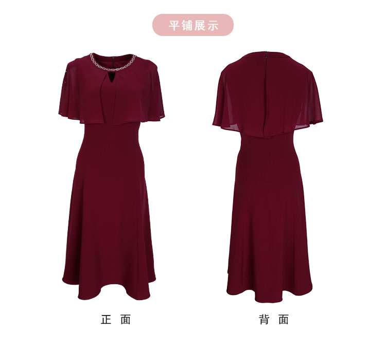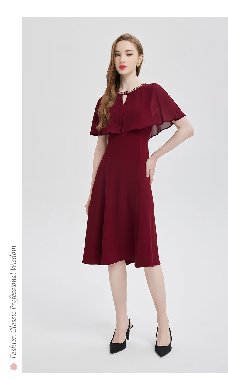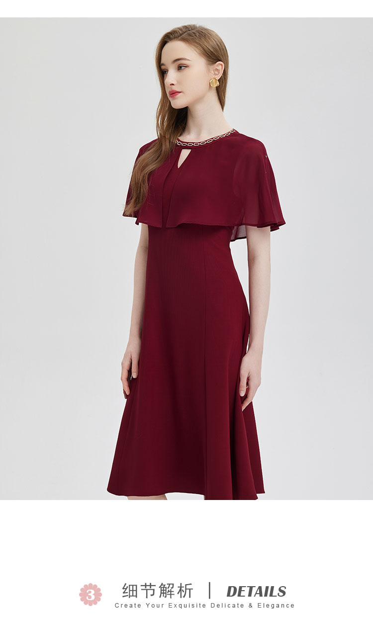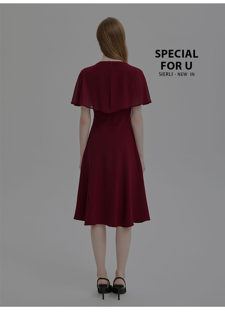 PF803斯尔丽24新款设计感斗篷式雪纺飘逸收腰放摆圆领镶钻连衣裙