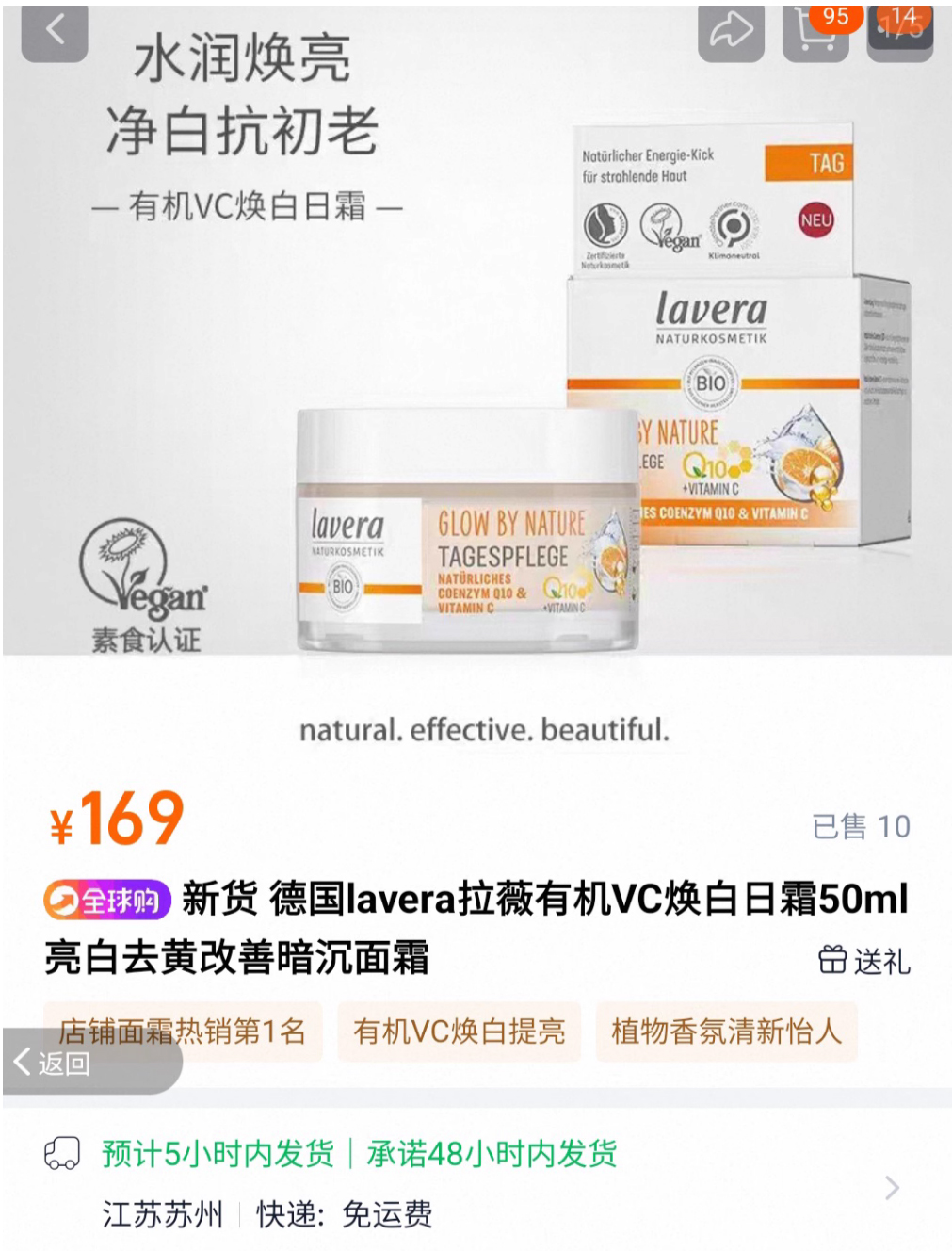 【品名】德国拉薇有机天然VC焕白日霜面霜 50ml/VC精华30ml