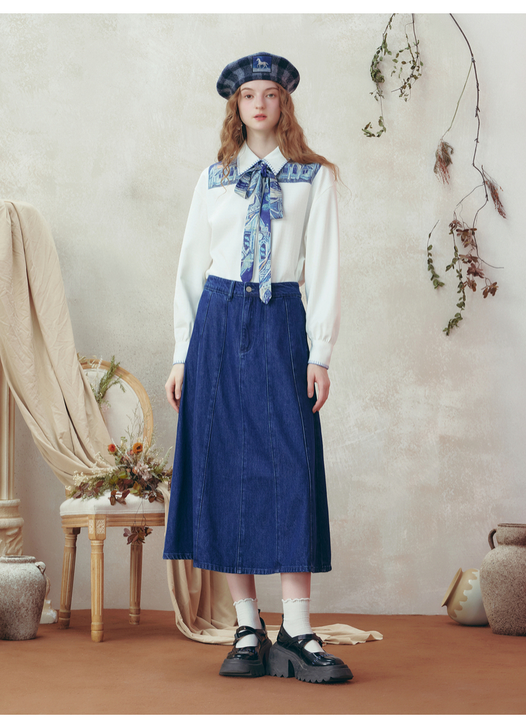 两三事一人相伴 春夏新款时尚单边背带裙系扣高腰牛仔半身裙S23CKB050