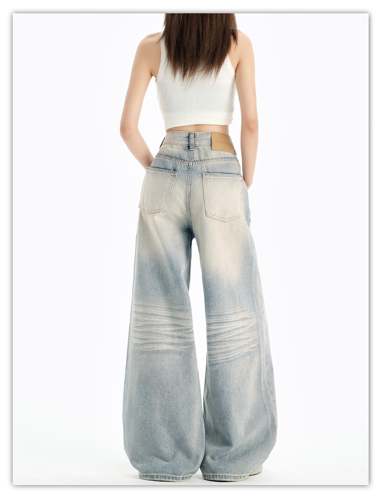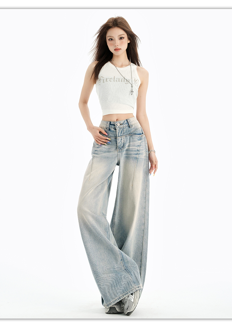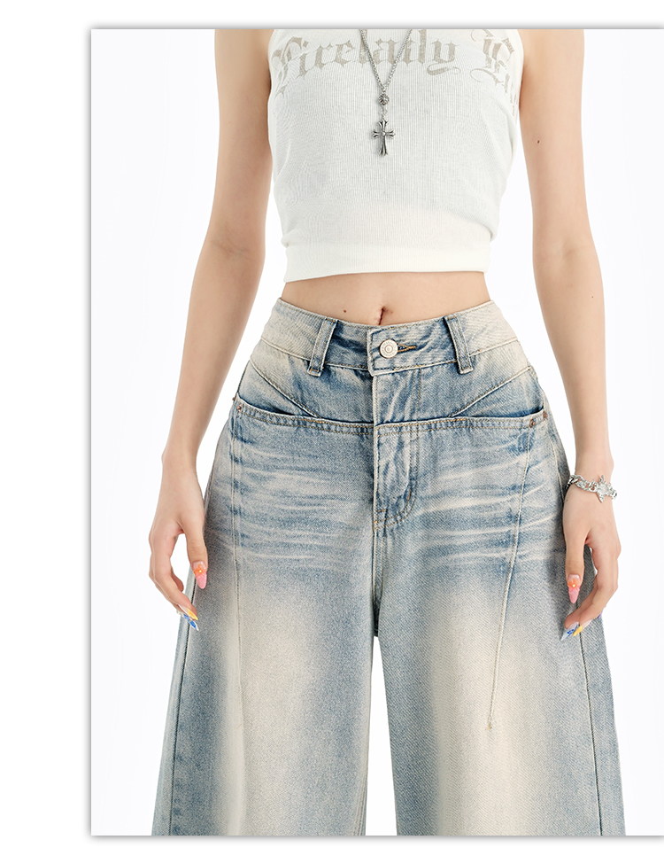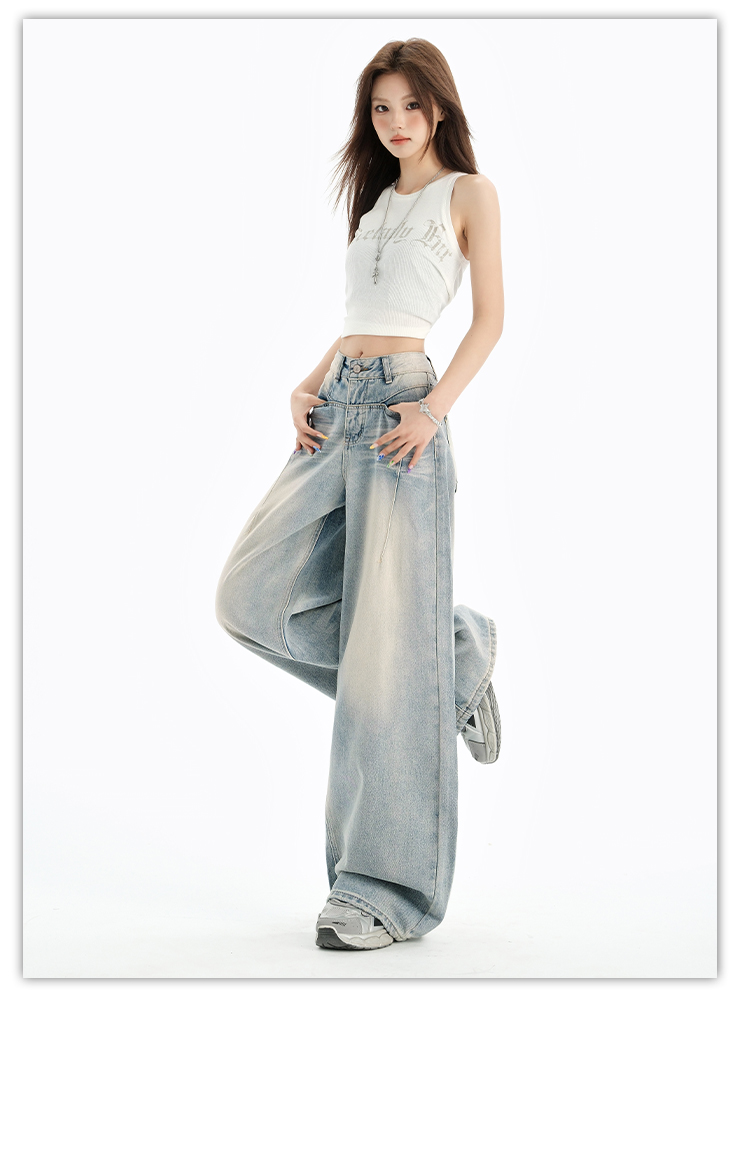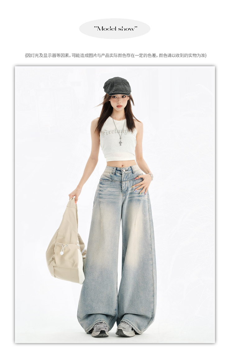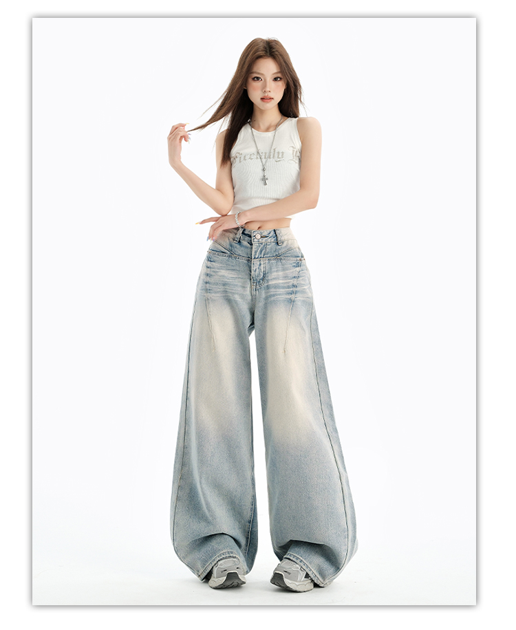 罗蒙女士高腰显瘦阔腿九分牛仔裤长裤休闲通勤百搭宽松女长裤