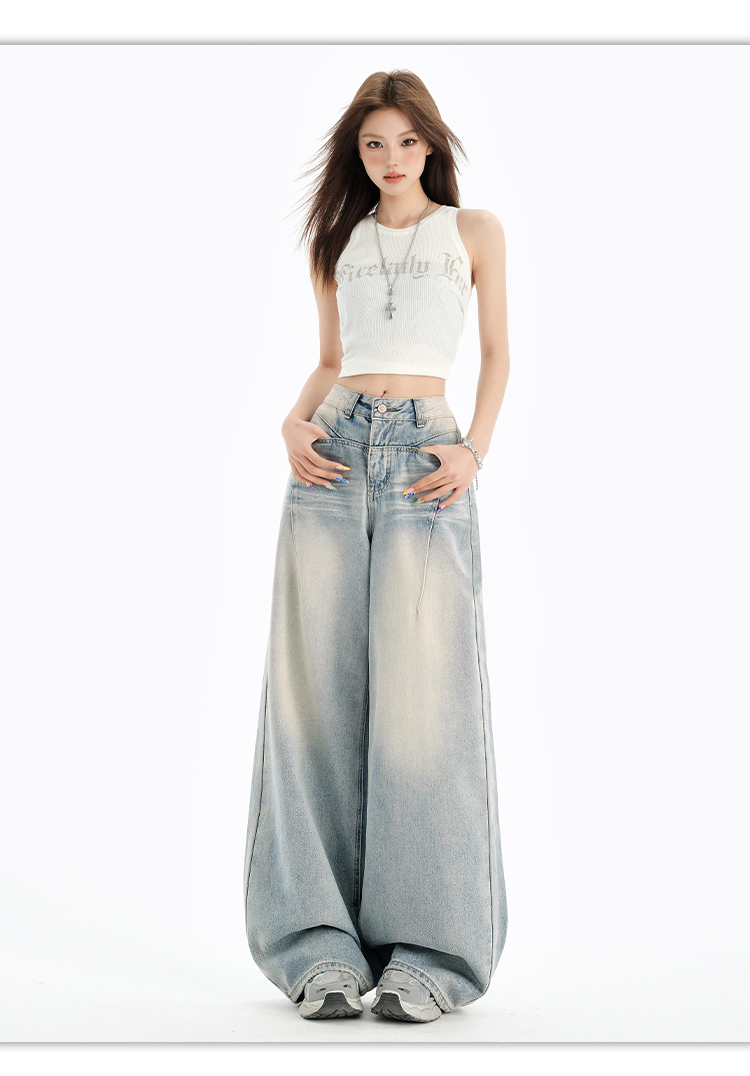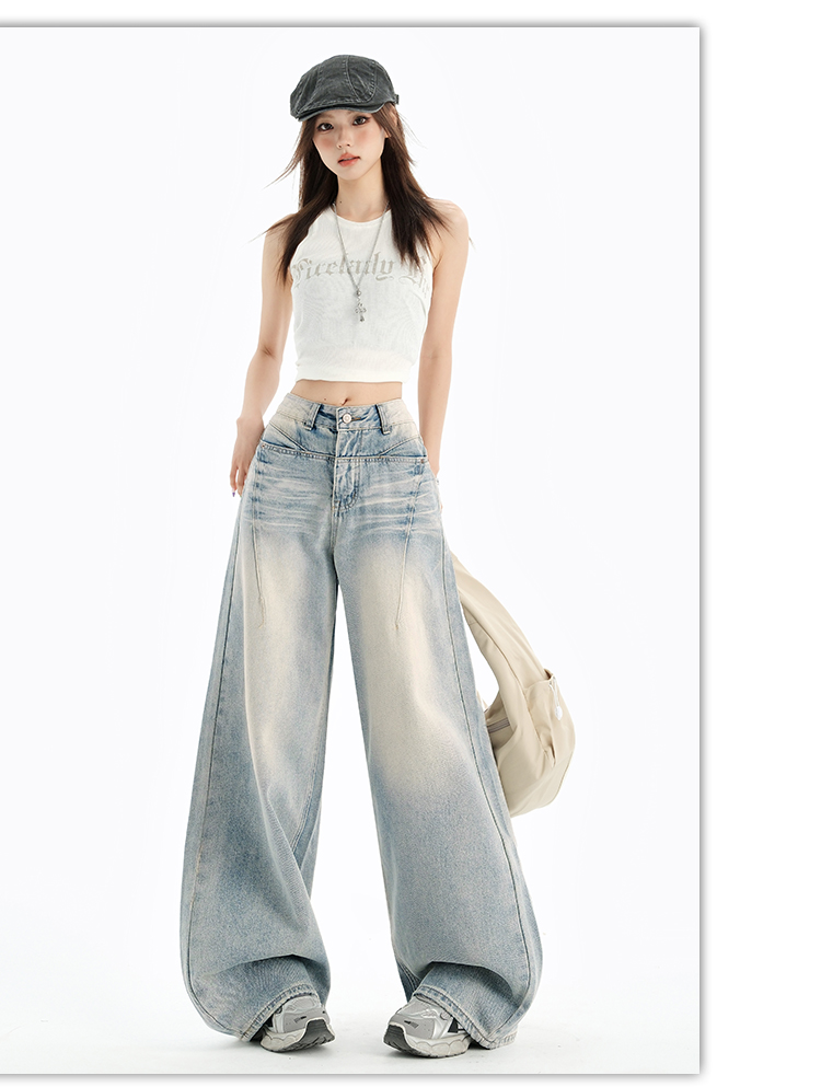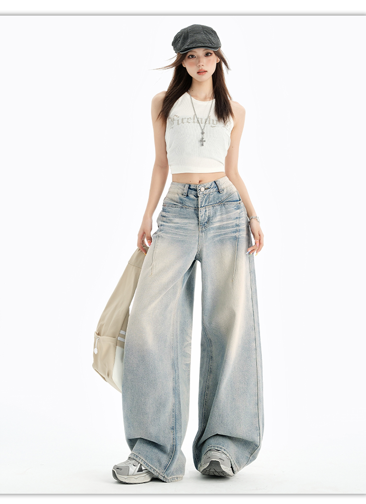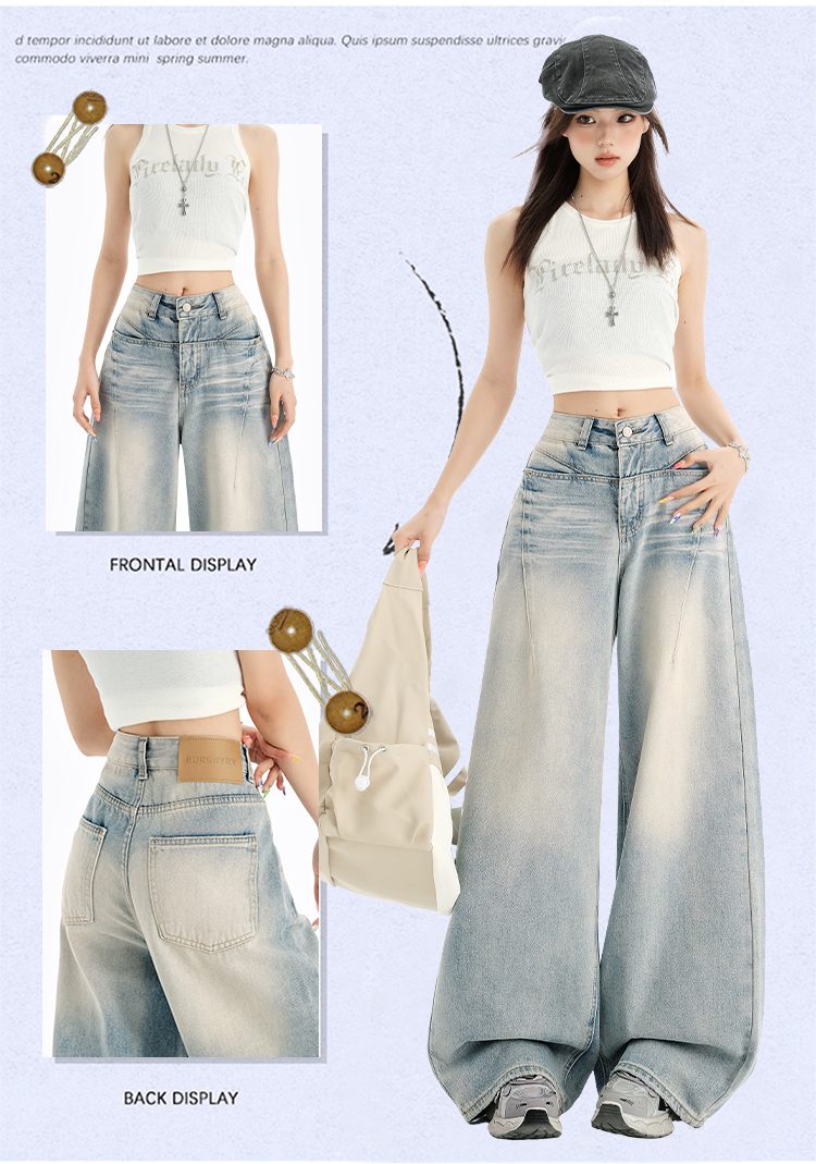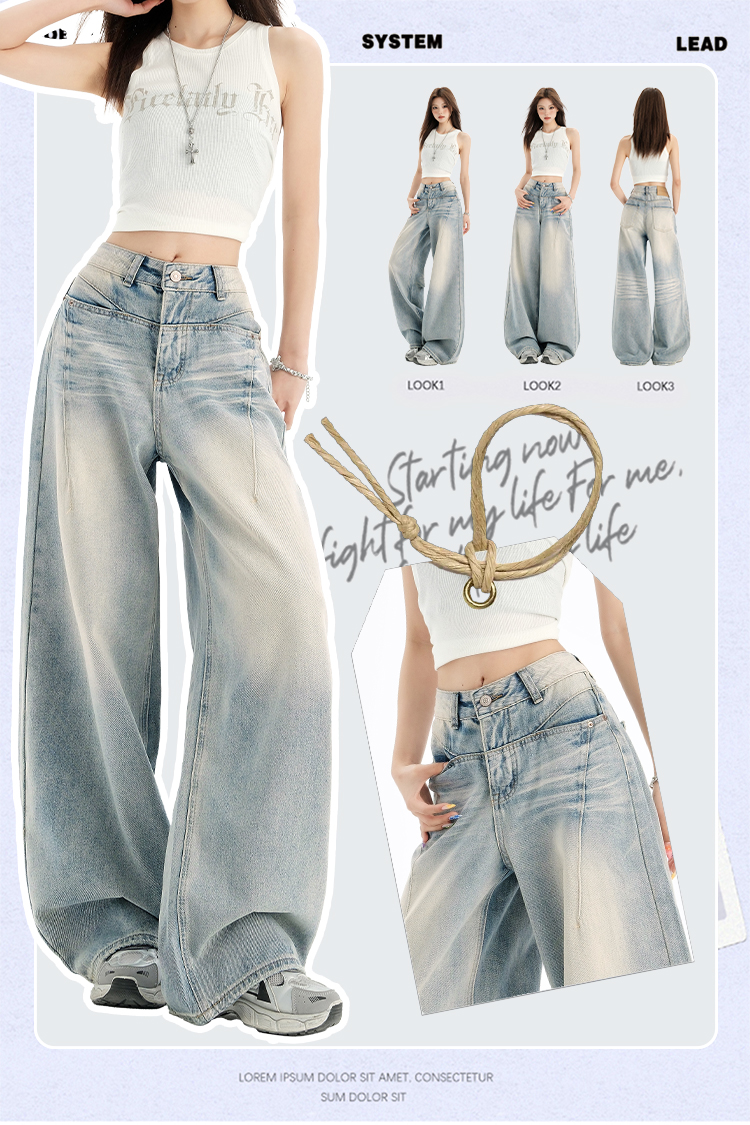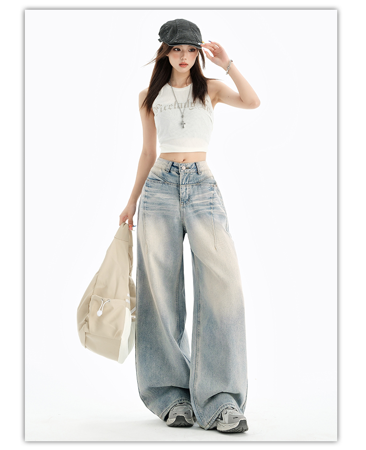 罗蒙女士高腰显瘦阔腿九分牛仔裤长裤休闲通勤百搭宽松女长裤