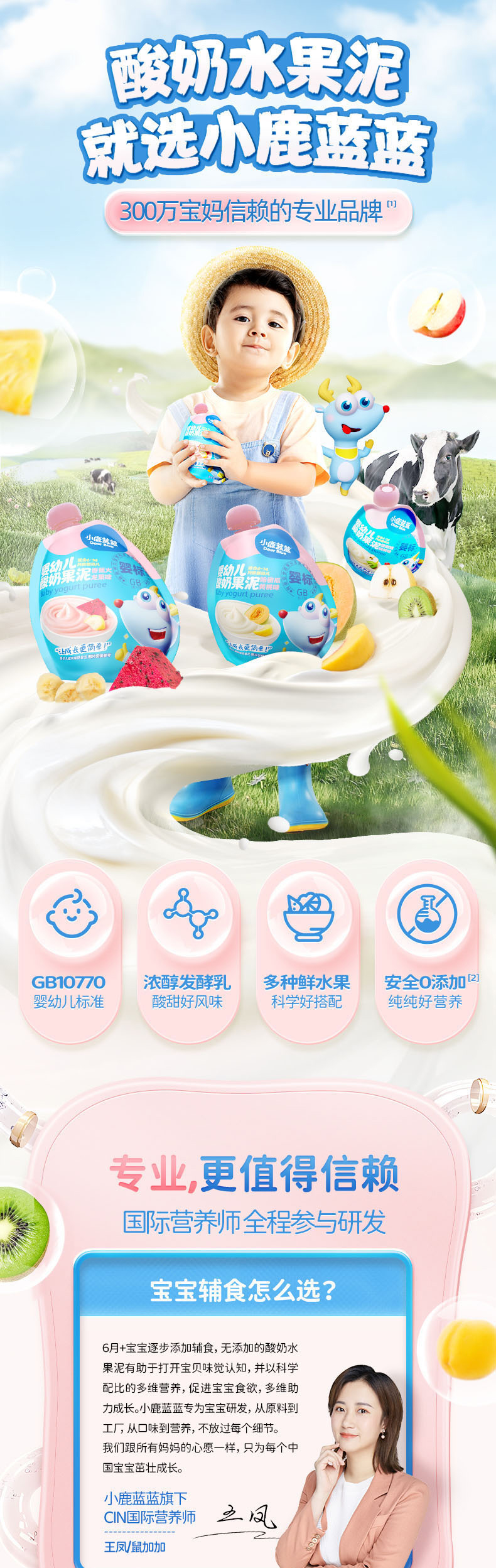 - 小鹿蓝蓝始终致力于为主人提供更优质、高性价比的产品、服务和体验,共同打造婴童零食生态圈,提升母婴行业的国货自信,守护和陪伴新一代儿童健康、快乐地成长。