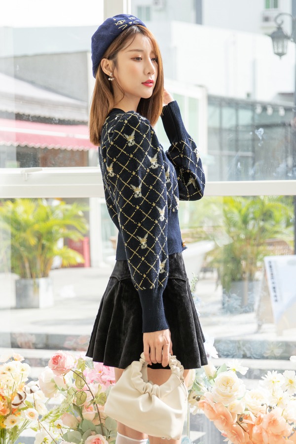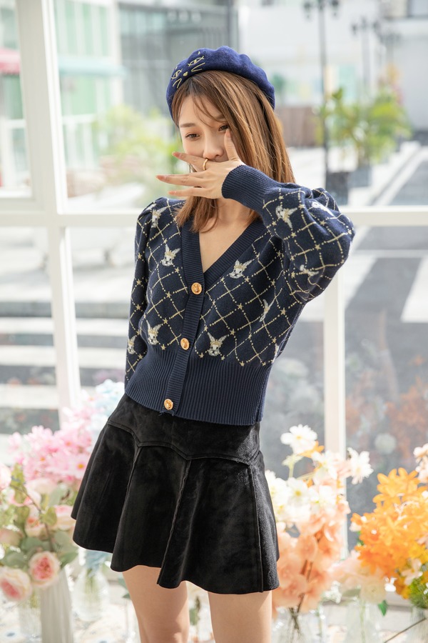 Stay2Weeks 复古格纹兔头V领菱形提花针织衫 14375