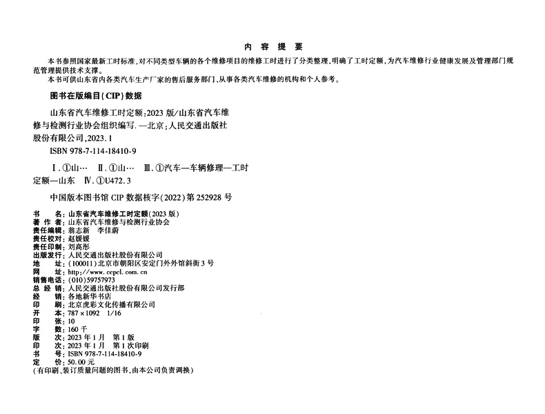 书名:山东省汽车维修工时定额(2023版)