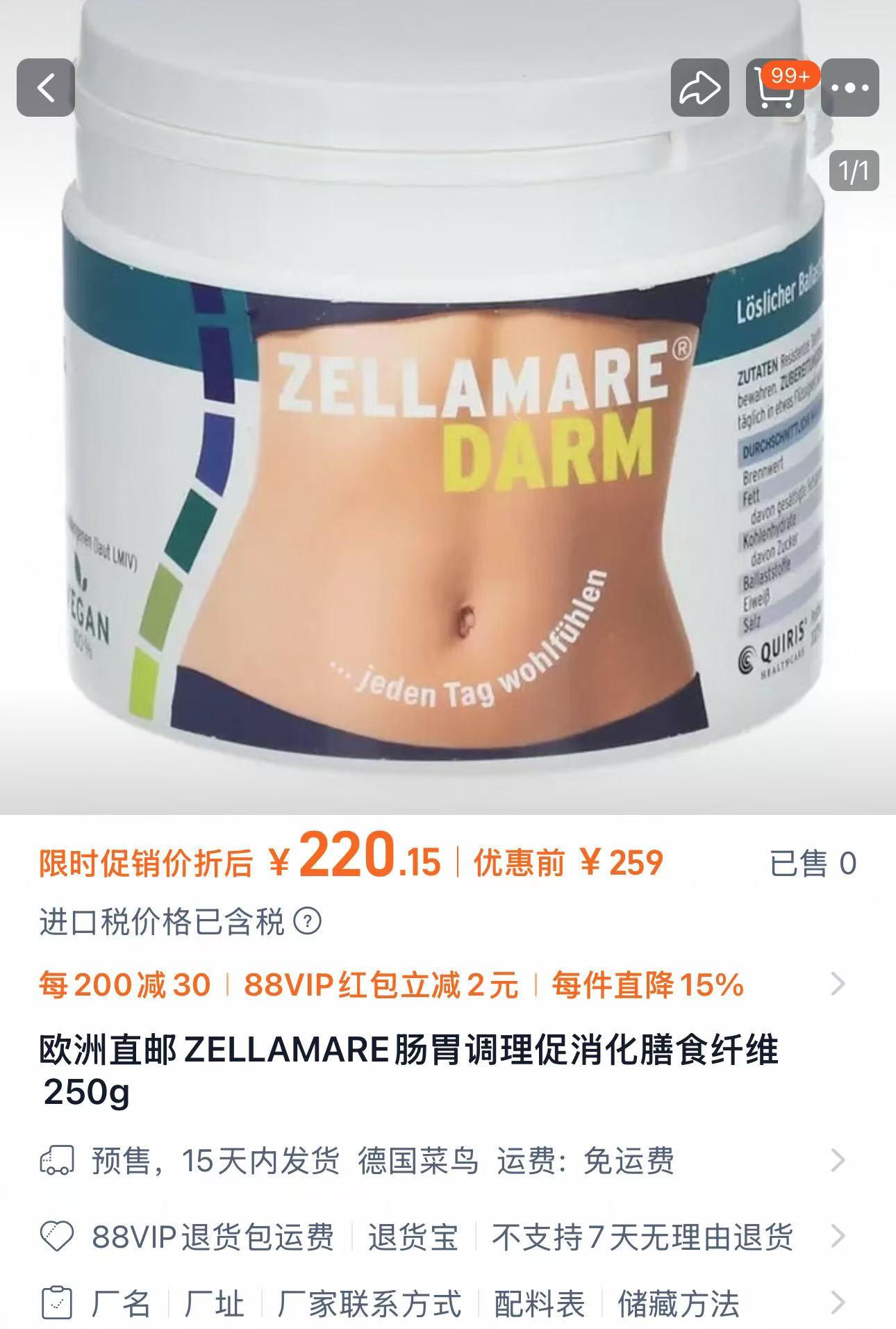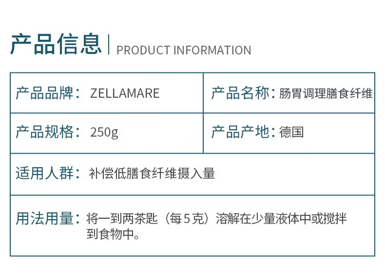 【品名】德国ZELLAMARE肠胃调理促消化膳食纤维250g