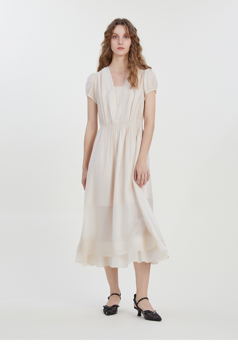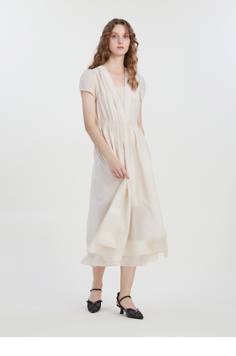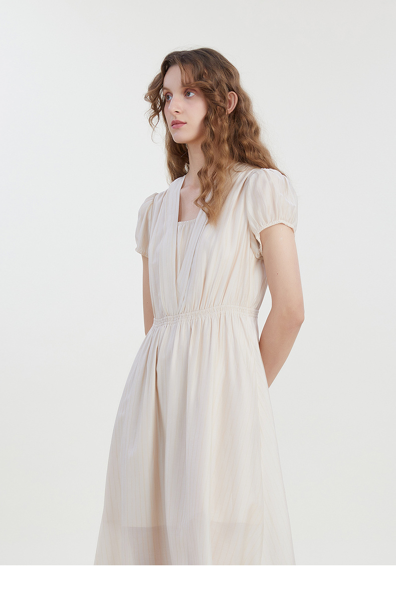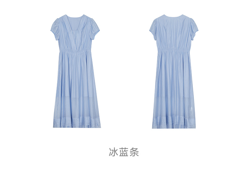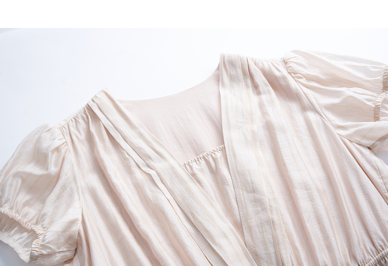 谜底V领连衣裙短袖2023夏款时尚气质泡泡袖收腰长裙短袖232ML0519
