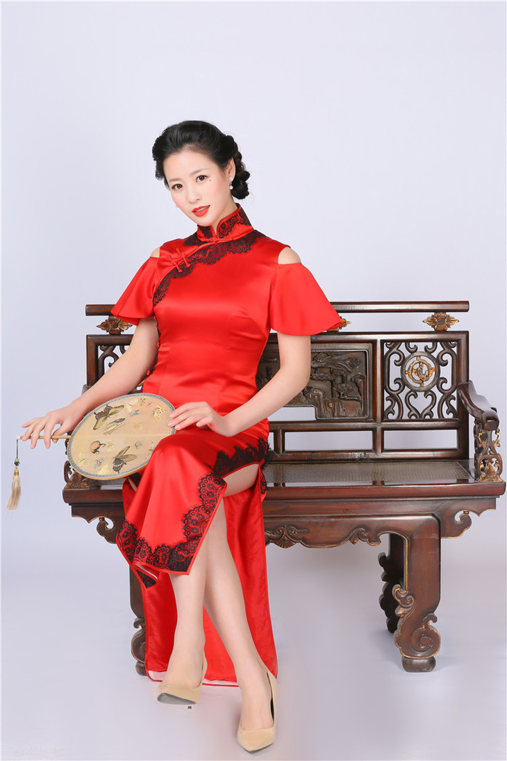 荷言HEYEN 霜叶红 重磅真丝+手工盘扣+撞色蕾丝+露肩荷叶袖手工旗袍