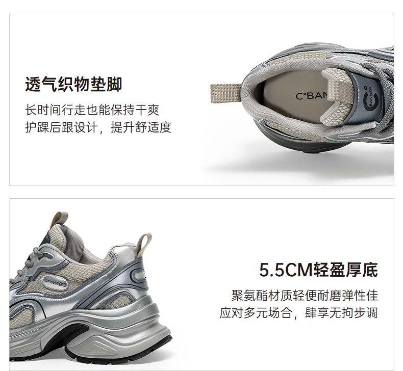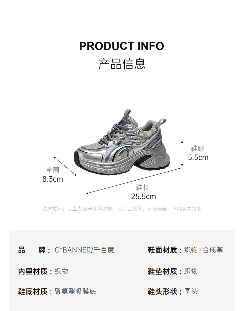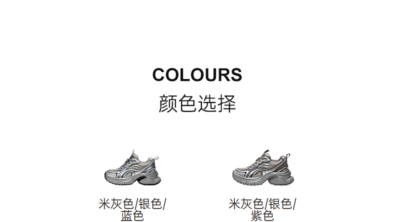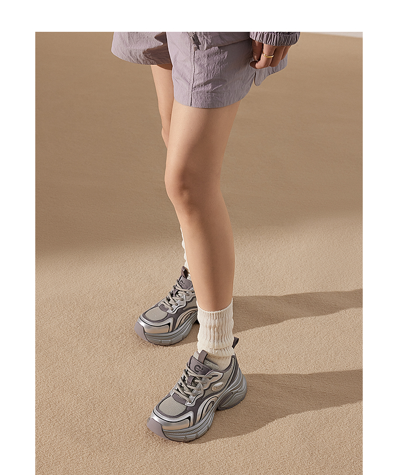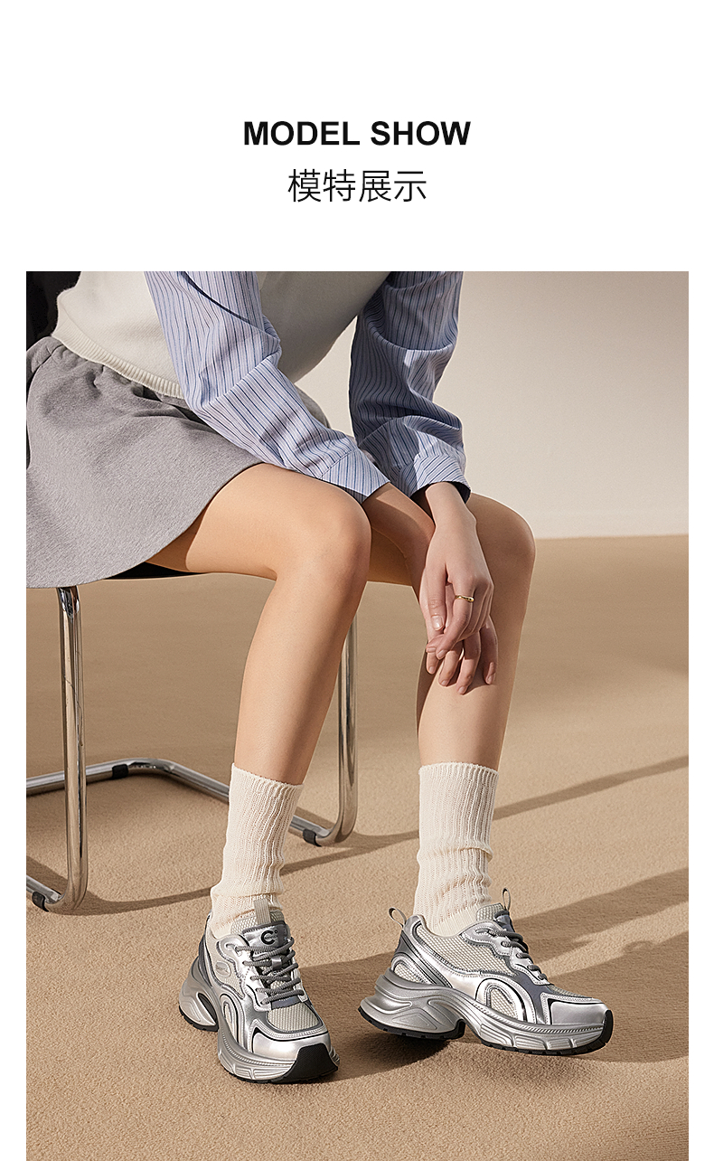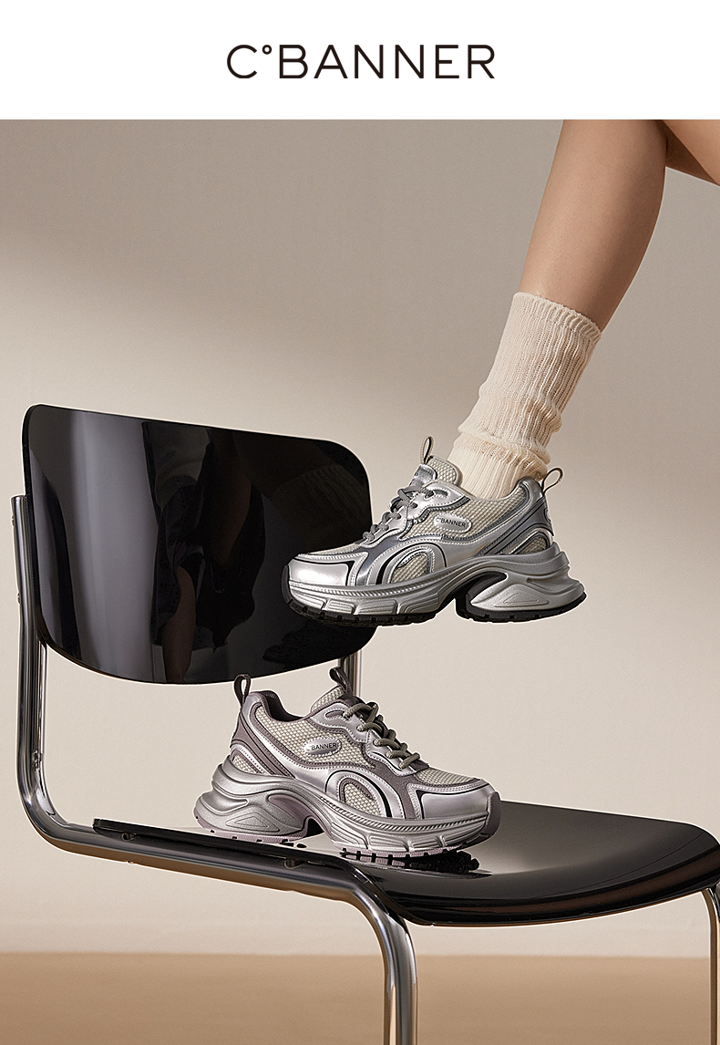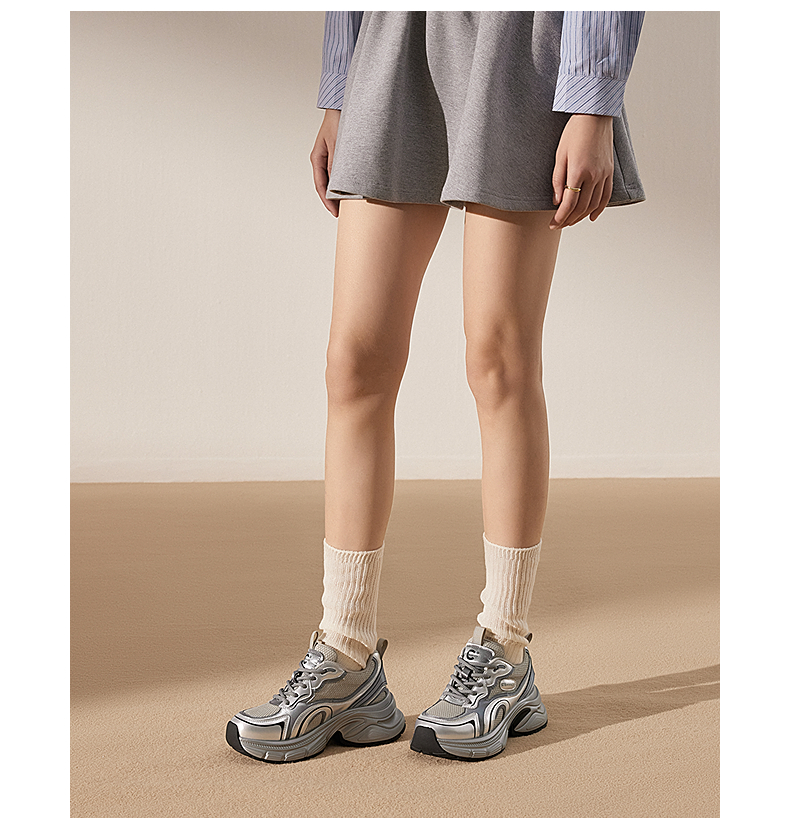 千百度银色厚底老爹鞋女款时尚休闲鞋网面透气运动鞋A25188863
