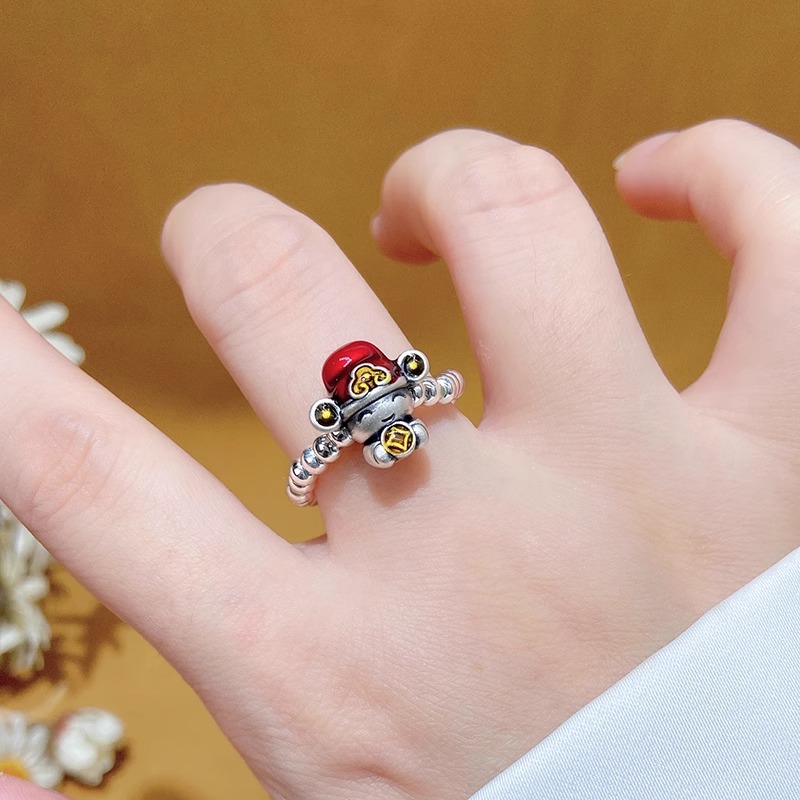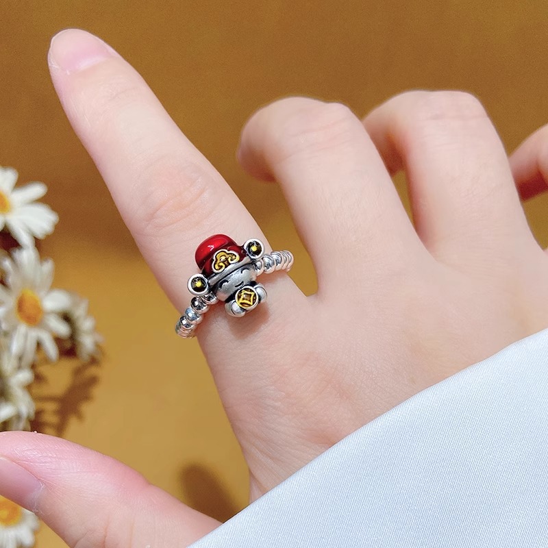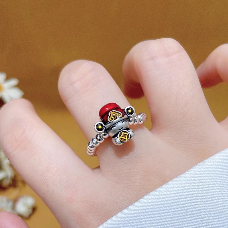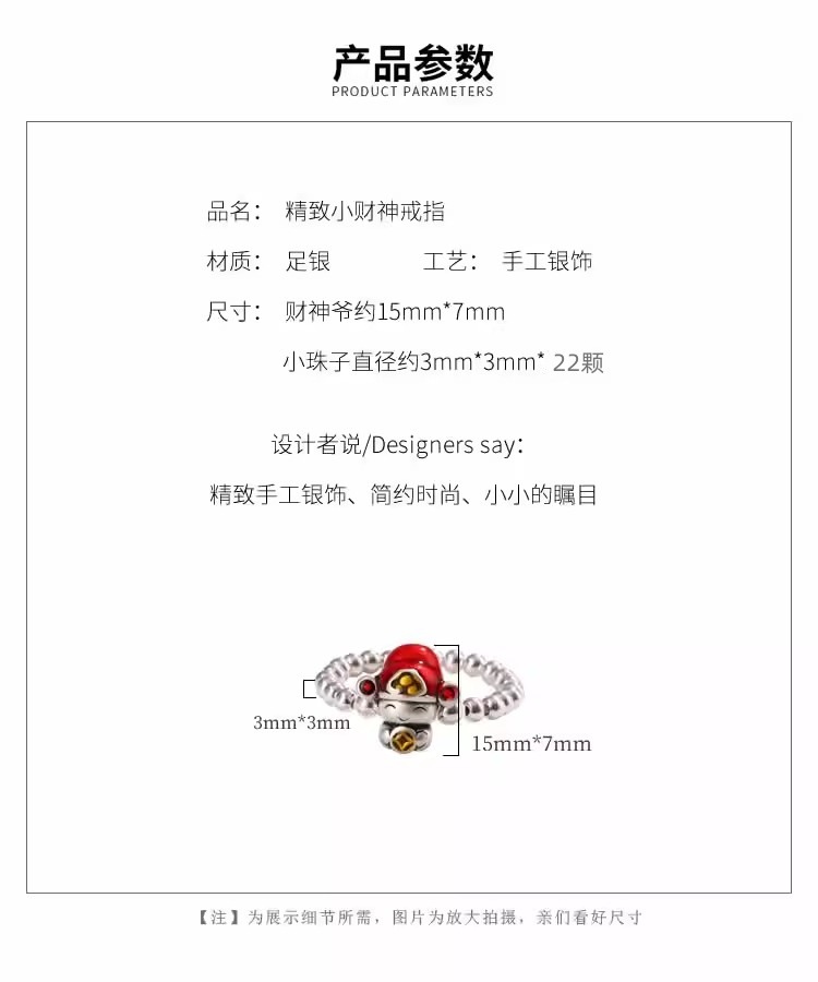 足银999财神爷戒指环情侣款 小银珠戒指 新中式国风纯银珠戒指 复古礼物