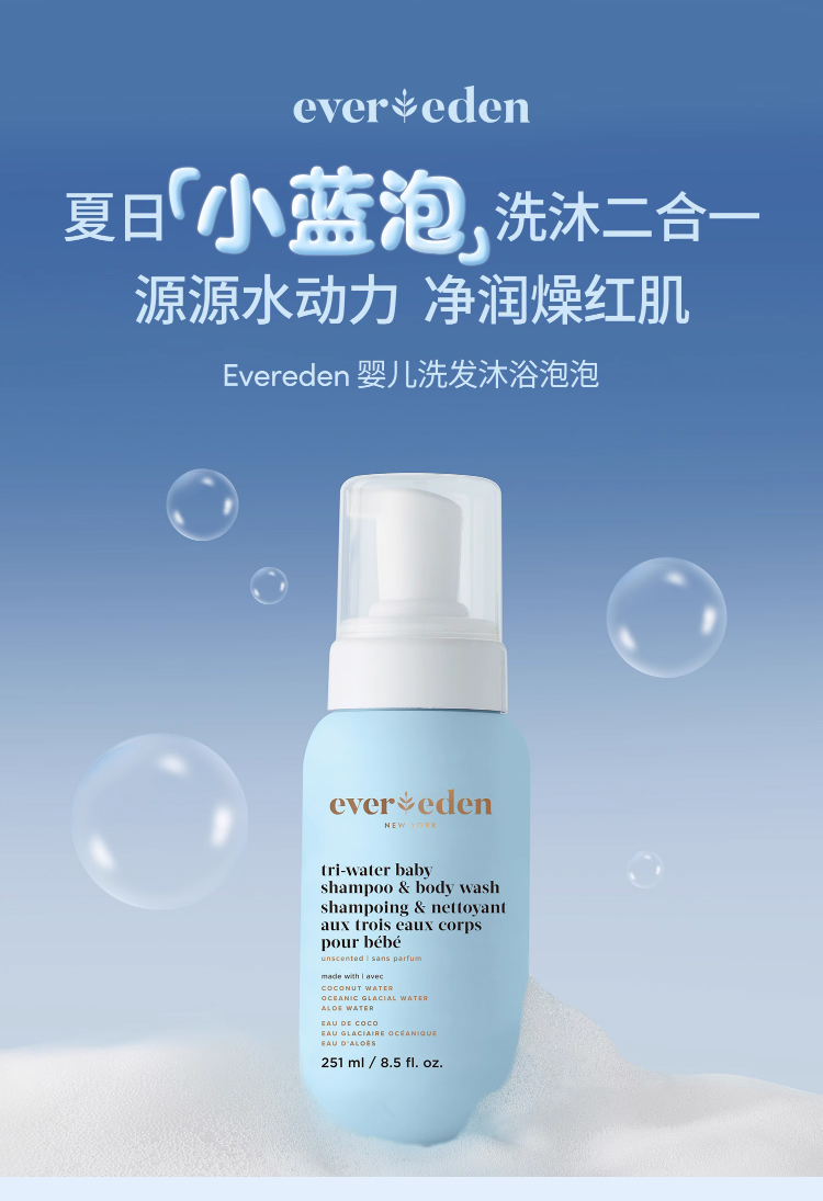 像在夏天,孩子皮肤出汗多出疹子,或者被暴晒后,洗澡的时候,水温稍微热一些,就会觉得不舒服。而小蓝这款洗发沐浴泡泡,在配方中添加了地中海山脉珍稀的小球藻精粹,涂抹在皮肤上,可以瞬间舒缓皮肤晒后的泛红和刺痒感。